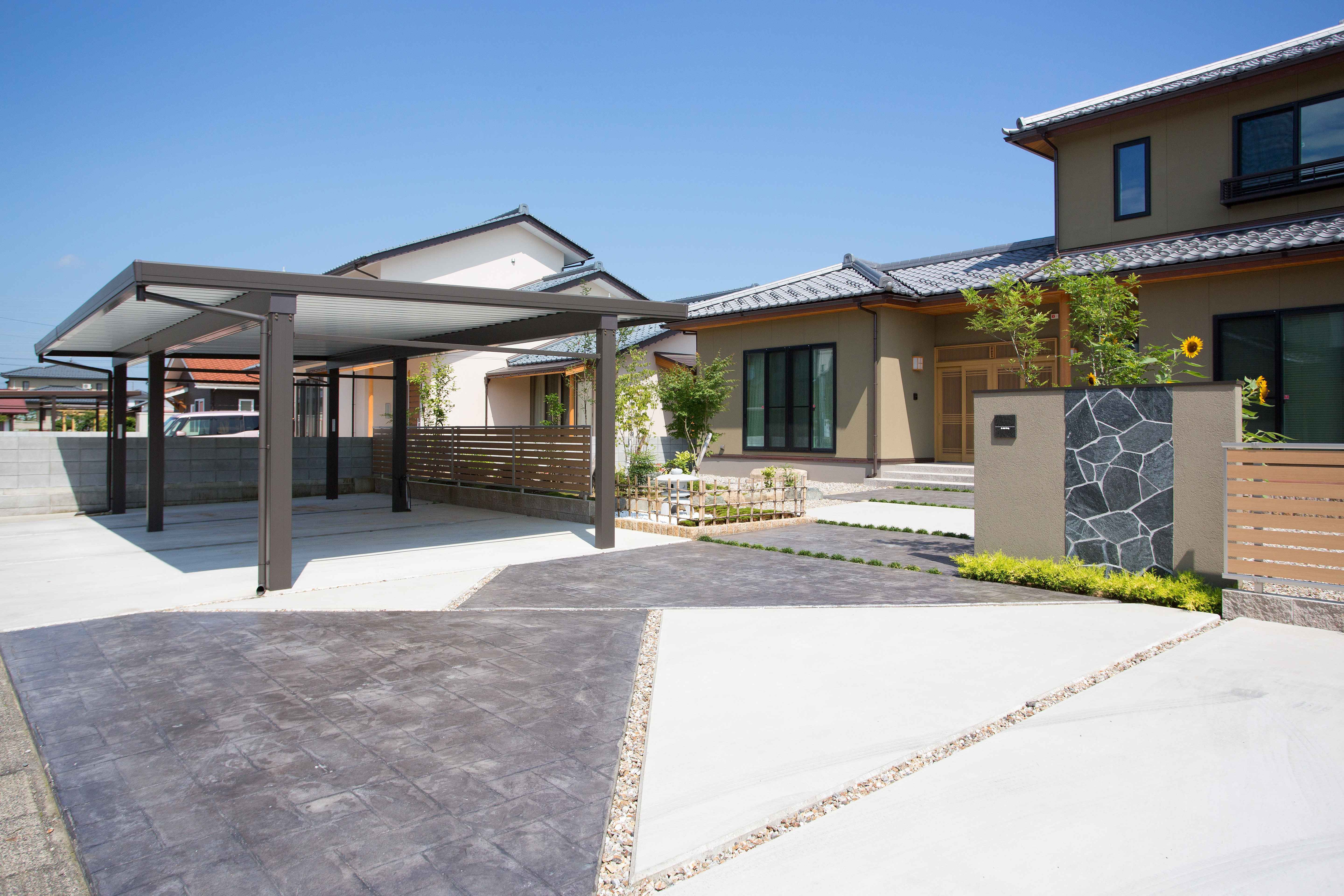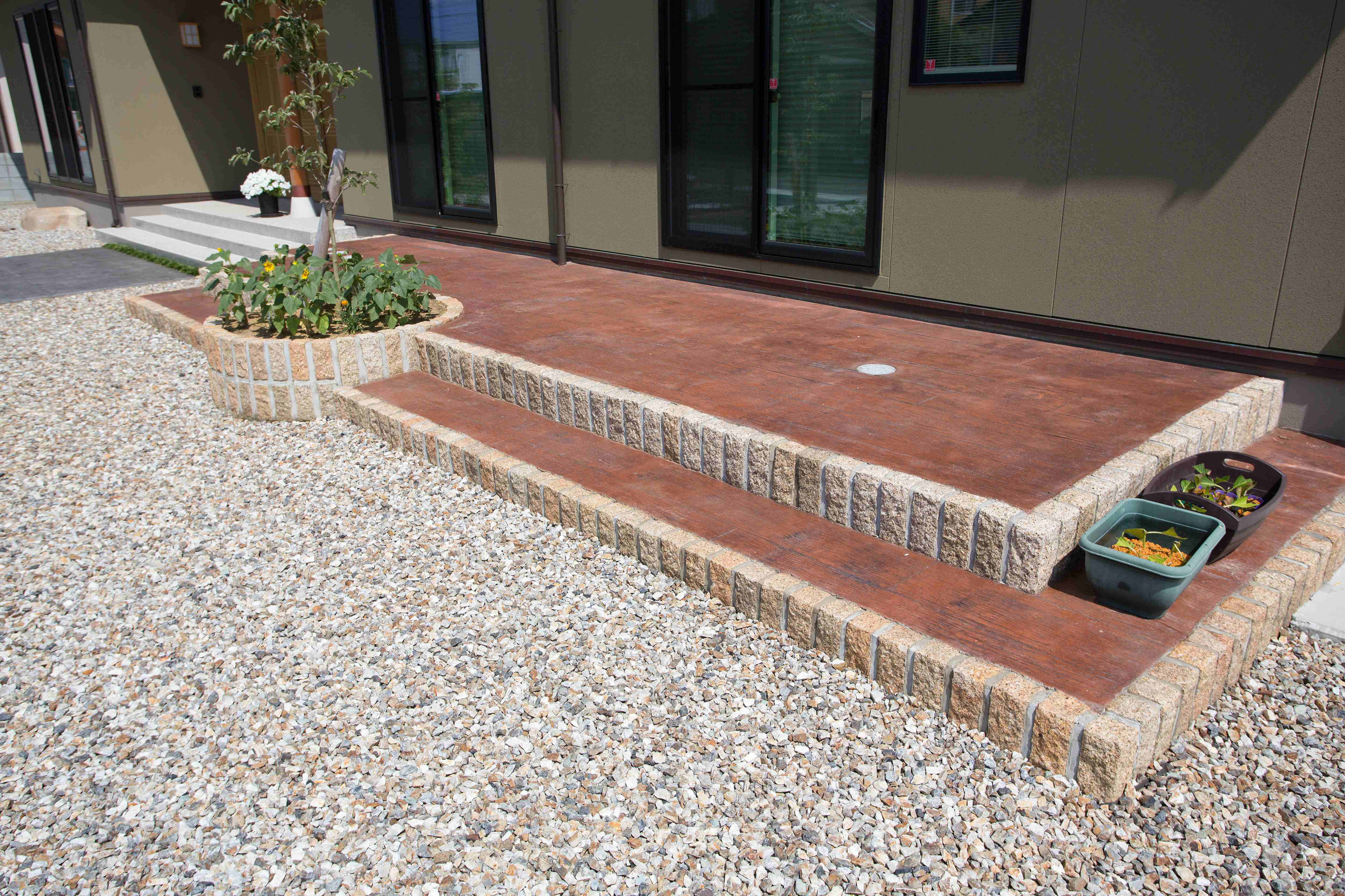 モニュメントはベージュ色の塗り壁に東洋工業オークルストーン乱張りでデザイン。