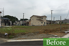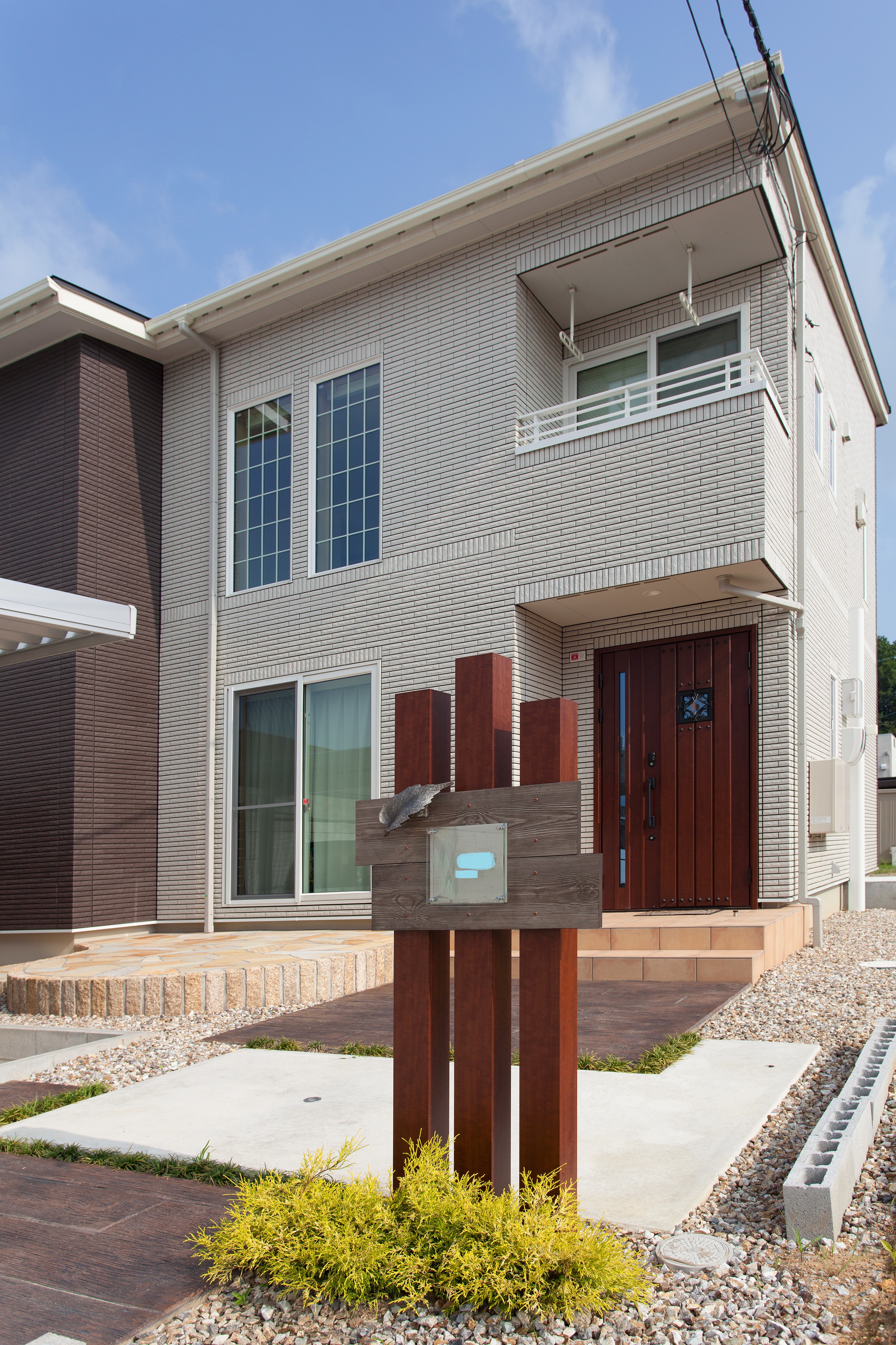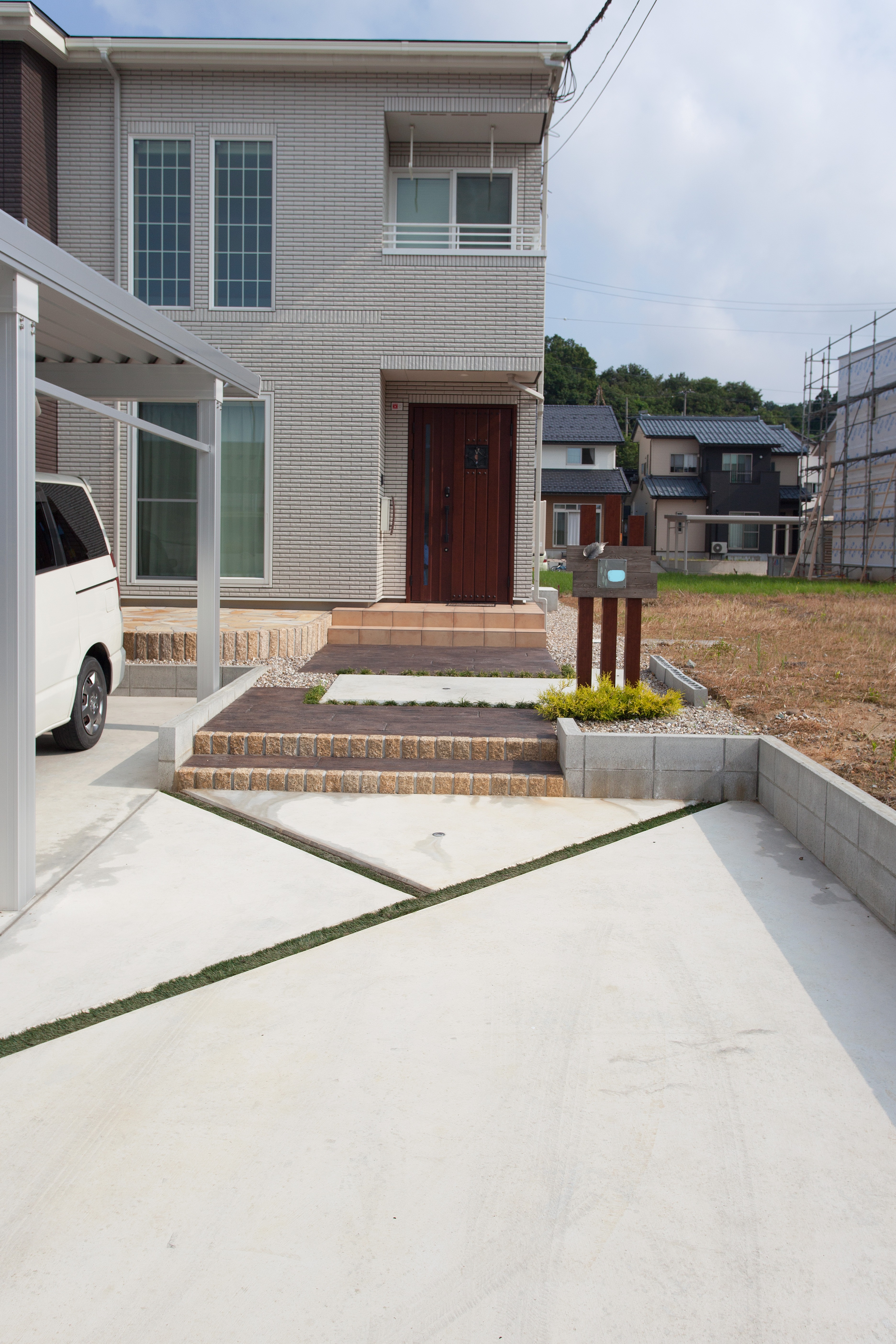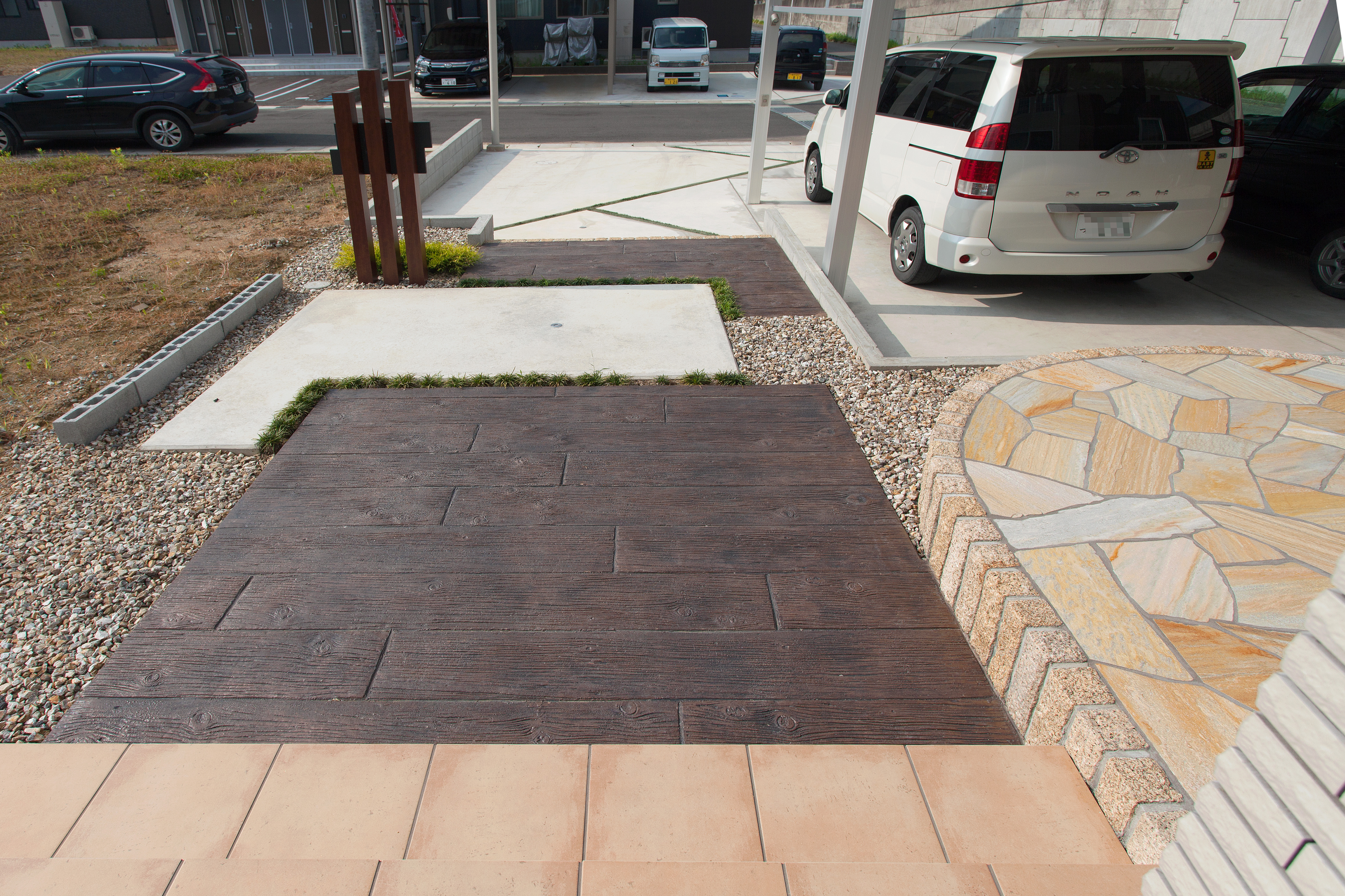 玄関横に設置された石貼りのテラスは、曲線が美しく周りをぷピンコロいで囲い、自然な仕上がりに。開放感がありながら、視線が気にならないトータル外構が完成しました♪