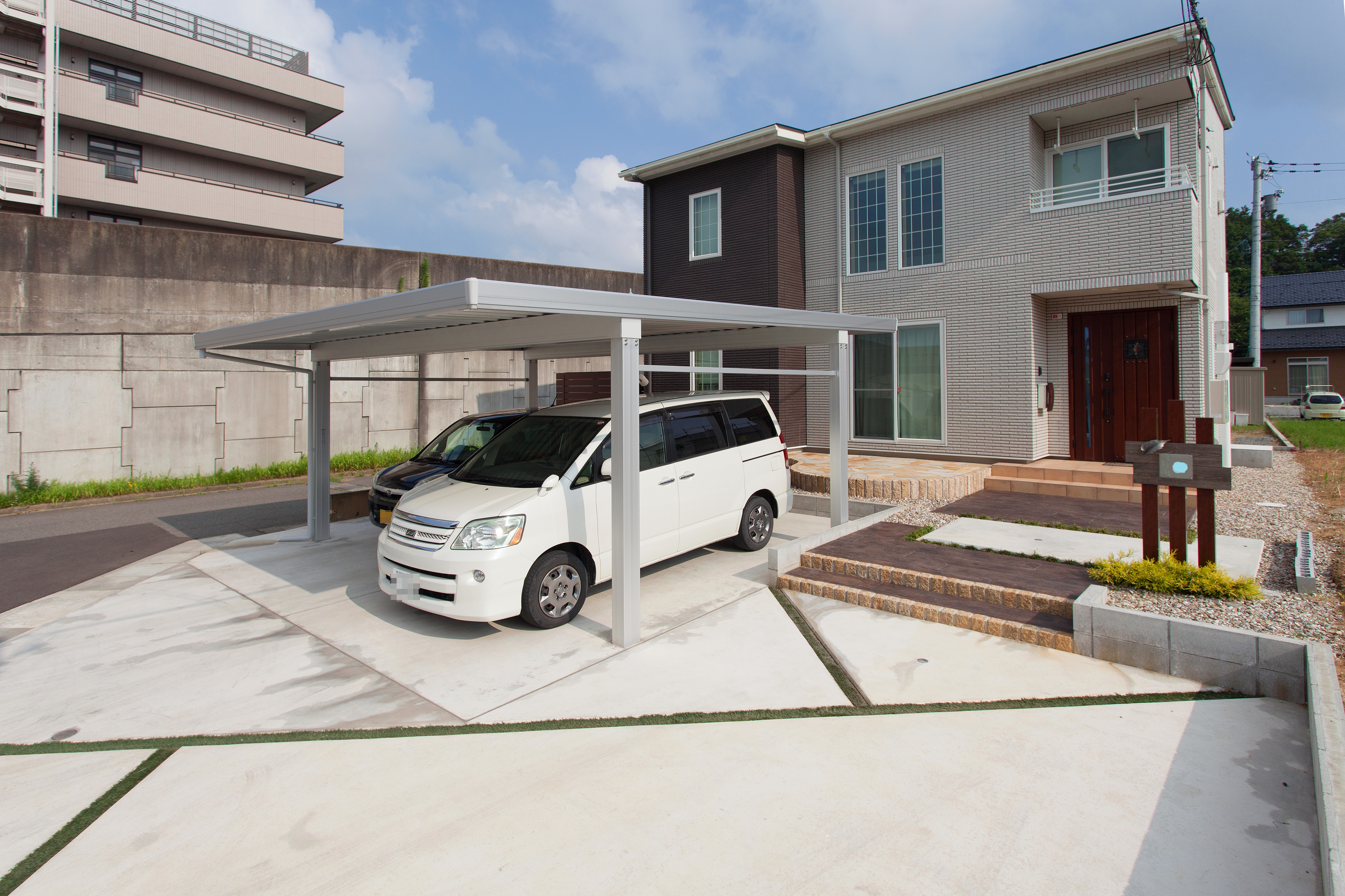 道路からすぐに設置されたカーポートmでは、こ目地に人工芝を使用したシンプルなスペース。人工芝の下はコンクリートなので、草が生えない仕組みになっています。