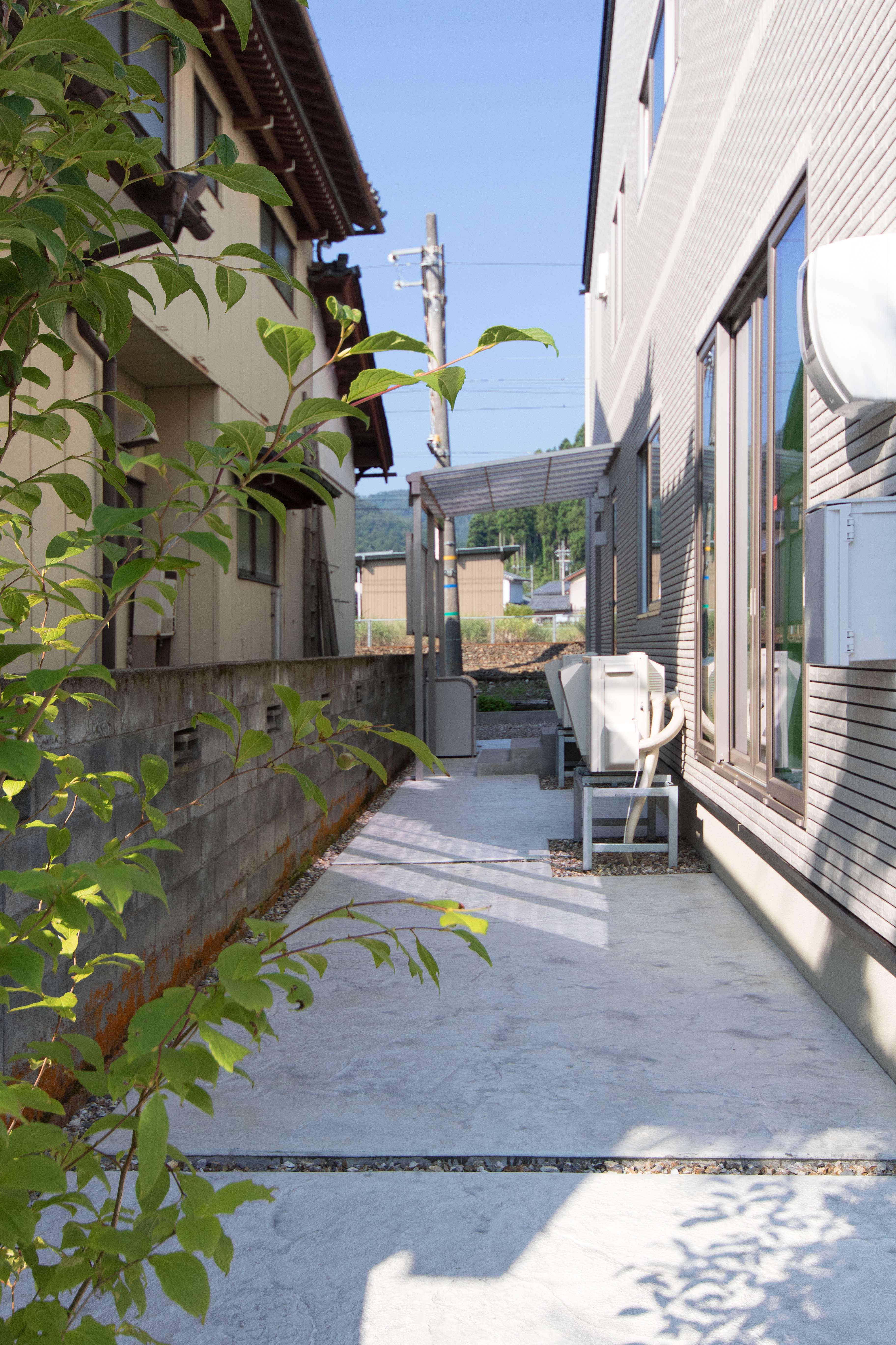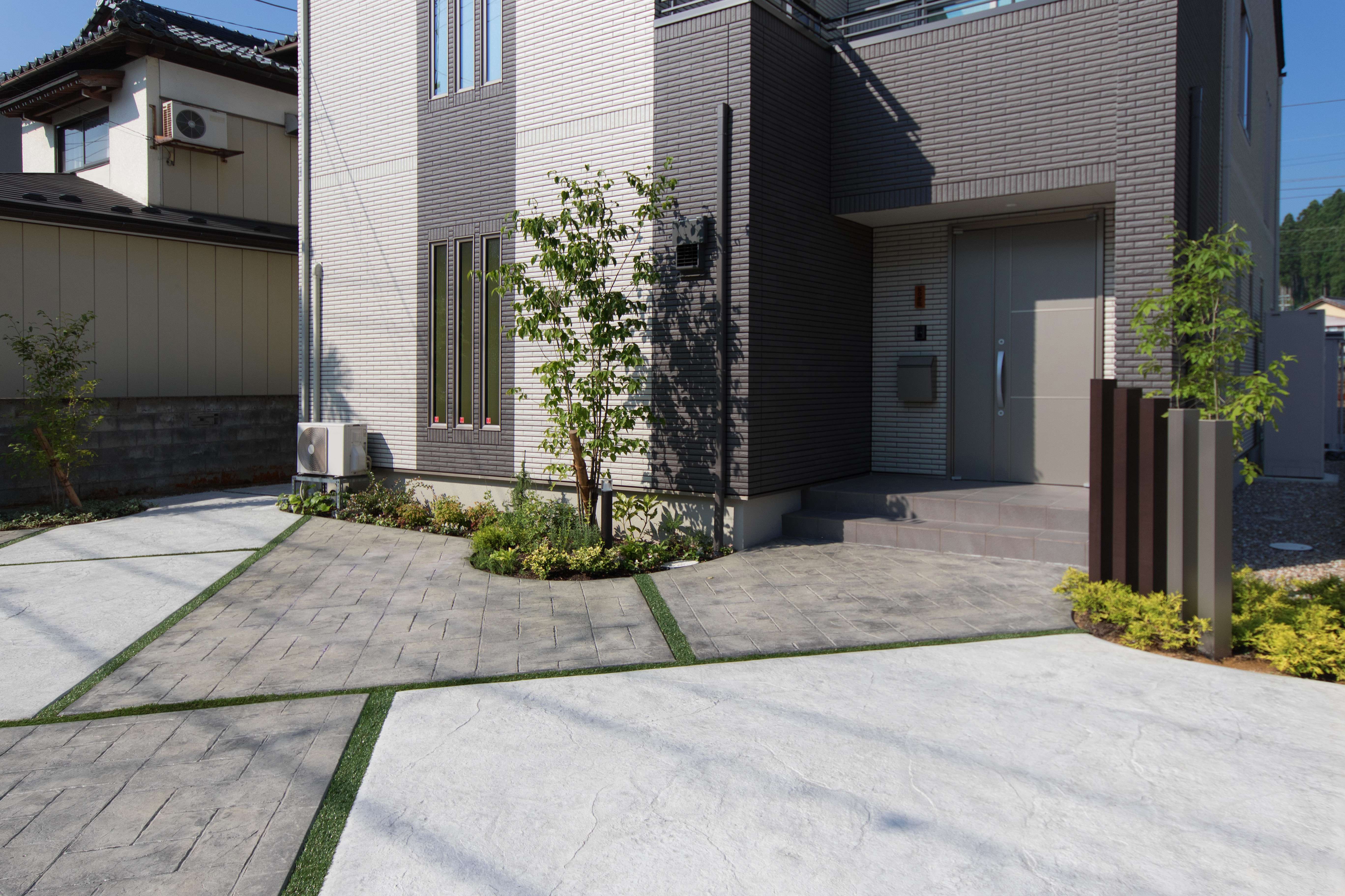 敷地前面を広く魅せるため、人工芝目地をななめに入れてデザインしました。建物のカラーに合わせて、マットスタンプも2種類2カラーを施工。
