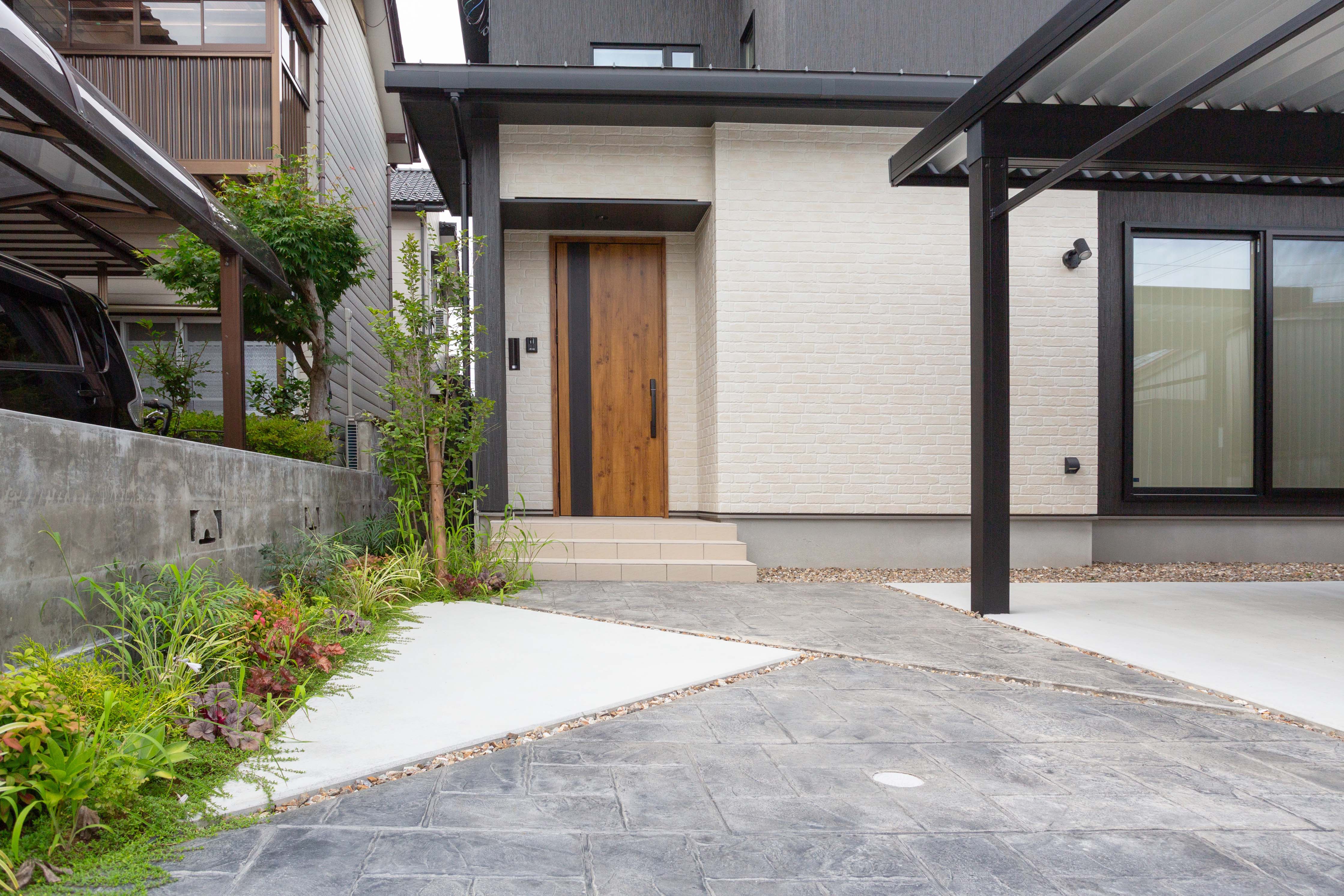 建物に合わせたブラックのカーポート。 マットな質感の物置は、サイドまでこだわりのグレーで統一された逸品です。 シンプルな造形と落ち着いた色合いは住宅と調和し、モダンな印象を演出します。 マットスタンプのシャープなデザインに緑をあしらい、 美しく飽きのこない外構に仕上げました。
