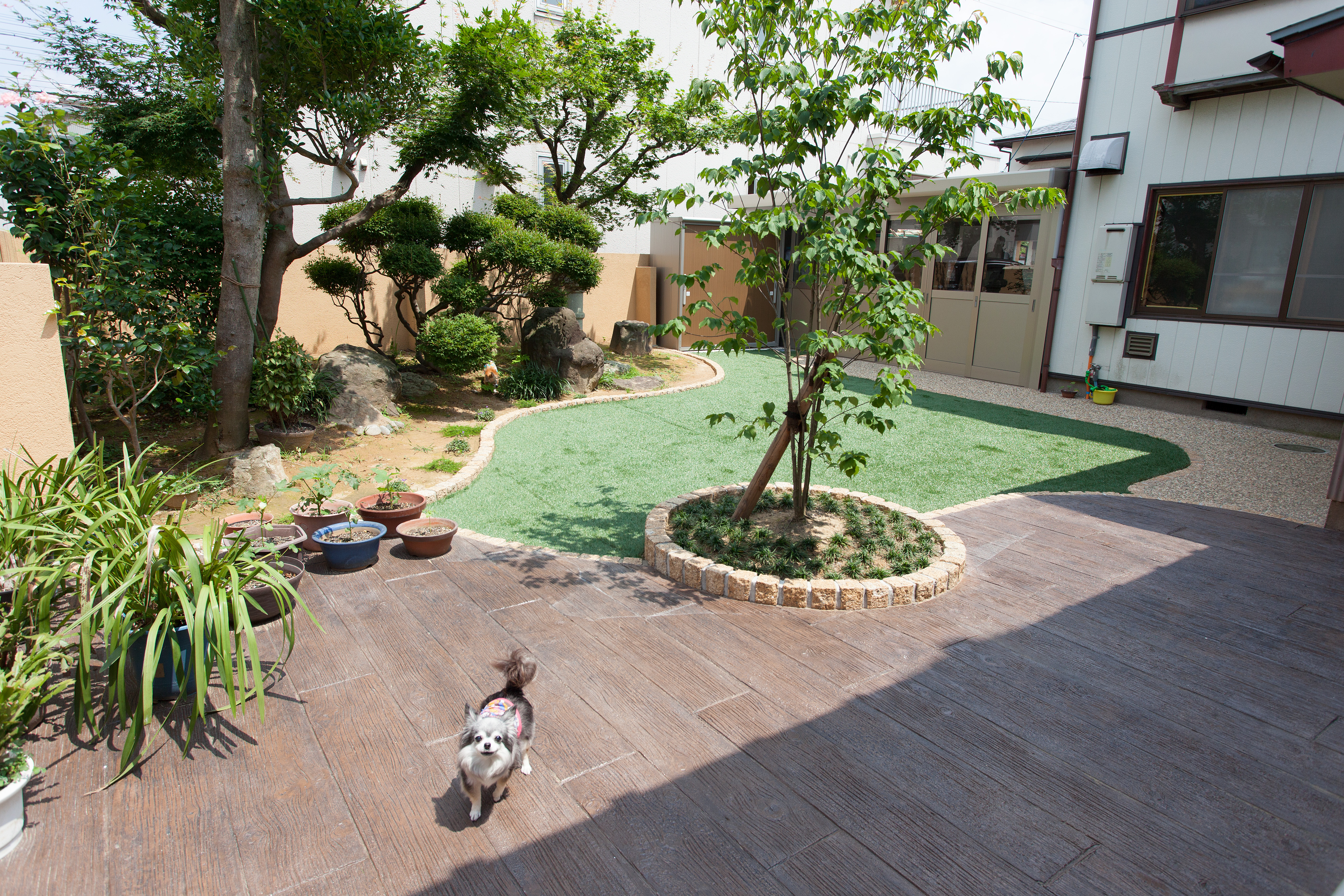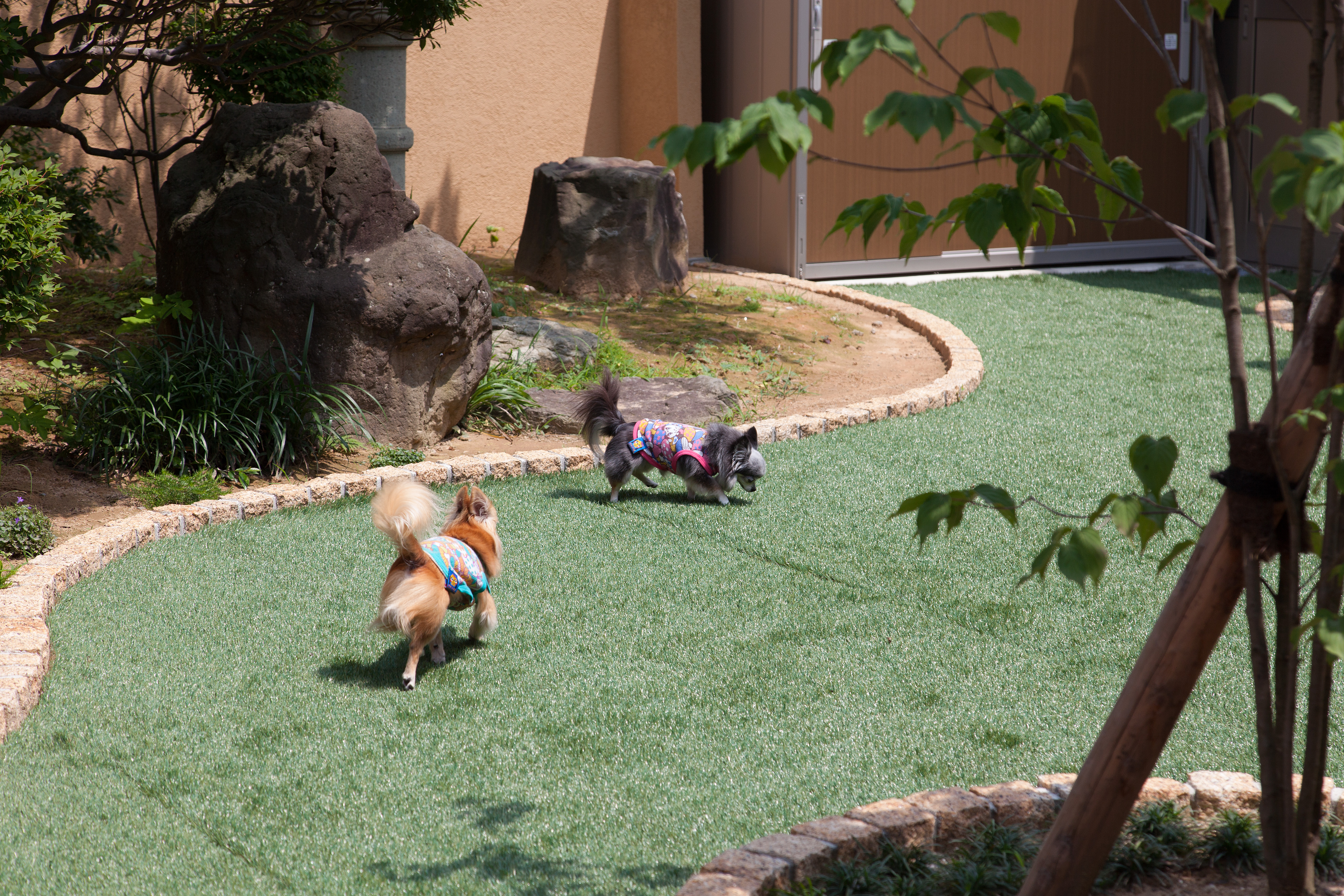小さくて柔らかいワンちゃんの肉急も傷つかない様にバリアフリー。安心して遊んでいられる中庭です。