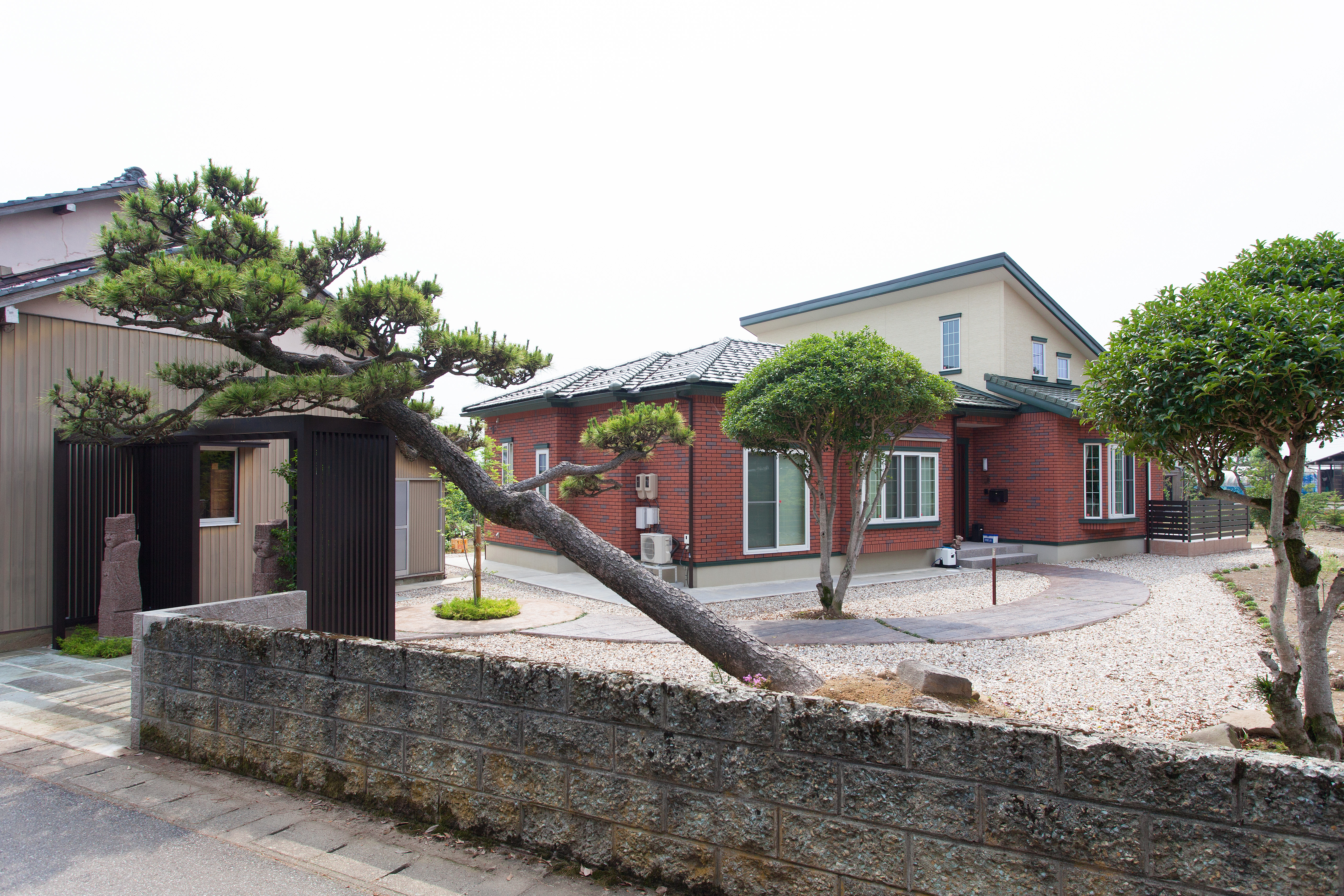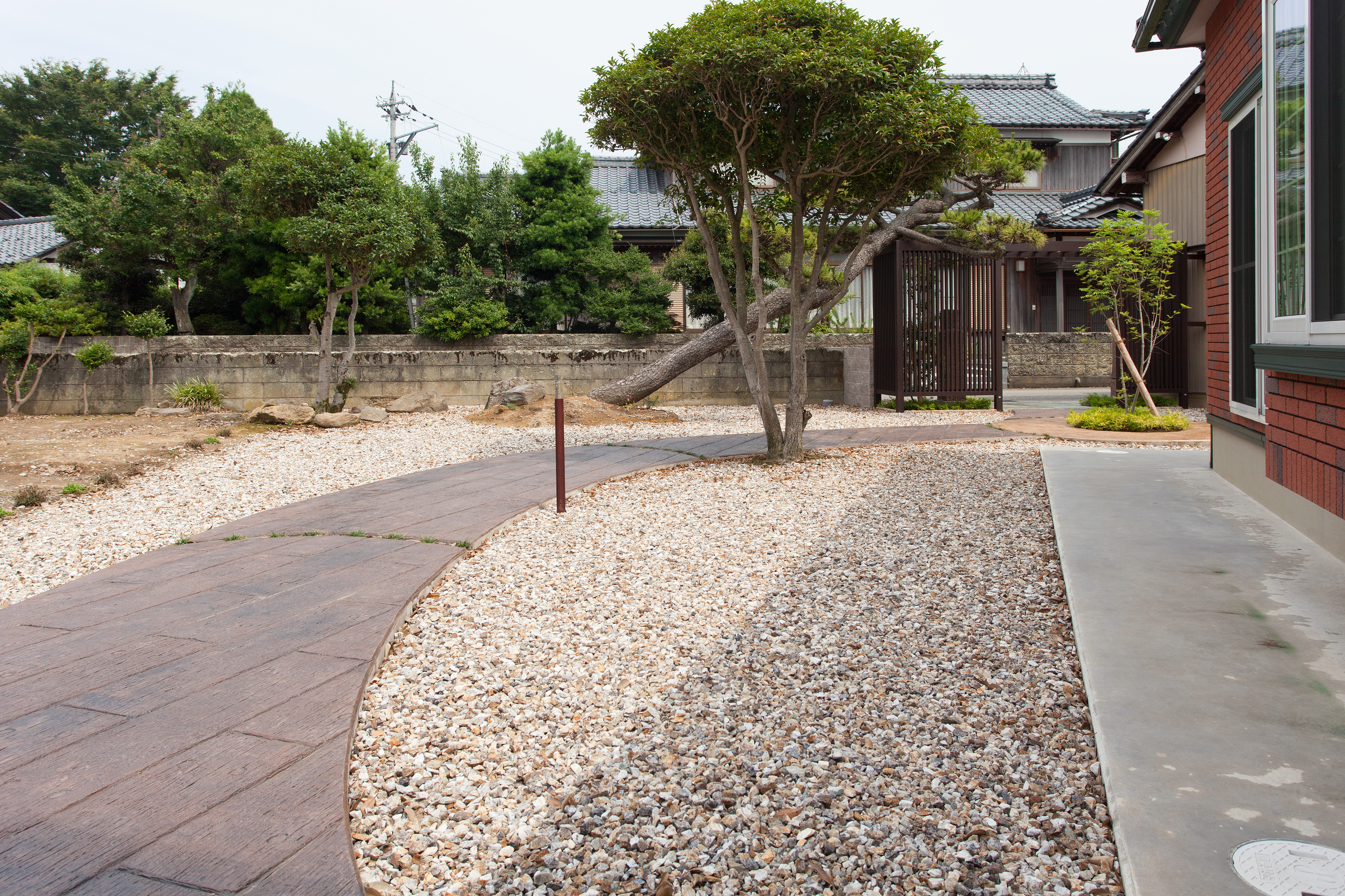 既存の建物とブロックフェンスの深い味わいとアプローチに昔からある松を支える支柱、美しい植栽とトータル外構で豪華に見えるプラスGが建物を更に豪華に魅せてくれます。