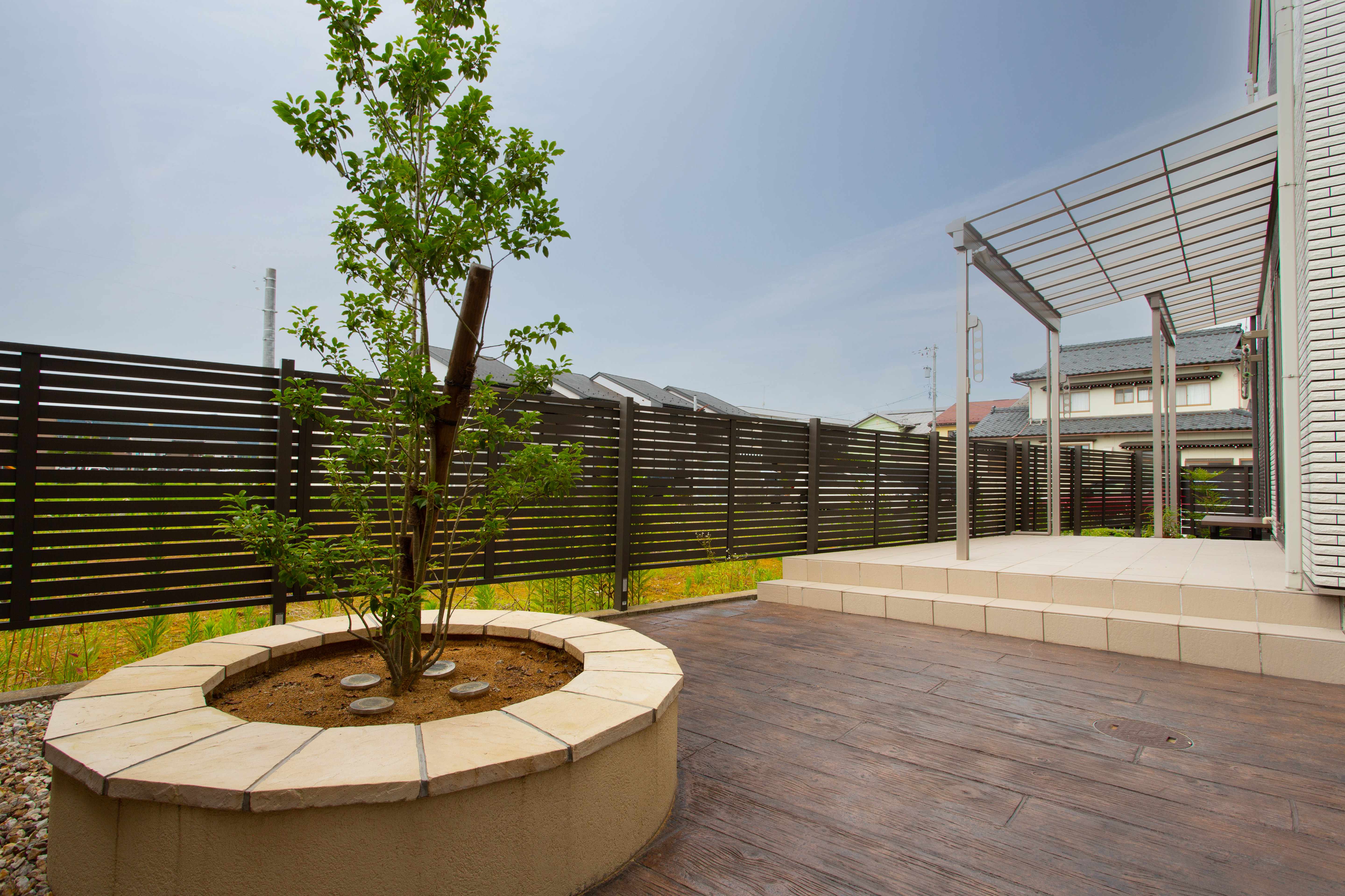 後ろのお庭はタイルデッキとテラスを設け、植栽を施したサークルベンチでお庭らしいお庭へと変わりました。