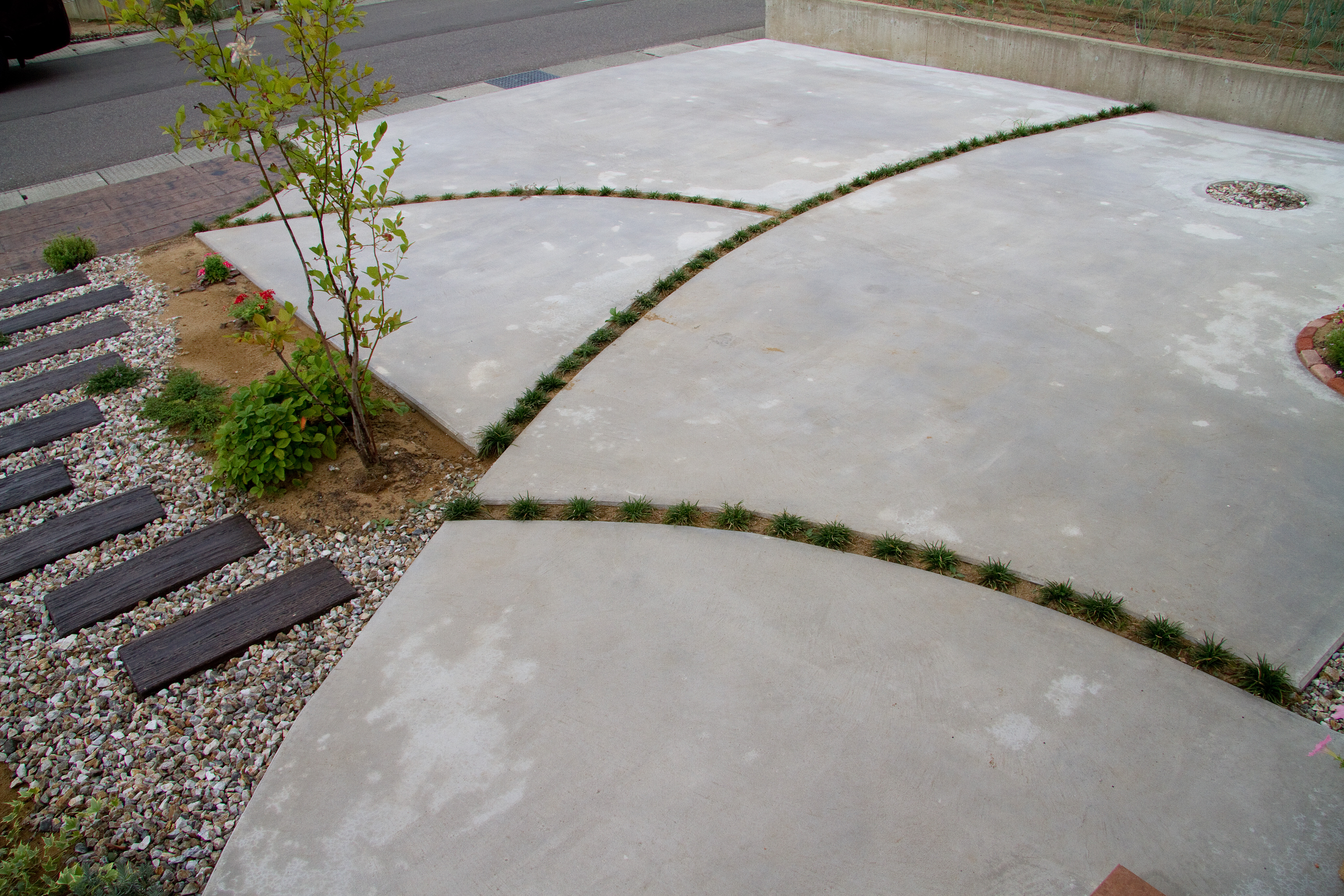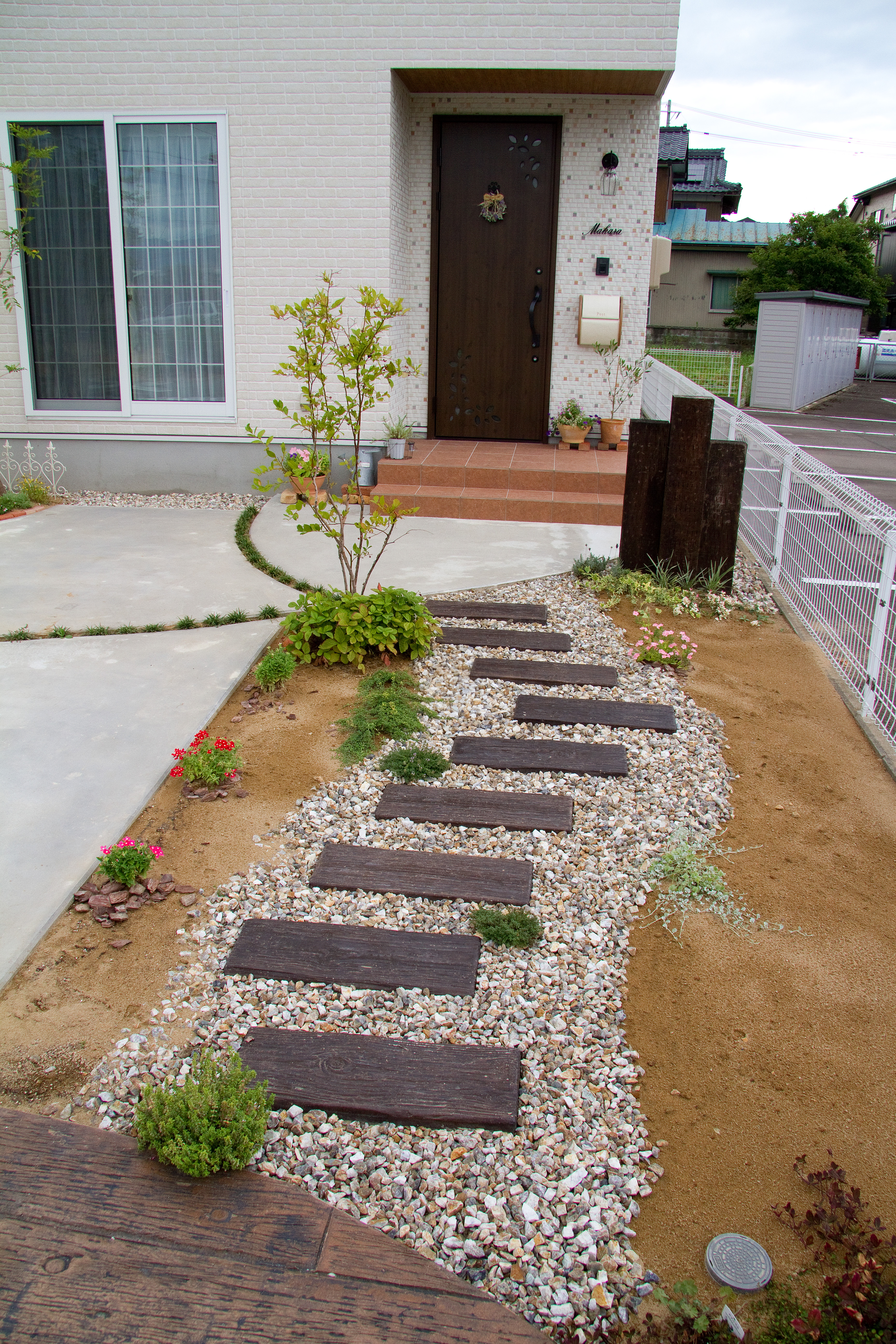 ポスト:ディーズガーデン デザインコンクリート:枕木 アプローチ:枕木 フェンス:余った木材 植栽:タマリュウ、ブルーベリー、シマトネリコ等