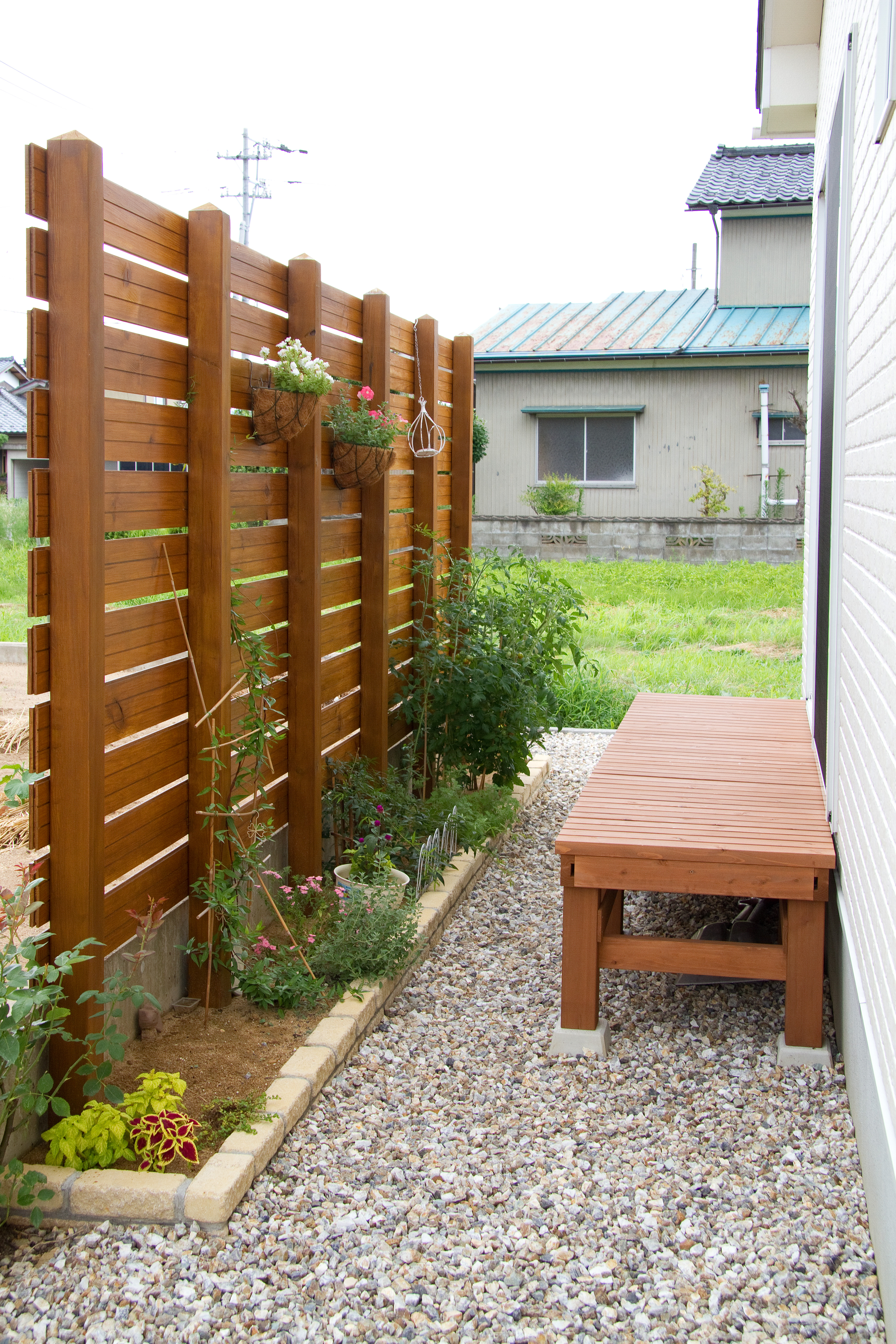 新築工事の時に余った木材で目隠しのフェンスをつくりました。色合いもピッタリ!