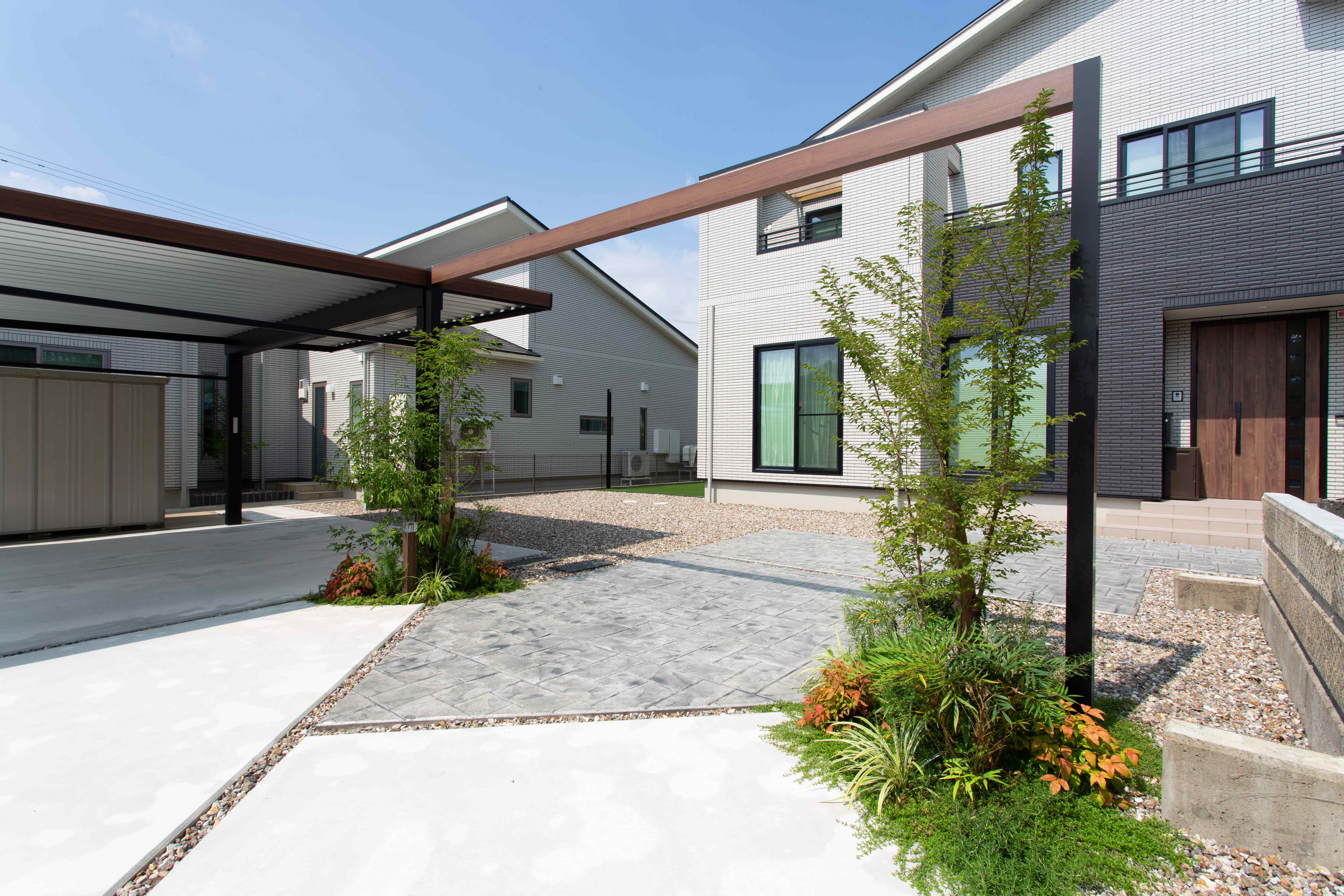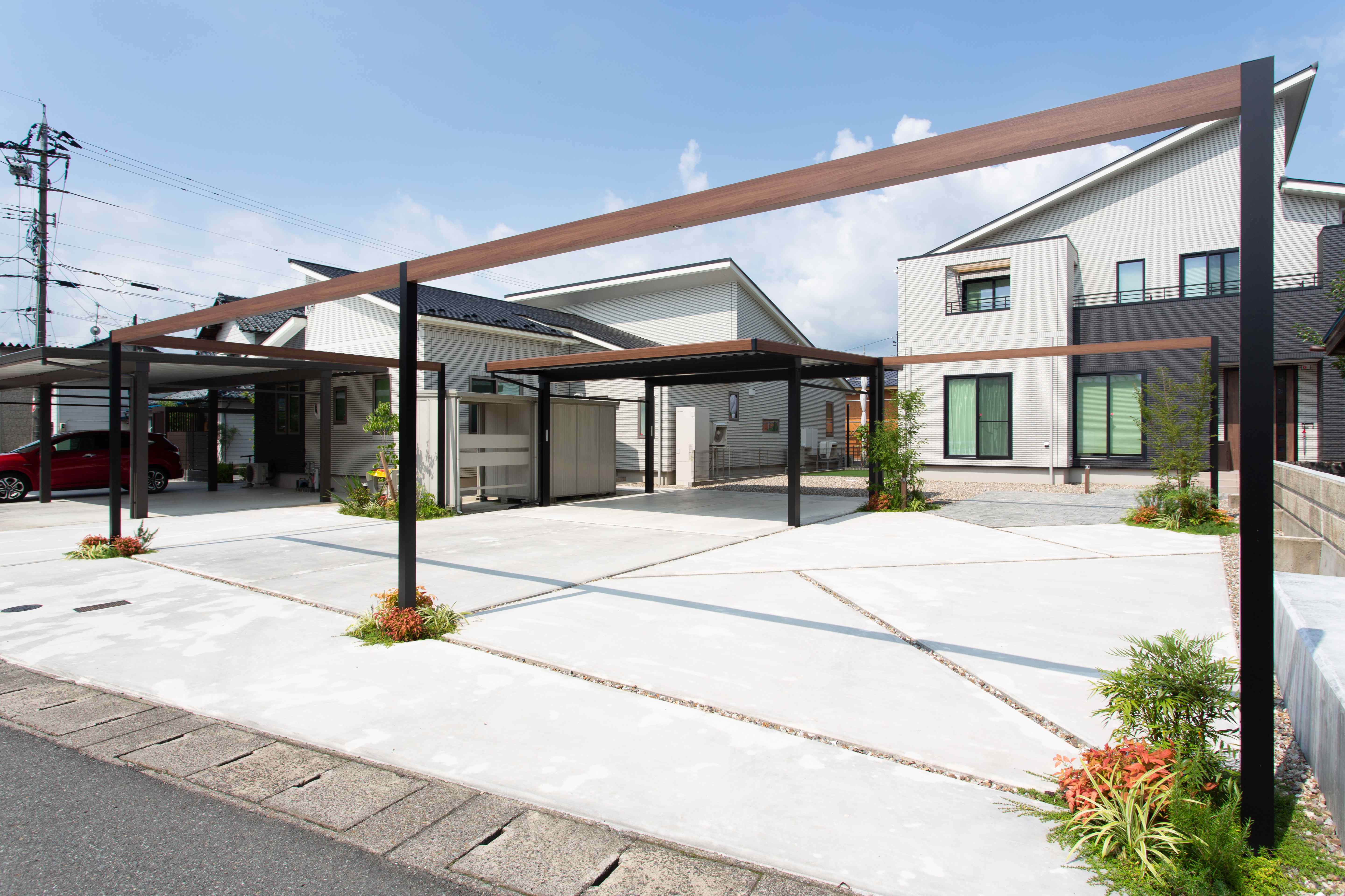 大きな敷地をプラスGによって間取ることで、より立体的に。 「間取り」の桁には木目調を使用して植栽も施すことで、目にも優しい癒しの空間を演出しました。