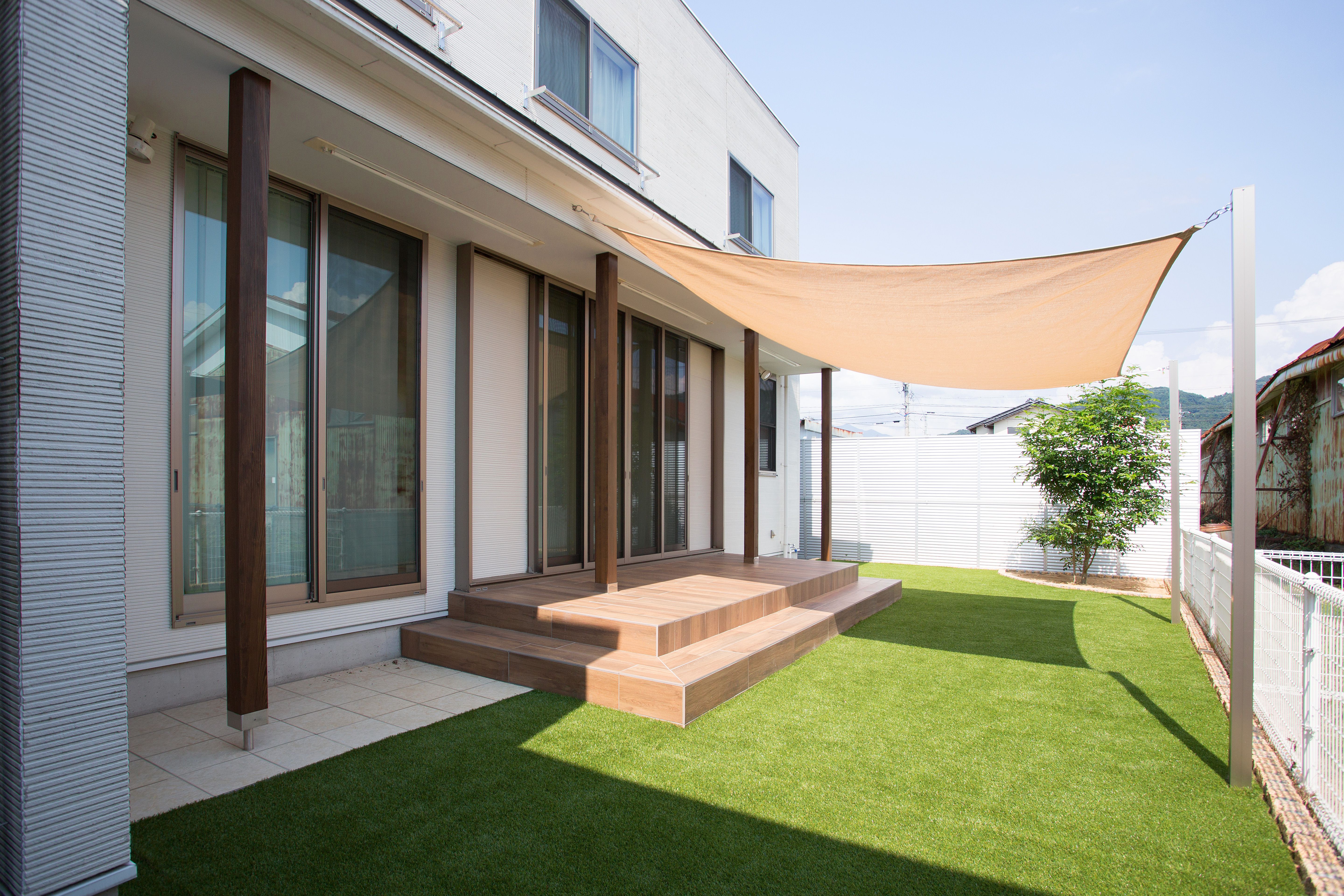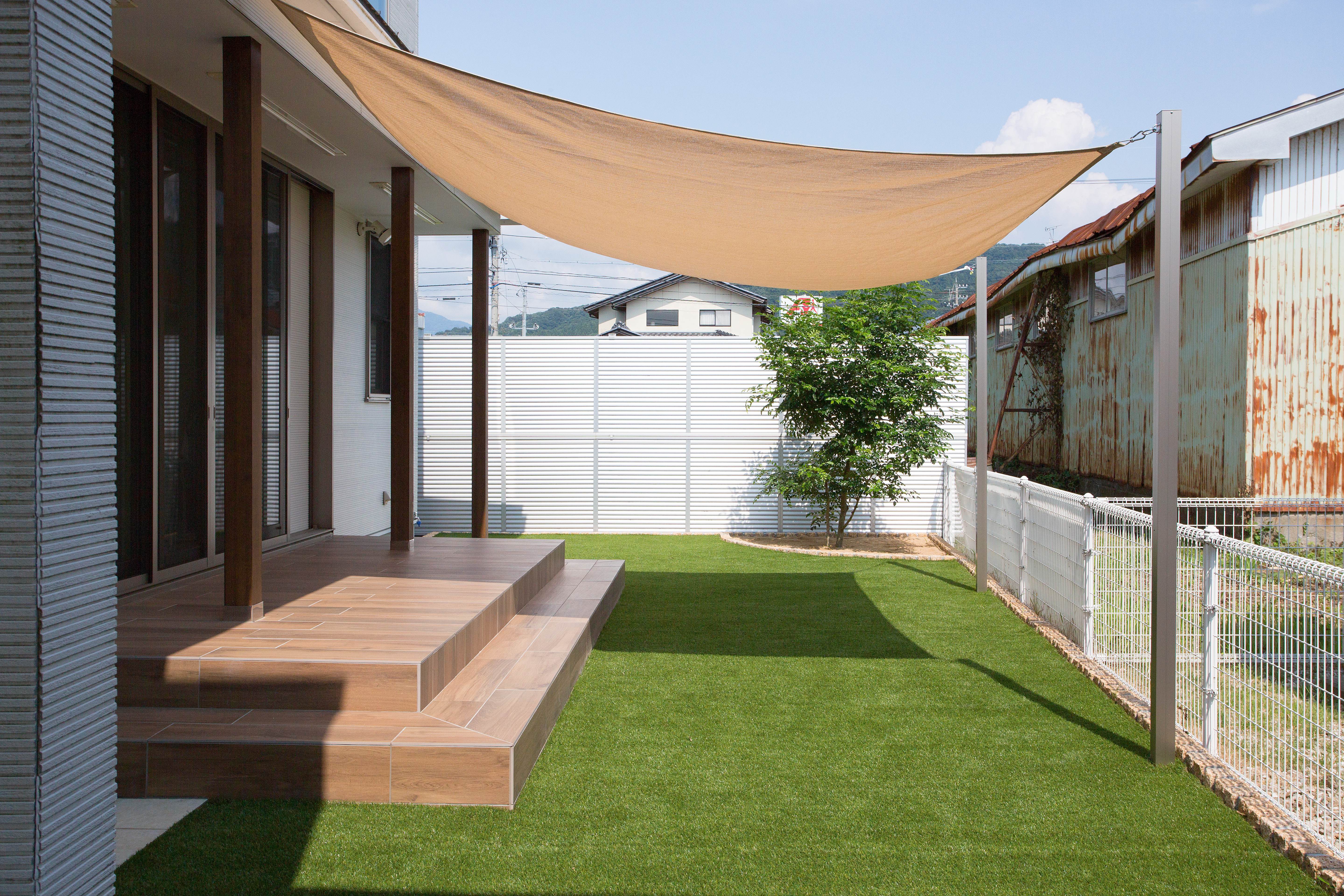管理が難しい天然芝の庭を、もっと手軽に楽しめるメンテナンスフリーの庭へとリフォームしました。 お家からの動線を良くするためお庭自体の高さを底上げし、人工芝に貼り換えてメンテナンスフリーの子供の遊べる空間に。 シェードを取り付けることで、暑い夏も快適に過ごせます。