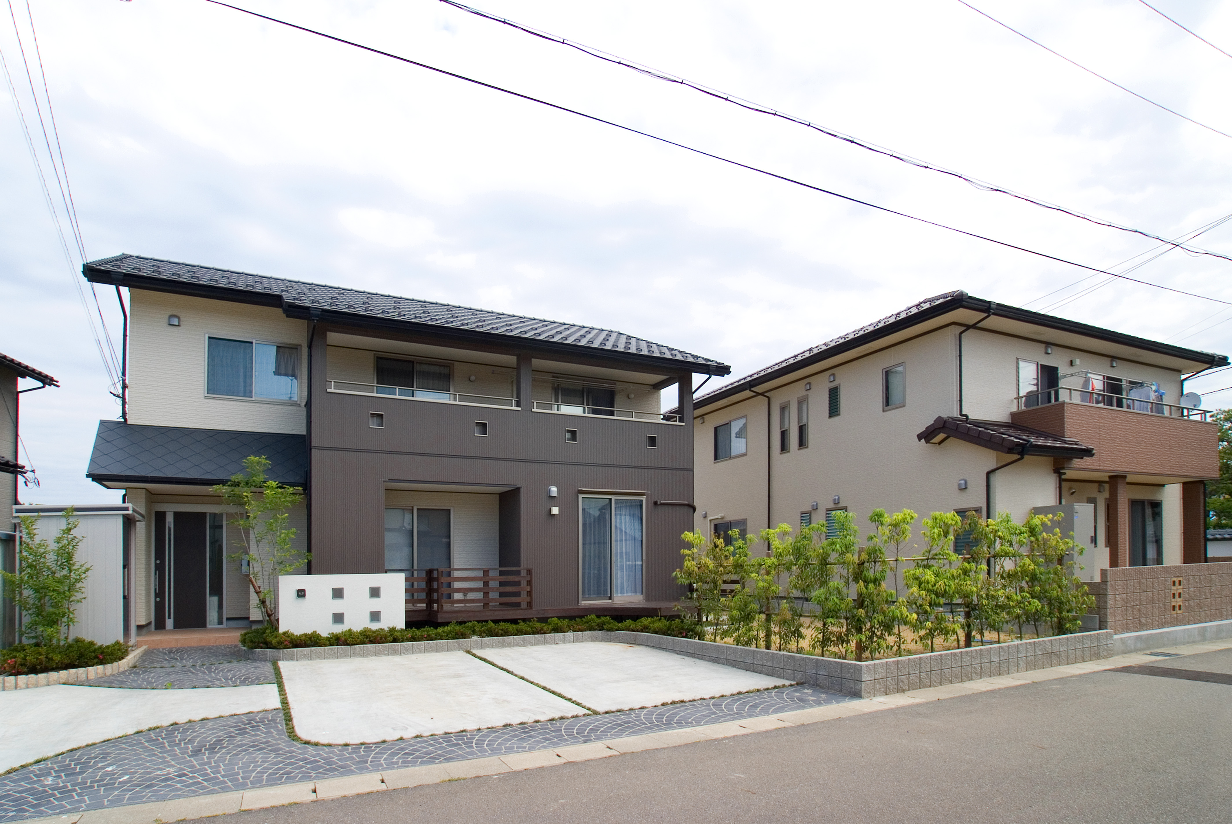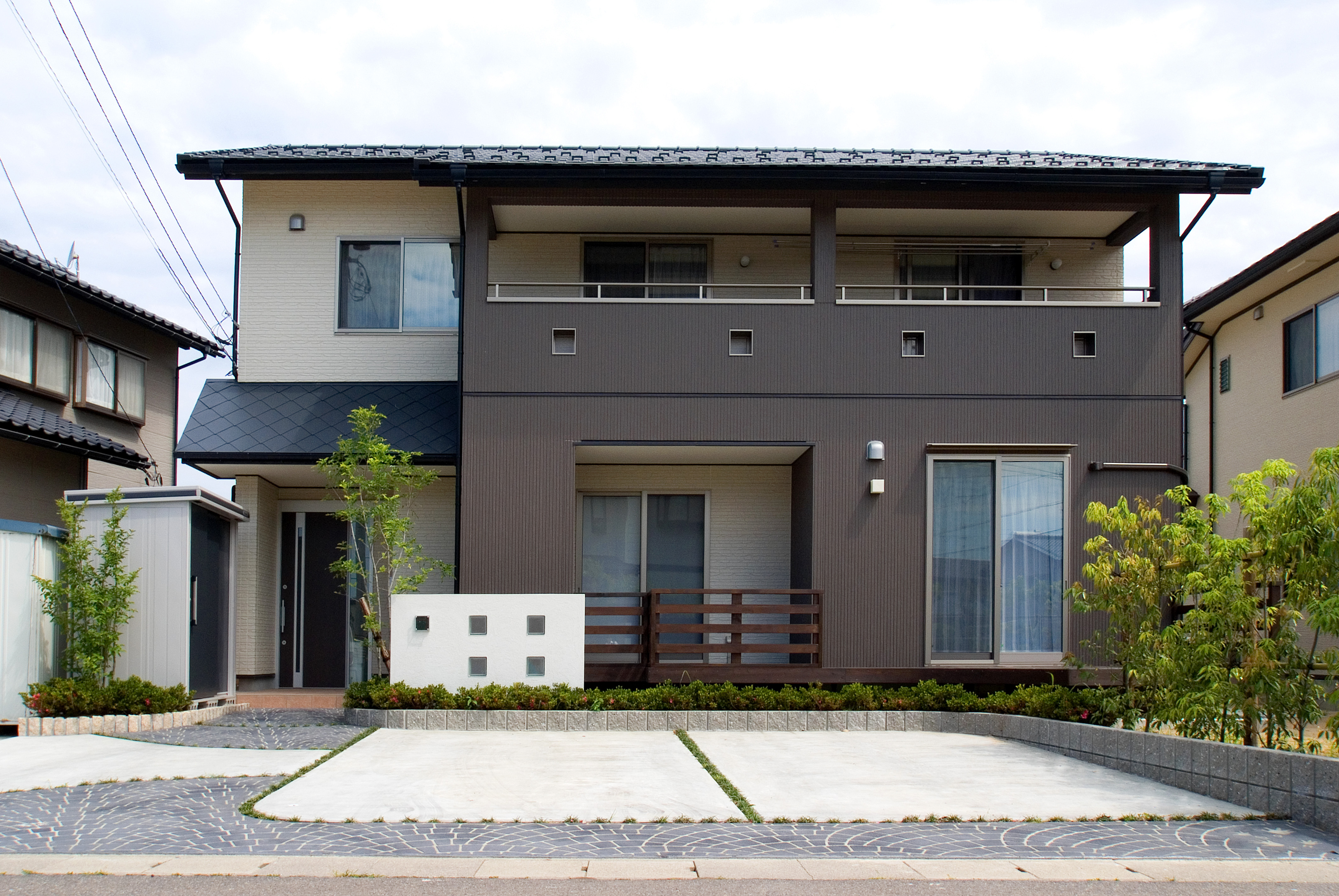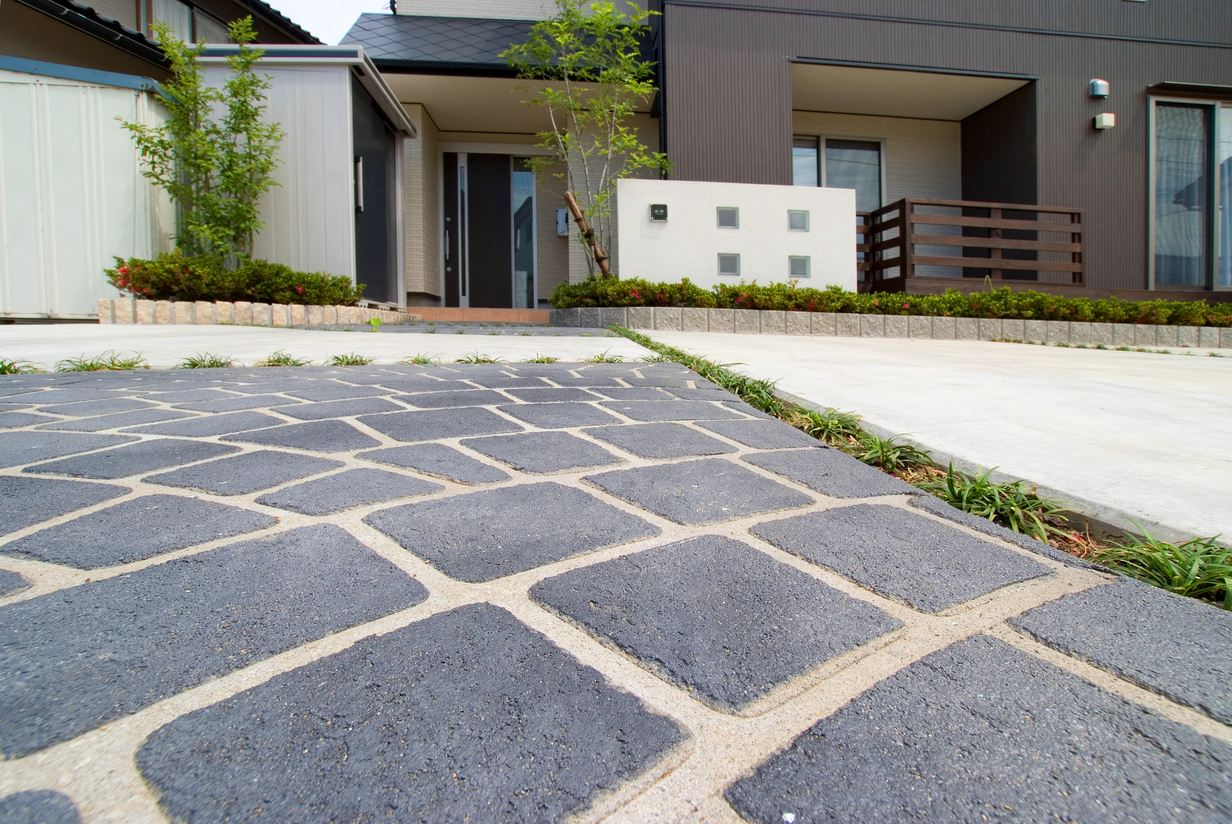 シックでモダンな意匠のご住宅の外構工事は、シンプルにまとめるのが一番マッチします。 さらに実用性を取り入れ、車2台+1台分でアプローチスペースも ゆったりと確保し、 外観を壊さずさりげなく玄関前に物置を配置し、 トータルでのバランスによりベストマッチな外構工事を完成させました。