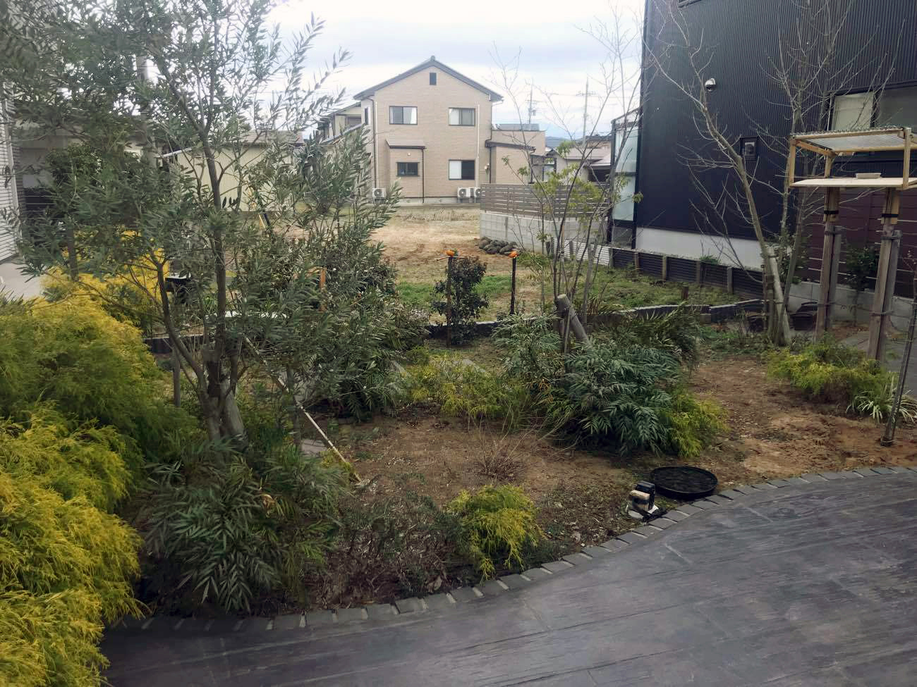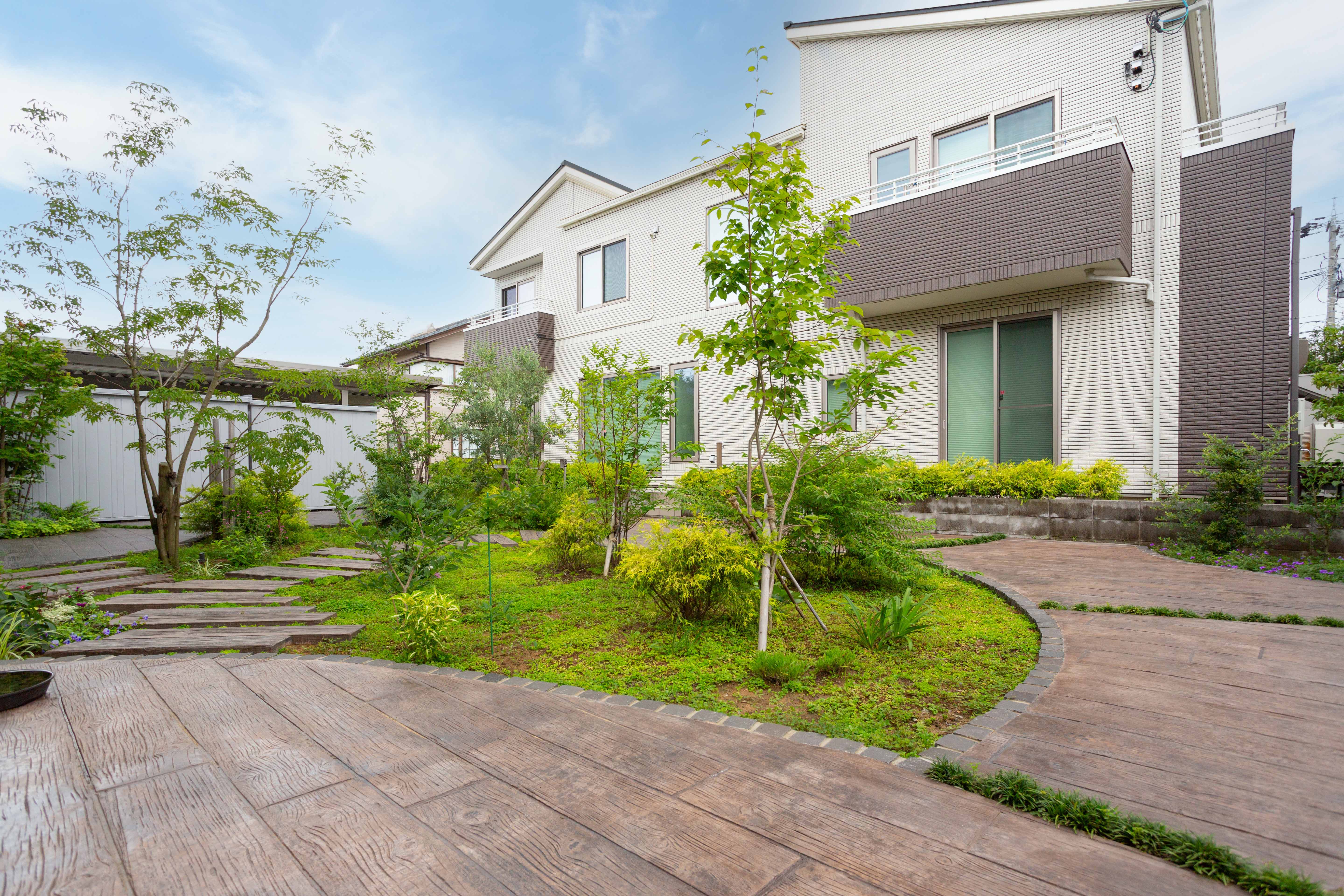 2回に分けての外構工事ついに完成! 小鳥が遊びに来るような森をイメージしたお庭に仕上げました。 かわいい枕木の小道に、庭全体を回れるようスタンプコンクリートで仕上げました。 お気に入りの草花を植えて、ガーデニングも楽しめる素敵なお庭ですね。