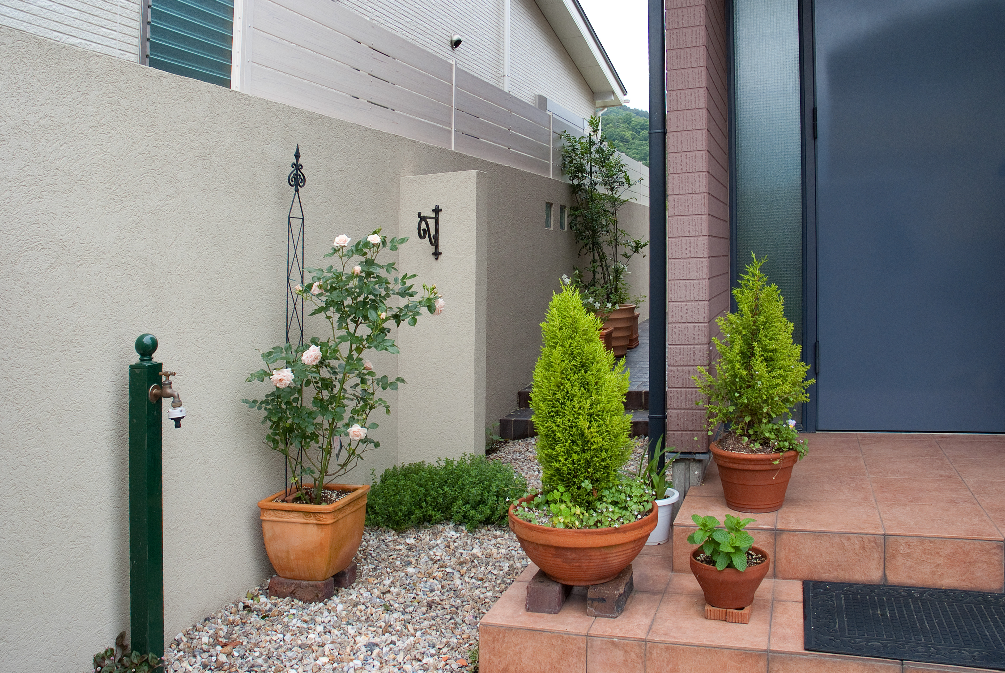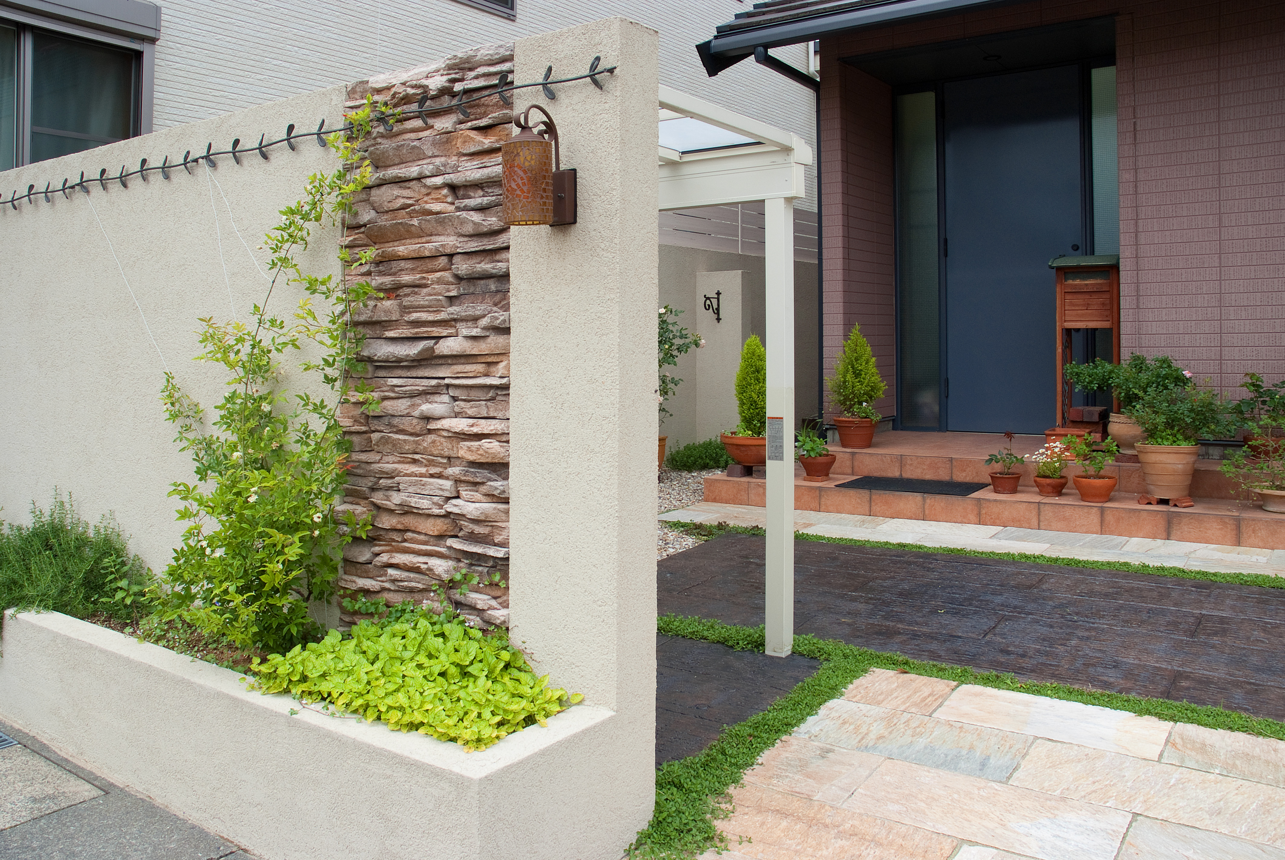 「車を止めるスペースがほしい」「植物がいかせる外構にしたい」との奥様からの要望でした。 ご主人様も打合せを重ねるごとに興味を持っていただき、プラン 中も3人で楽しみながらお話できました。 植物の大好きなS様だからこその外構です。 見て楽しみ、育てて楽しむ。そしてハーブのにおいを楽しむ。など様々な 用途がいっぱいです。 石貼りのバランス、塗り壁のバランスなど、職人がいつも以上にこだわりぬいた外構になりました。