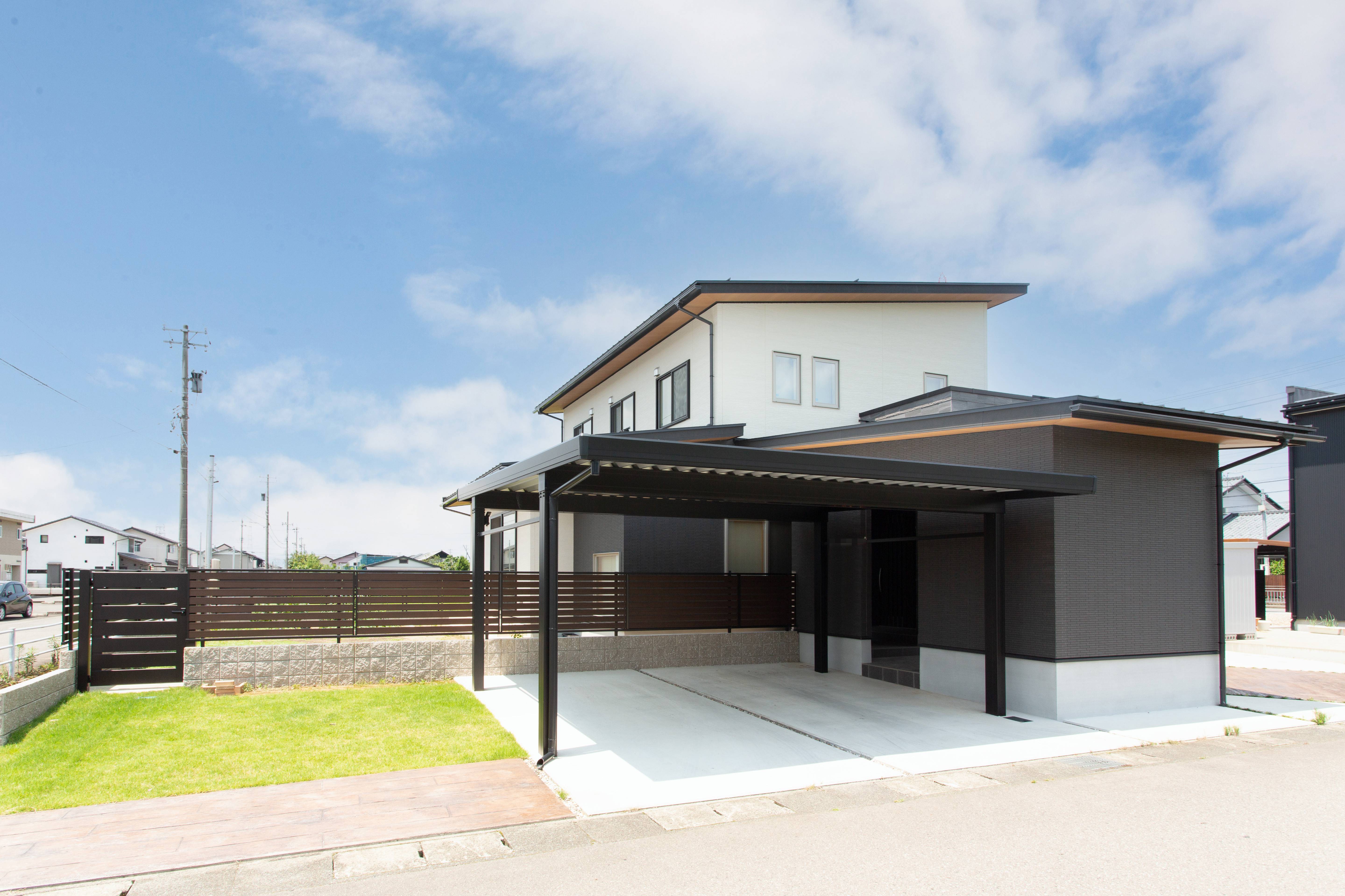 木調のモニュメントとスタンプコンクリートとフェンスがモダンな住宅に調和。