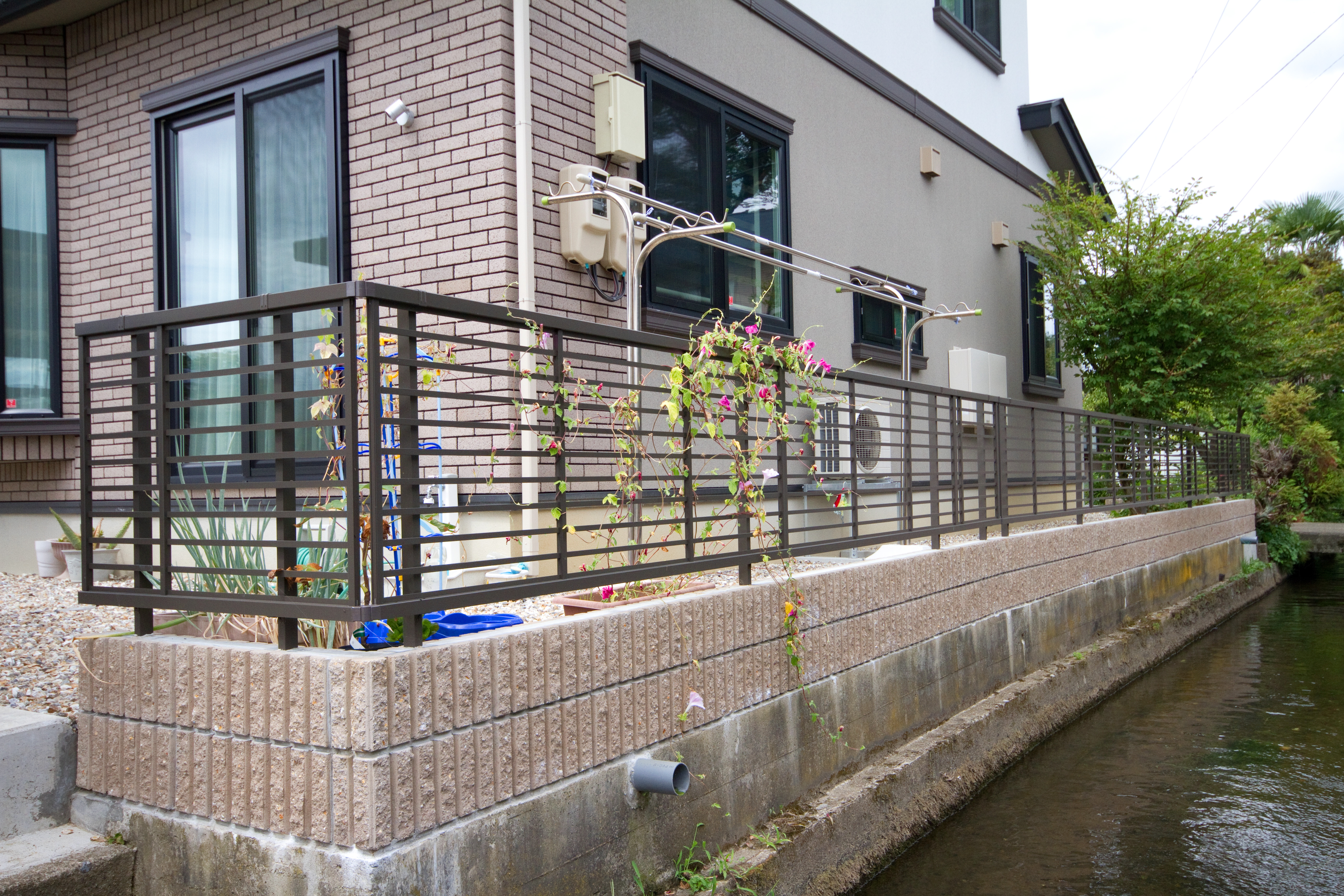 小さいお子様がいらっしゃるご家庭での施工でした。建物がブラウンのシックな雰囲気でしたのでそれに合せてローメンテナンスのスタンプコンクリートでデザインしました。また、フェンスは、横が川でしたのでお子様が落ちない様落下防止に少し低めに設置。外観の雰囲気を損なわない様配慮しました。