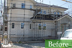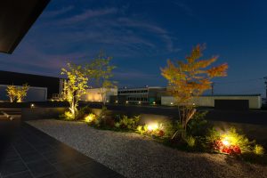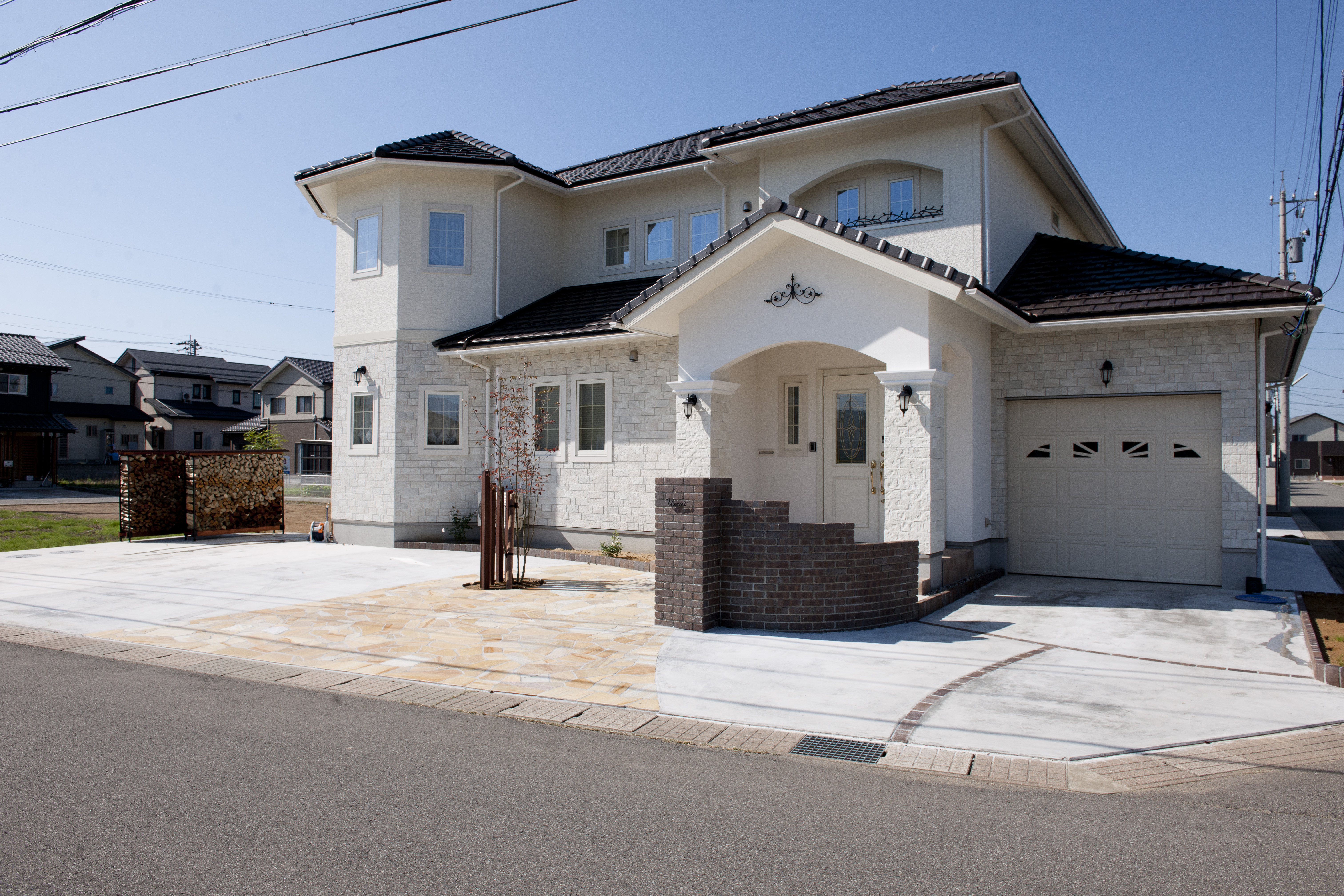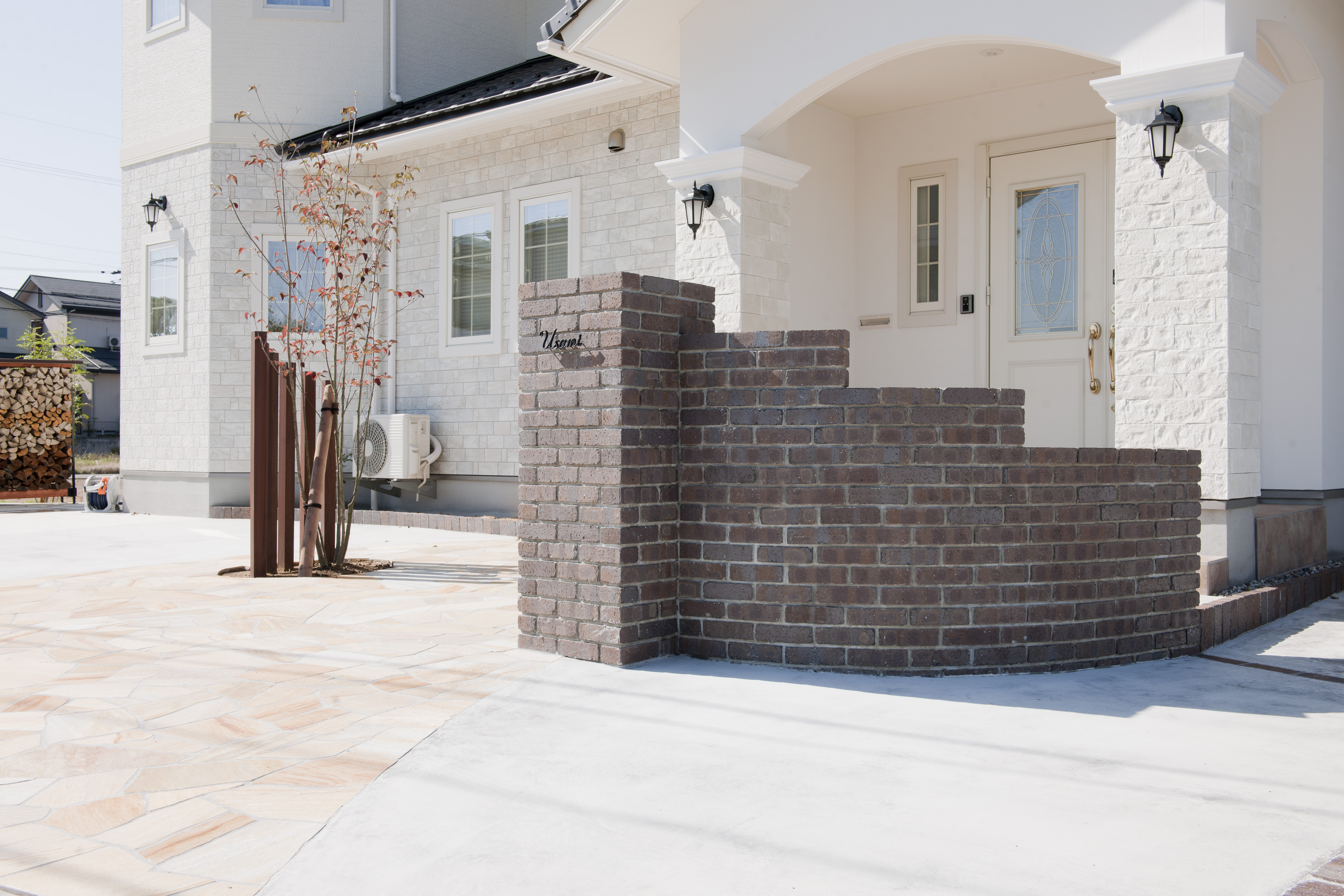 ホワイト系のレンガと落ち着いたブラウンの屋根、優しく美しい新築外構を豪華に大きく見える様デザインしました。駐車場スペースは6台分必要でしたのでアプローチに美しい天然石を乱貼りで配置。天然石といっても滑らないので雨が降っても安心です。玄関周りは太めの門柱を施工。カラーも存在感のある校目のブラウンを使用する事で、屋根だけが重くならない様に配慮しました。門柱と対称的にウリン柱と植栽でシンプルにバランスをとれるようにしました。