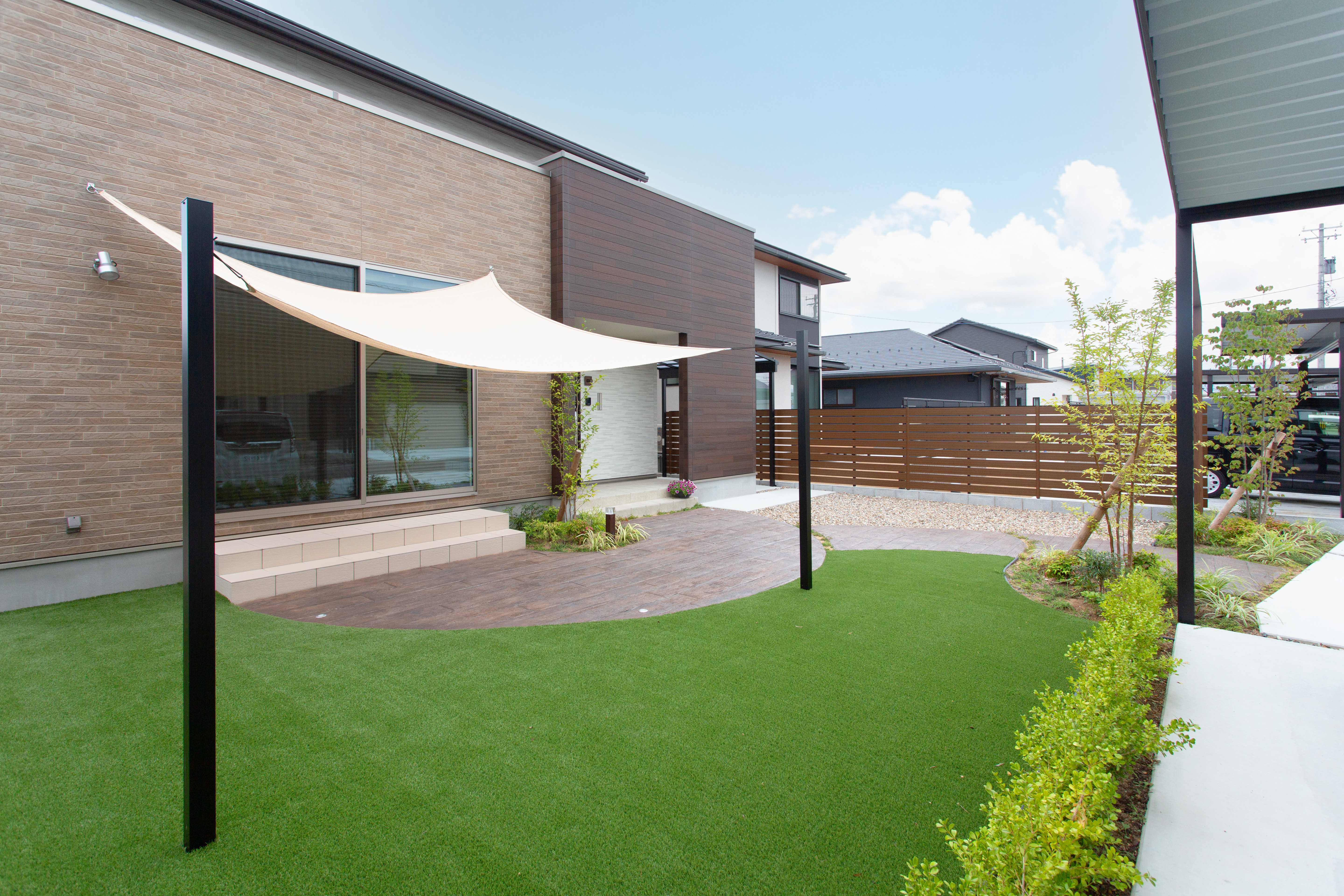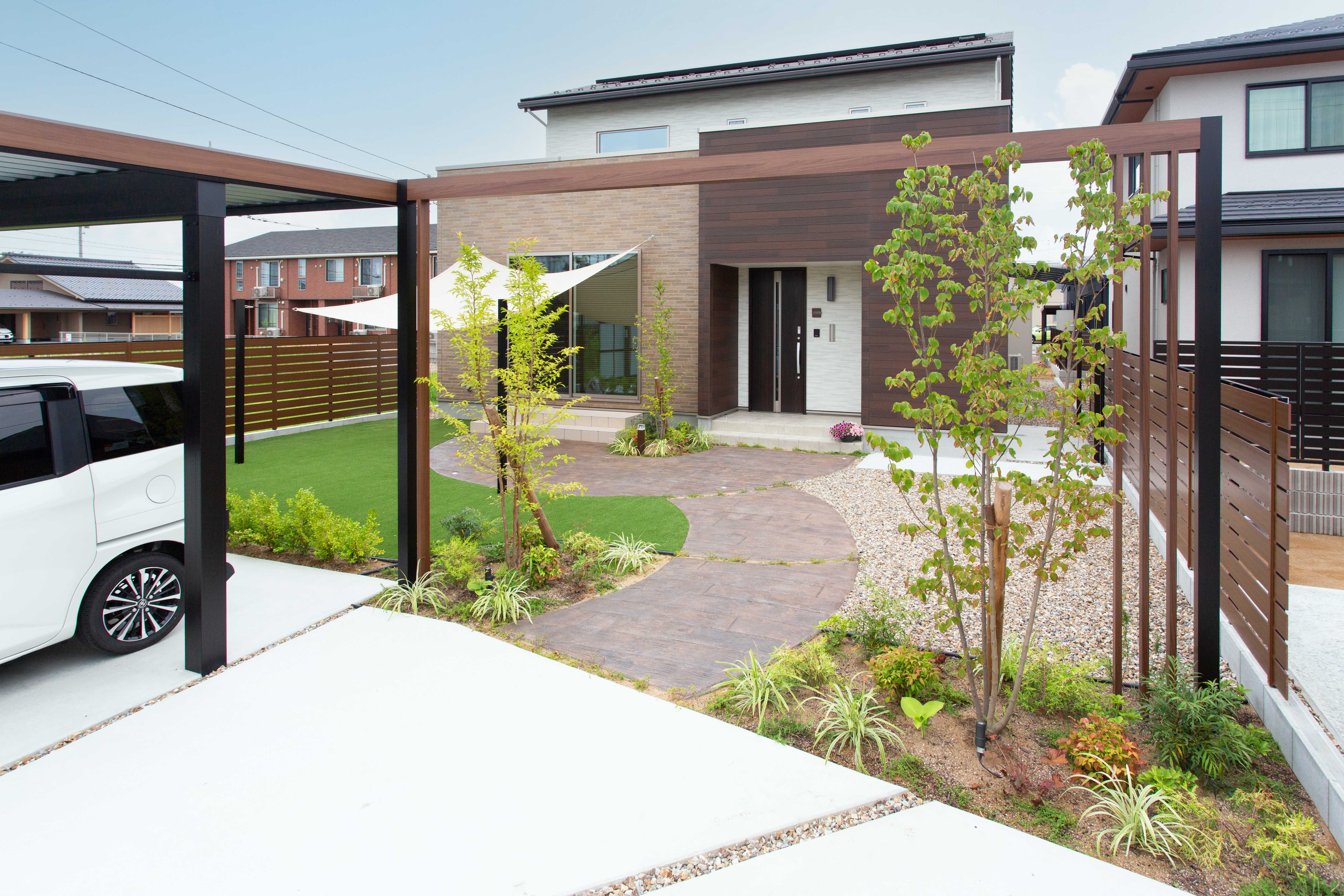 カーポートのハフ板と+Gのゲートに繋がりを持たせることで敷地全体に一体感を。