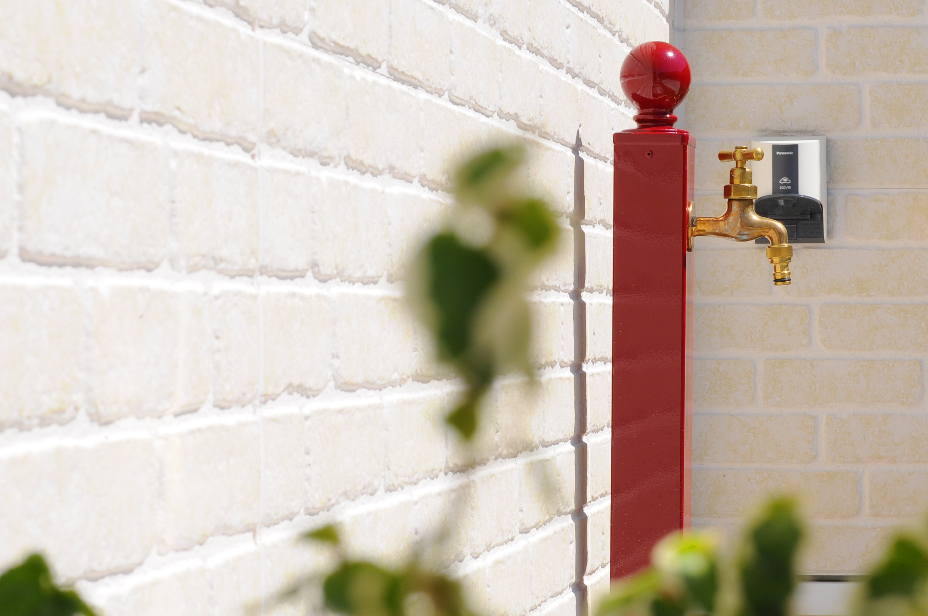 ポストと水栓柱は、アクセントに大胆な赤を導入。