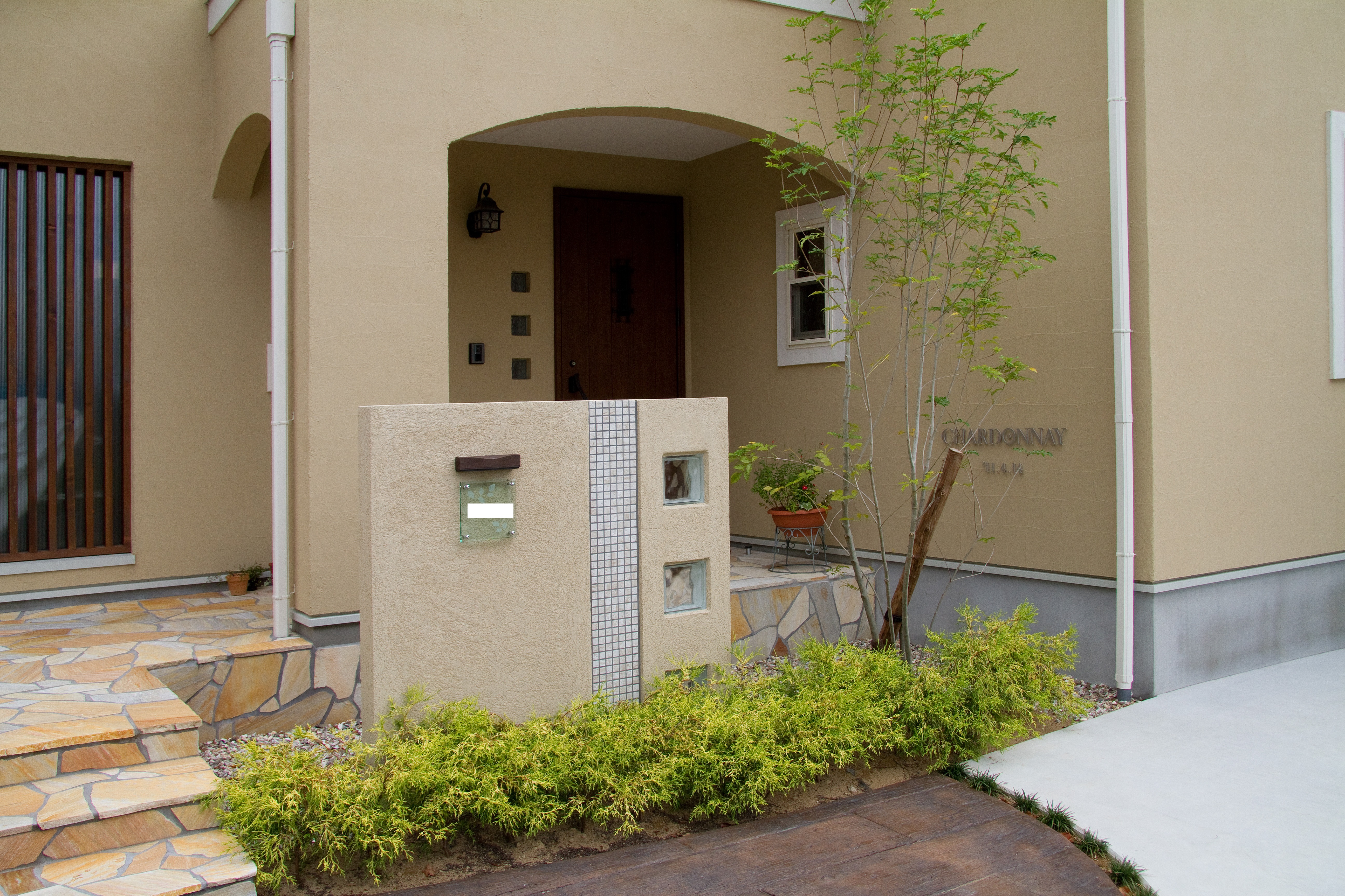 外まわりの顔となる門柱は明るい建物の色に合わせた仕上げで統一感をだしました。