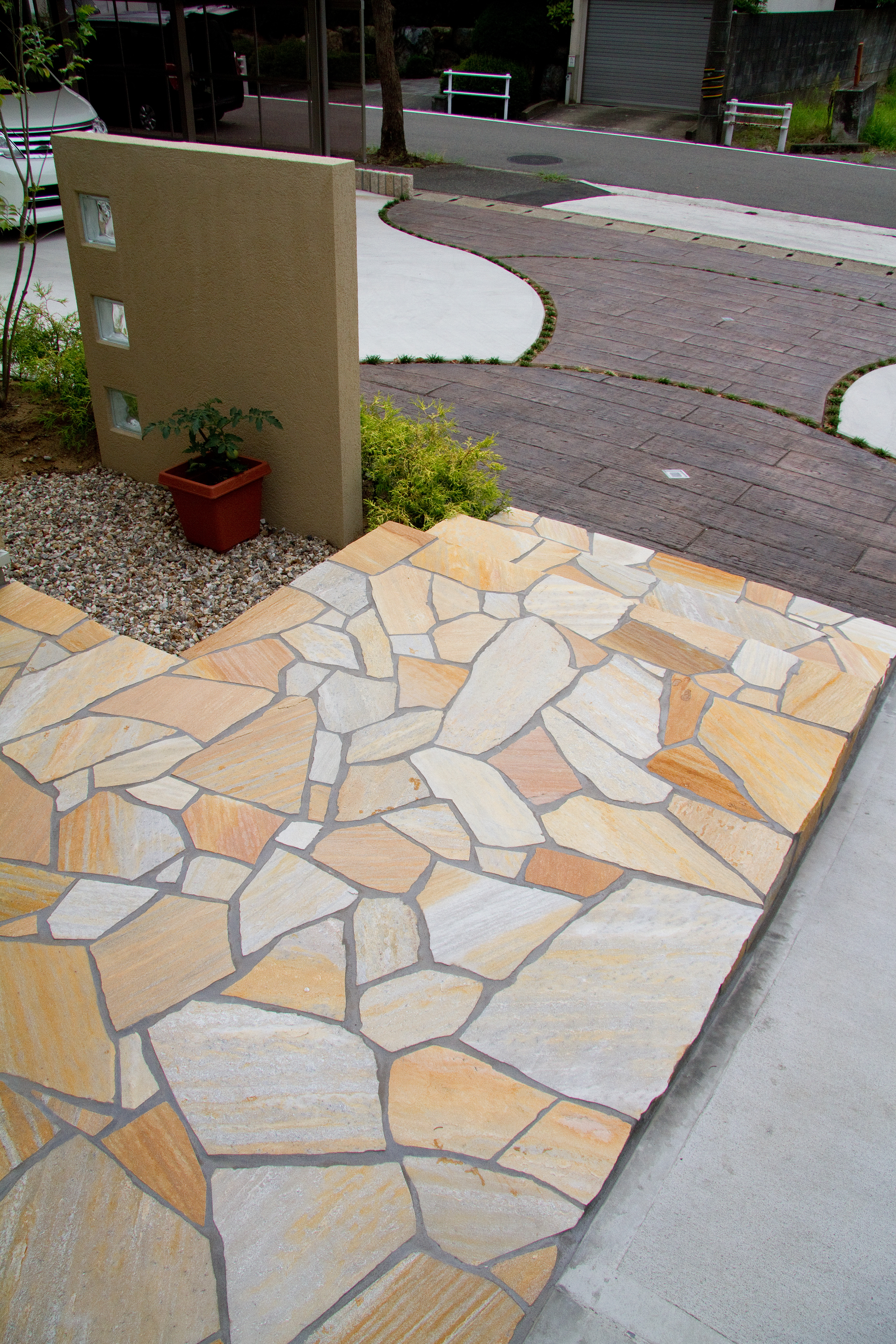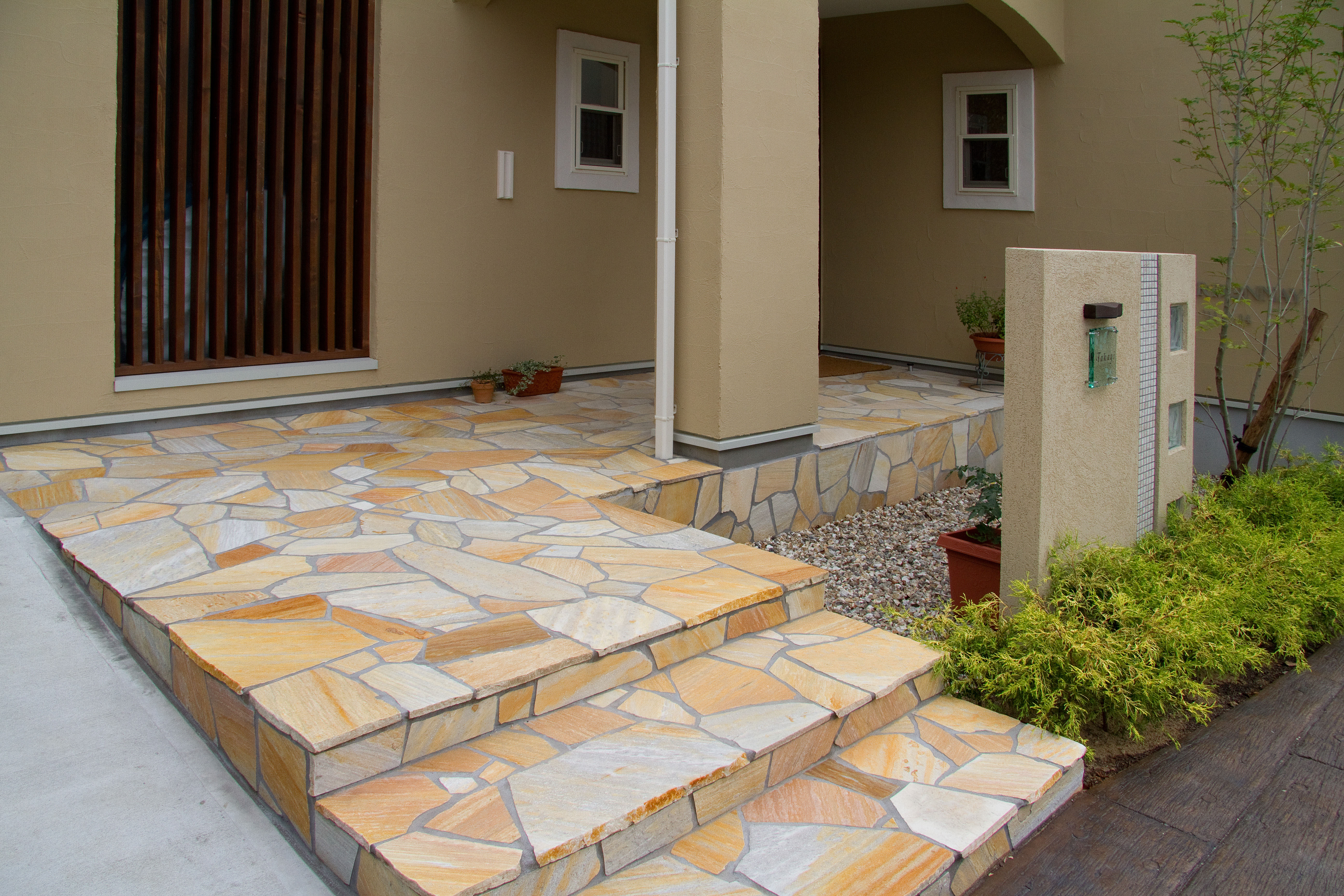アクセントにガラスブロックとモザイクタイルをあしらっています。駐車場から玄関へと続く動線は枕木風のスタンプコンクリートを曲線でデザインしながら大きなアプローチを演出しています。階段にはイエローの乱形天然石を使い豪華なイメージに。