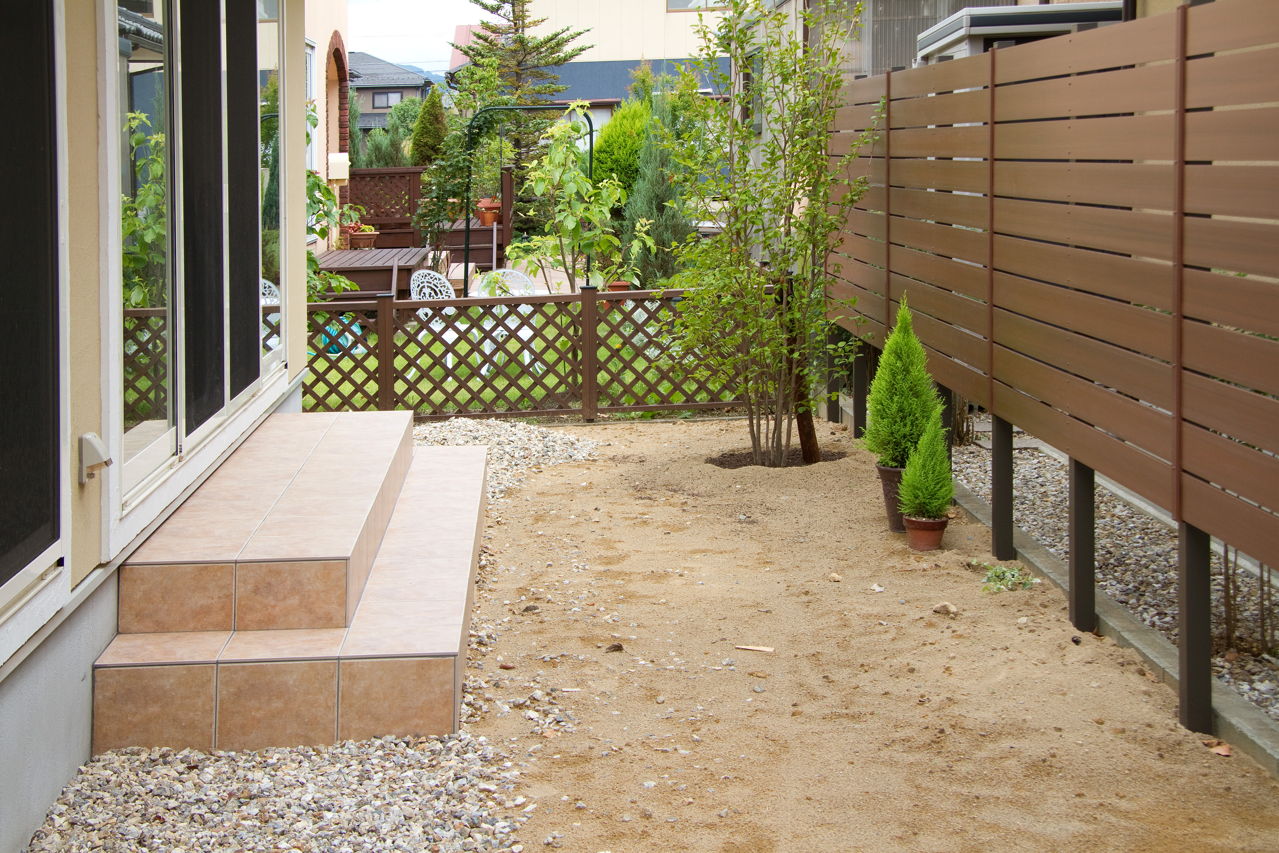 お庭の境界部分にはナチュラルな目隠しができる樹脂製の板貼りフェンスを設置してプライベートガーデンの出来上がりです♪