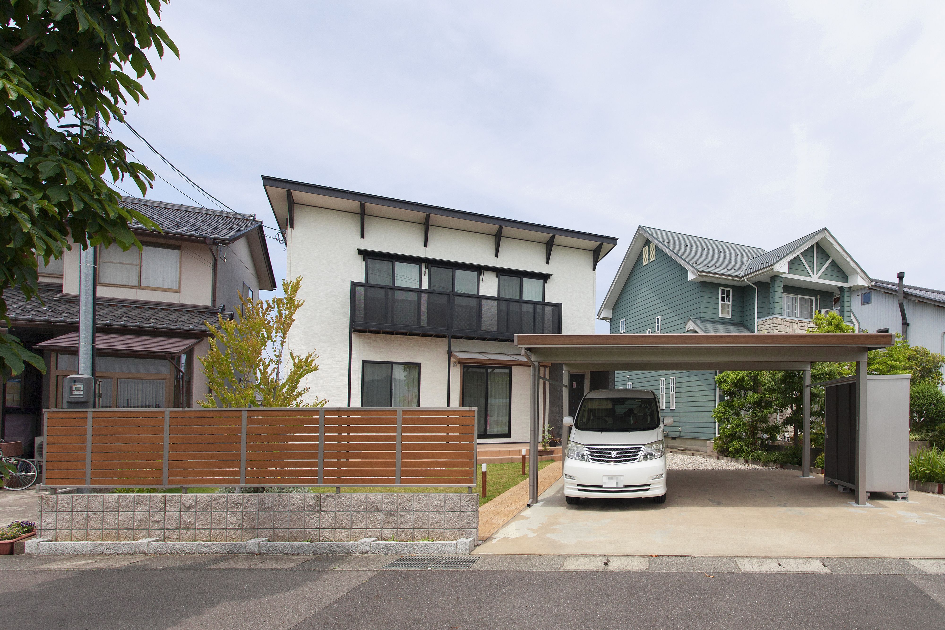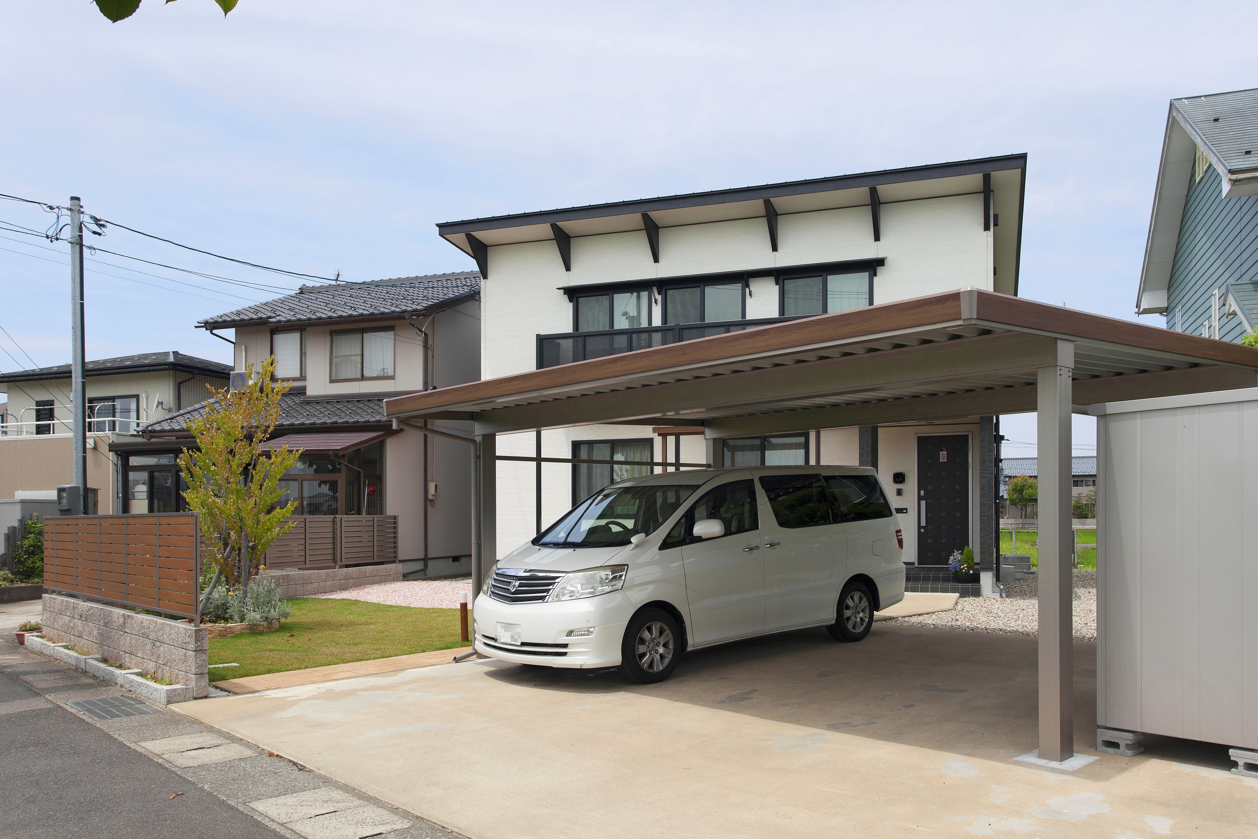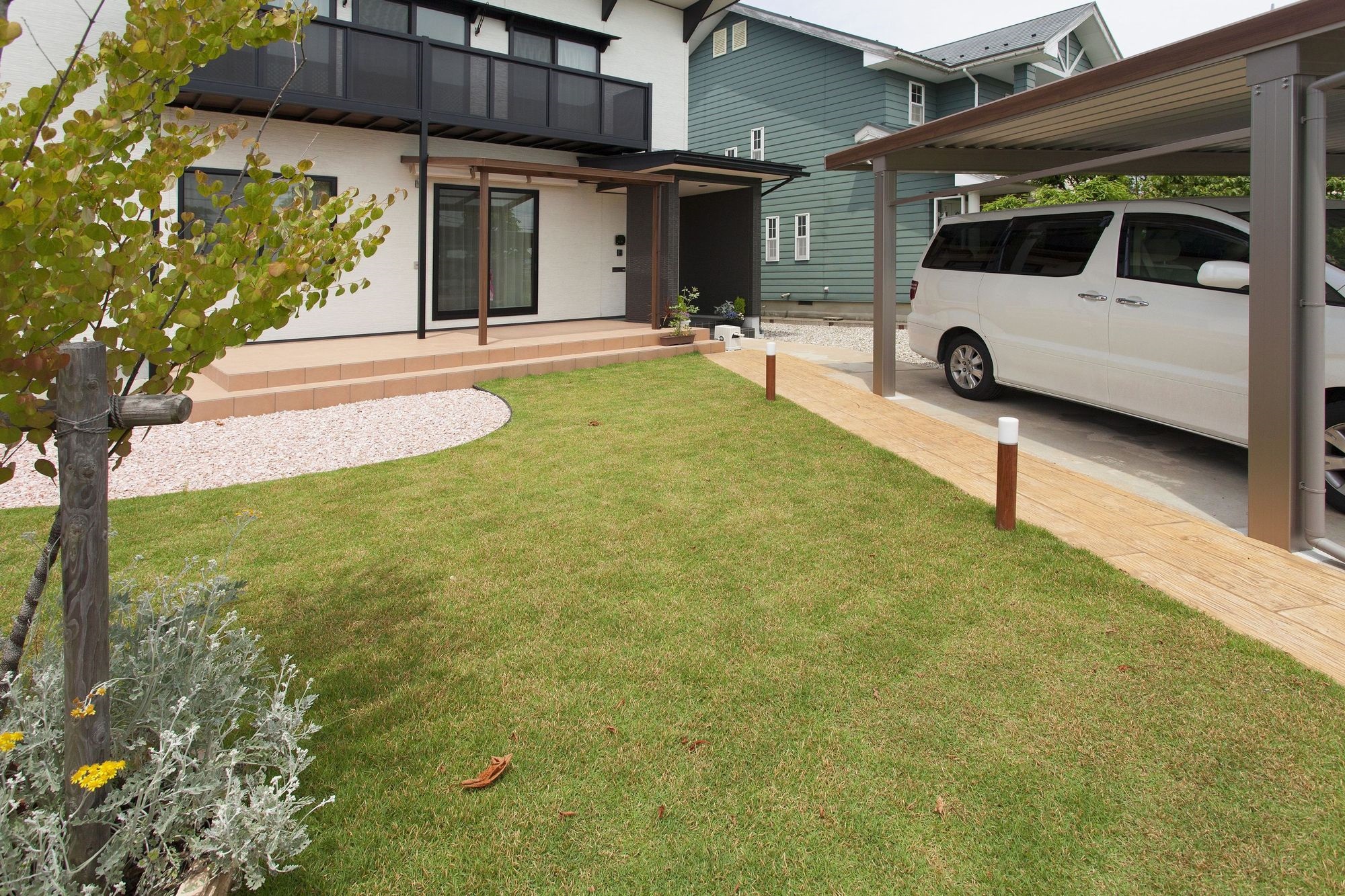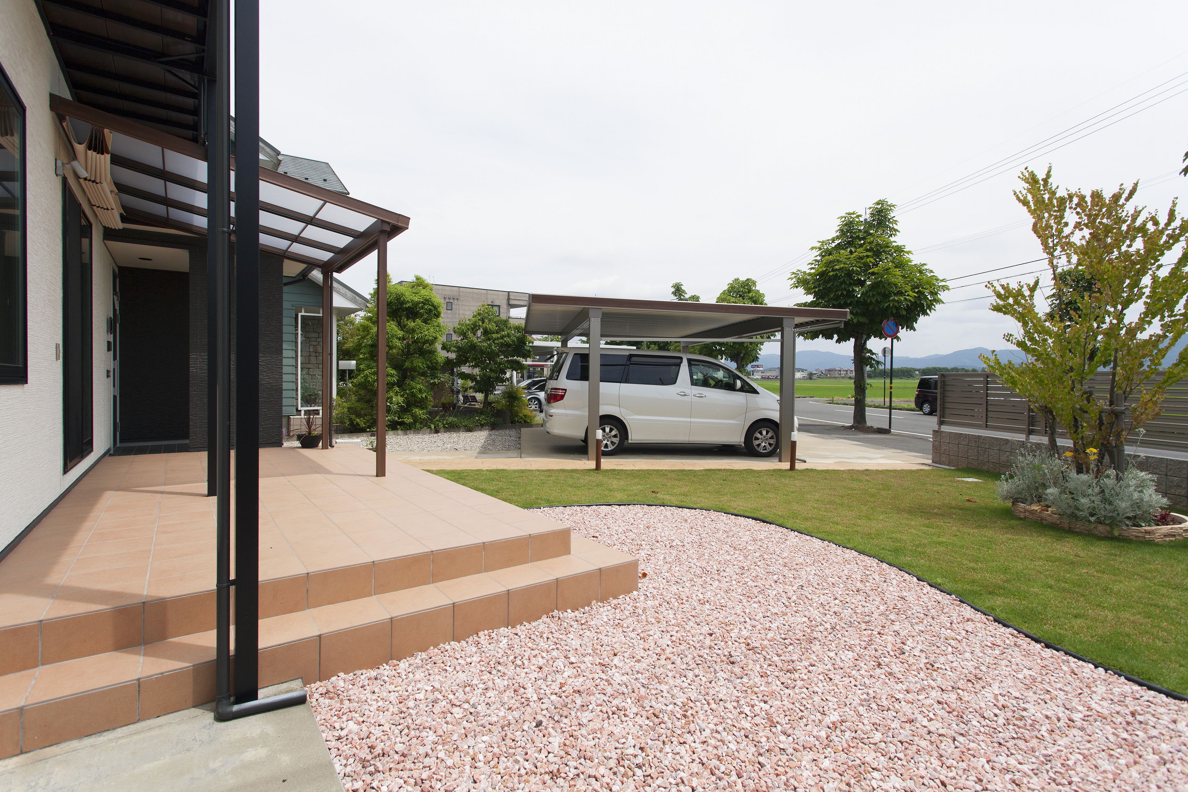 アプローチに沿わせてカーポートも配置しました。カーポートにはマテリアルカラー化粧枠を取り付けて、色を合わせました♪