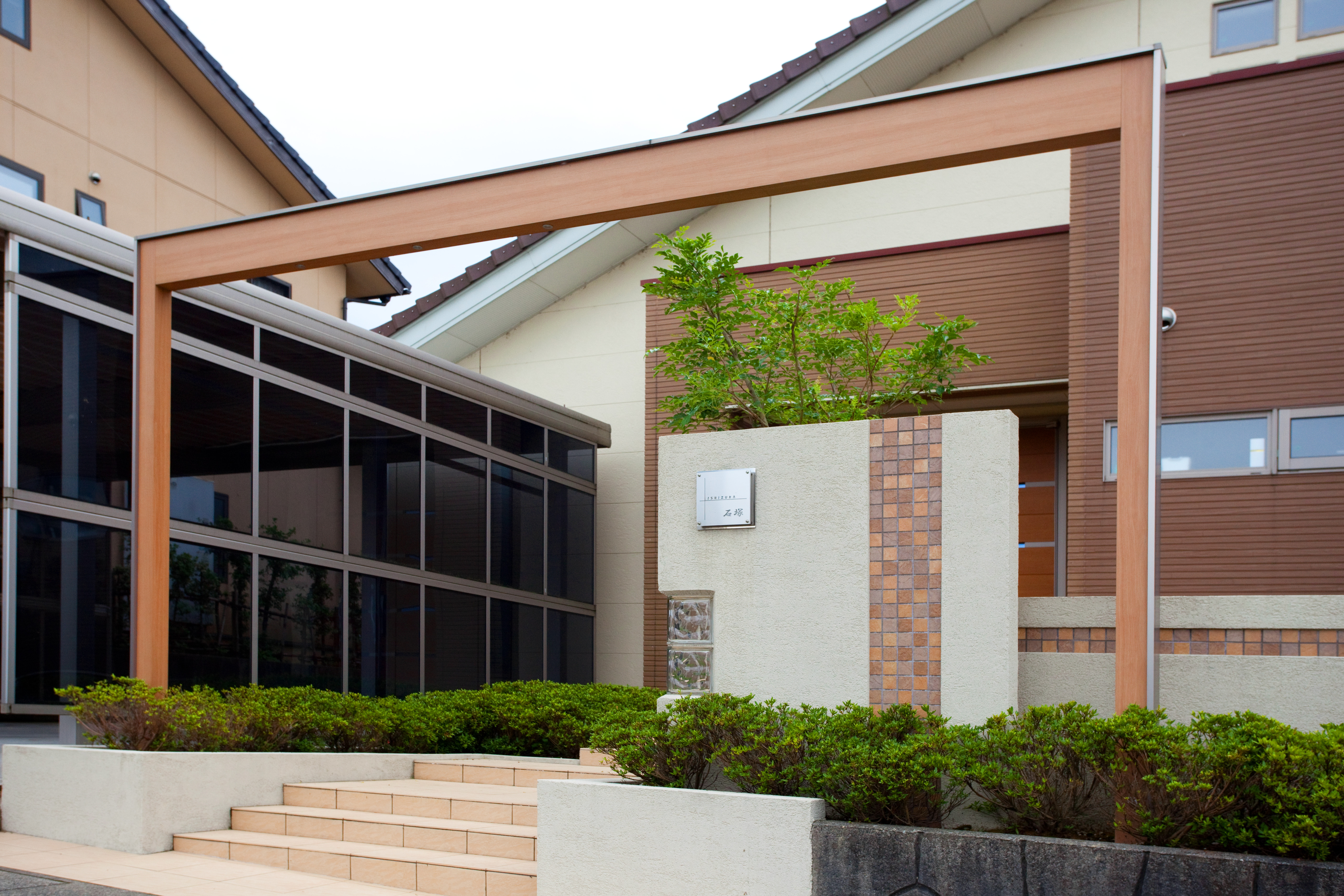 玄関ドア、サッシに合わせた色使いでアプローチスペースに立体感を出しました。