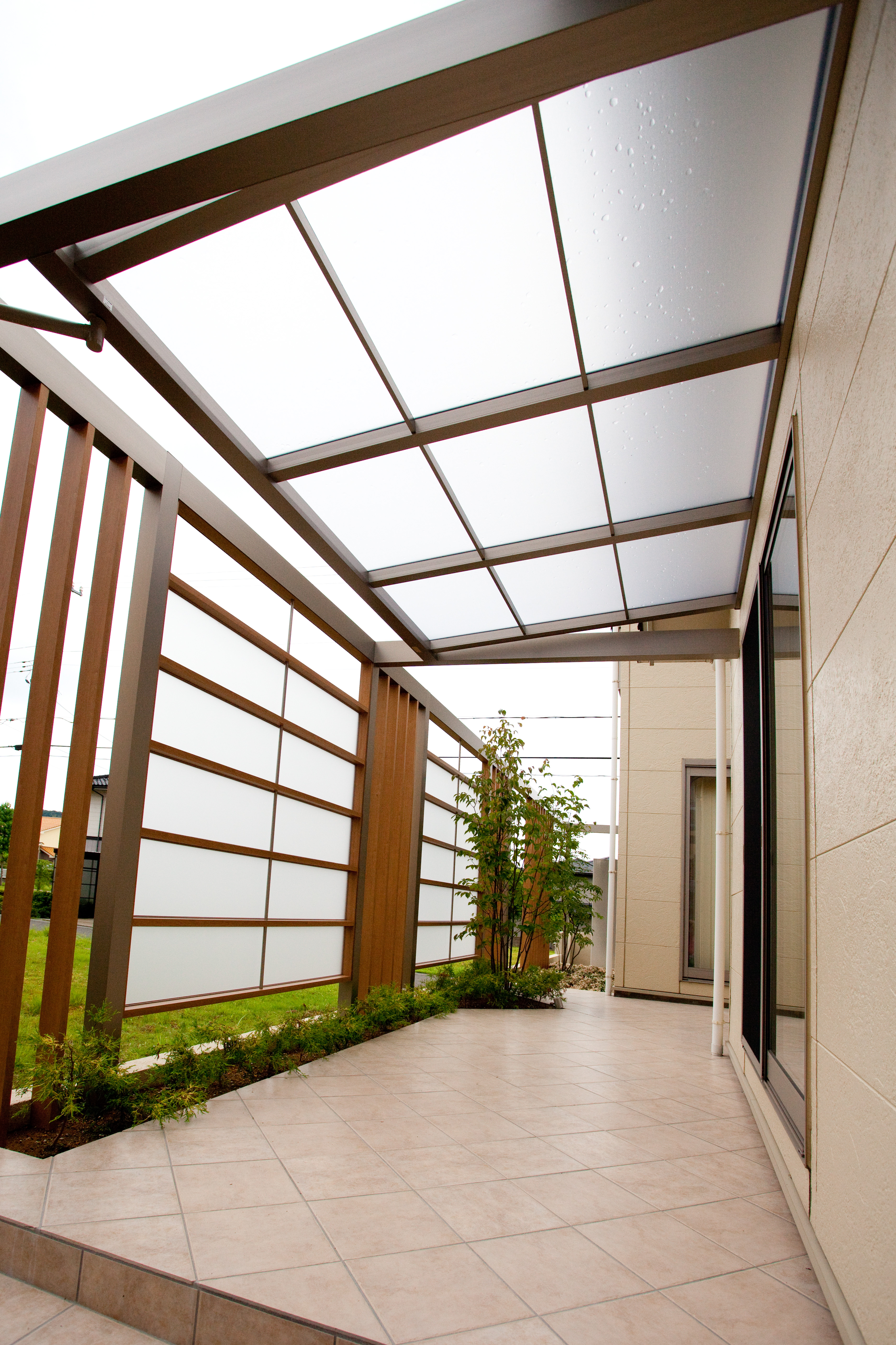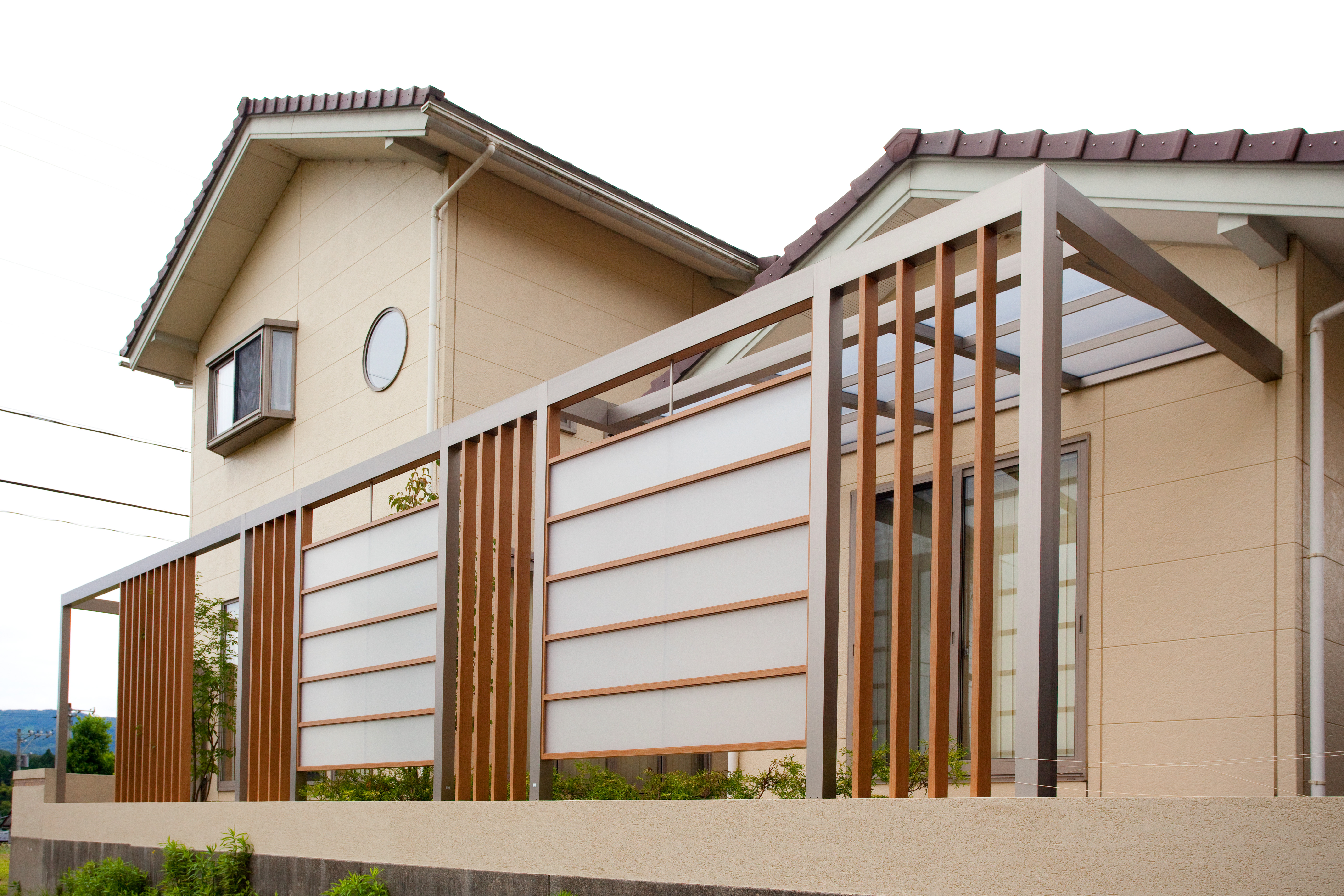 なにも無い庭の境界だった為、既存のタイルデッキが活用できていない、室内のプライバシーがまったく無い状況でした。風や光が入りつつ、プライバシーを守りながらの外観のデザイン調和をコンセプトに設計しました。