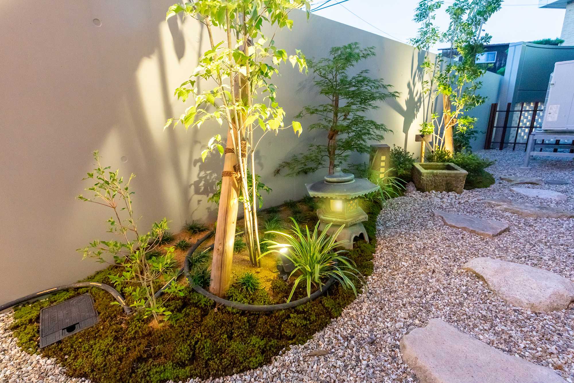 また、メンテナンスフリーの人工芝の庭も美しいライトアップで幻想的に演出しました。