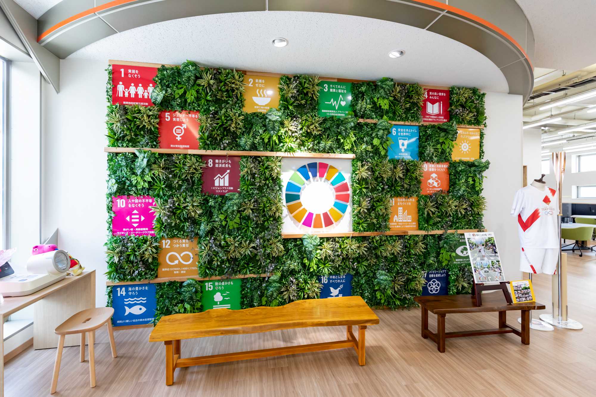建物中のロビーには人工植物の壁面緑化で管理不要のみずみずしいエントランスを演出。