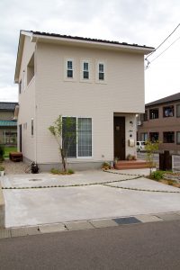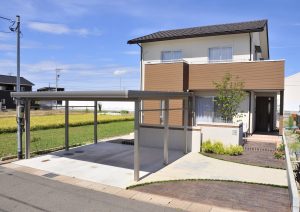 敷地のライン取りの為に、デザインコンクリートを設置。ローメンテナンスで格好良い雰囲気を作り出します。カーポートは、雪に強い三協アルミのものを使用。車の乗り入れも雨風にあたらず楽チンです。