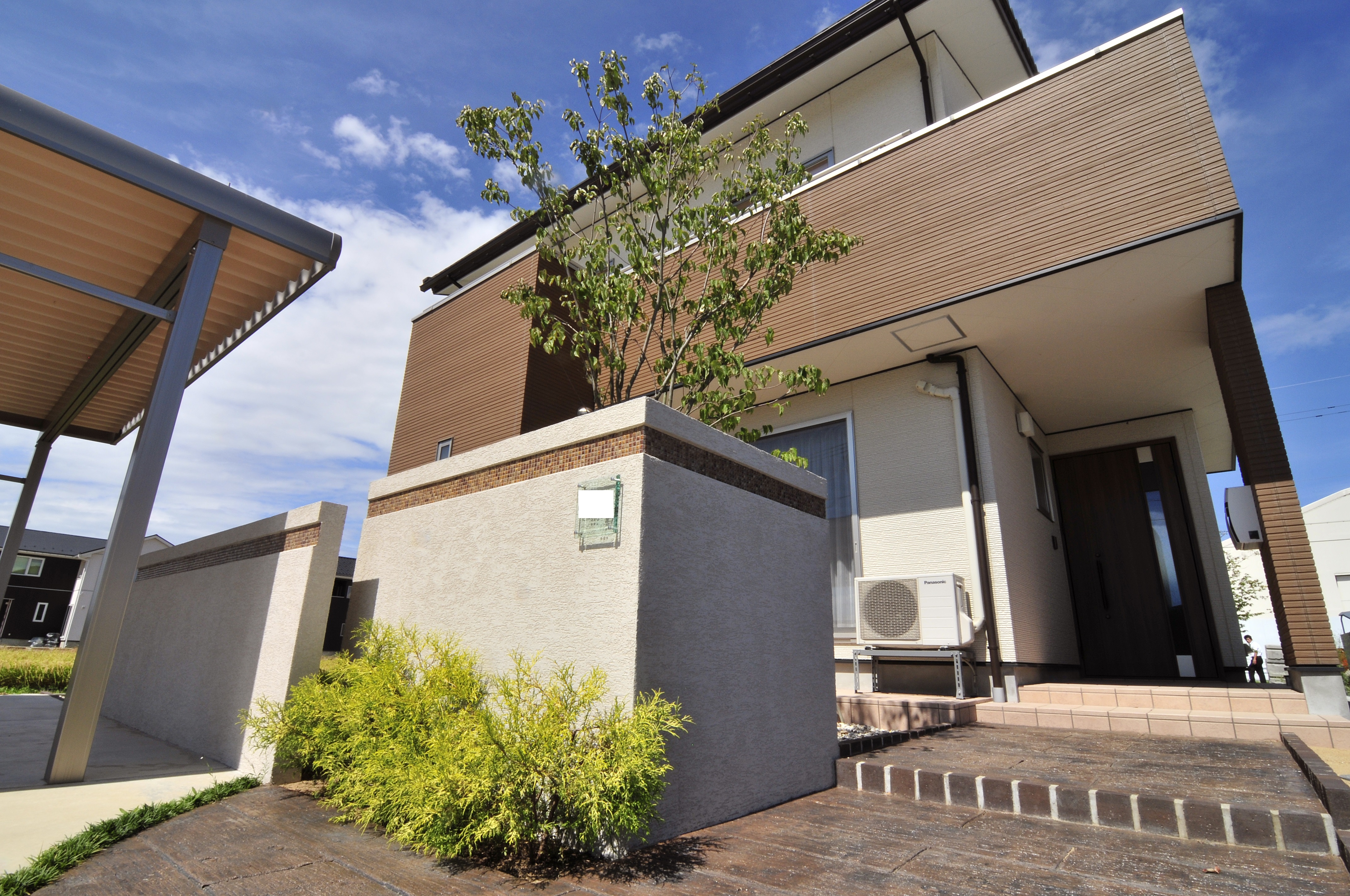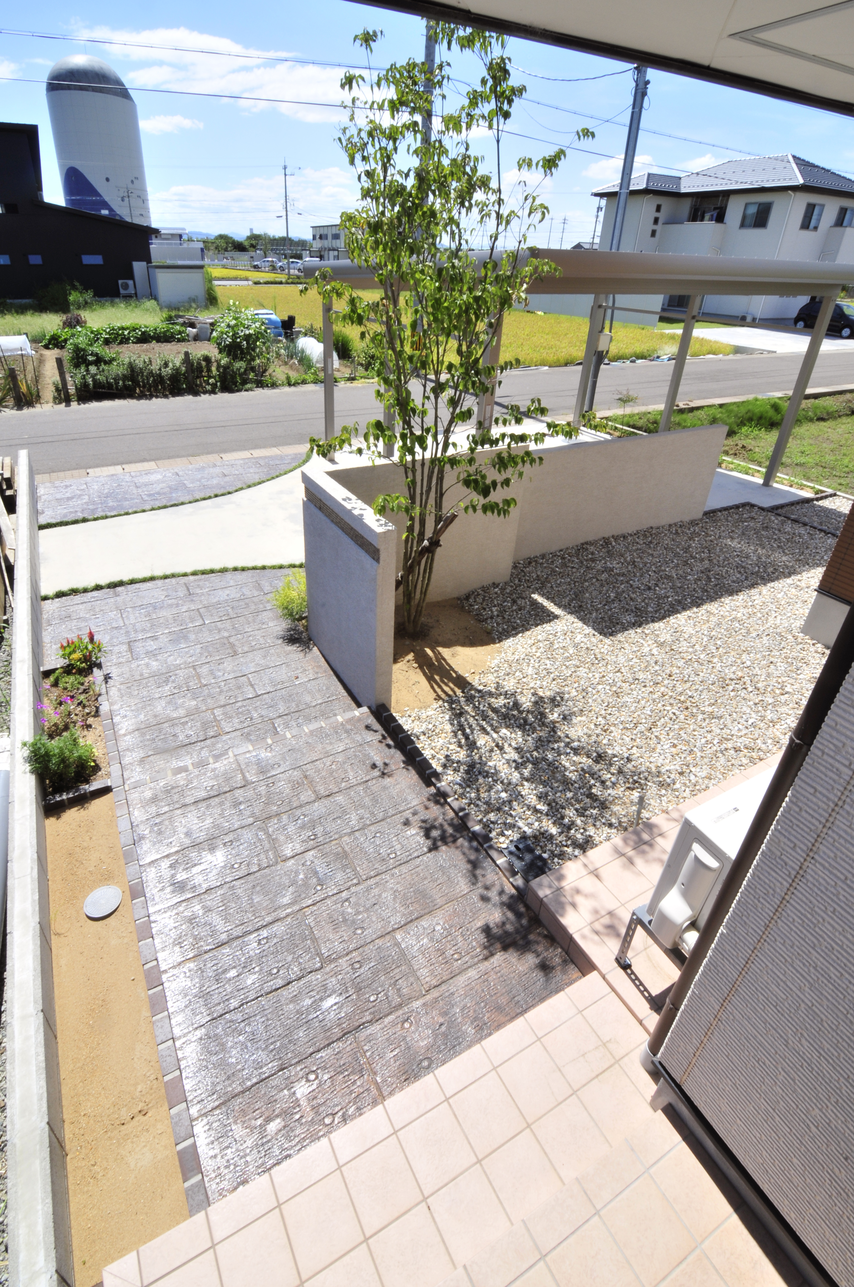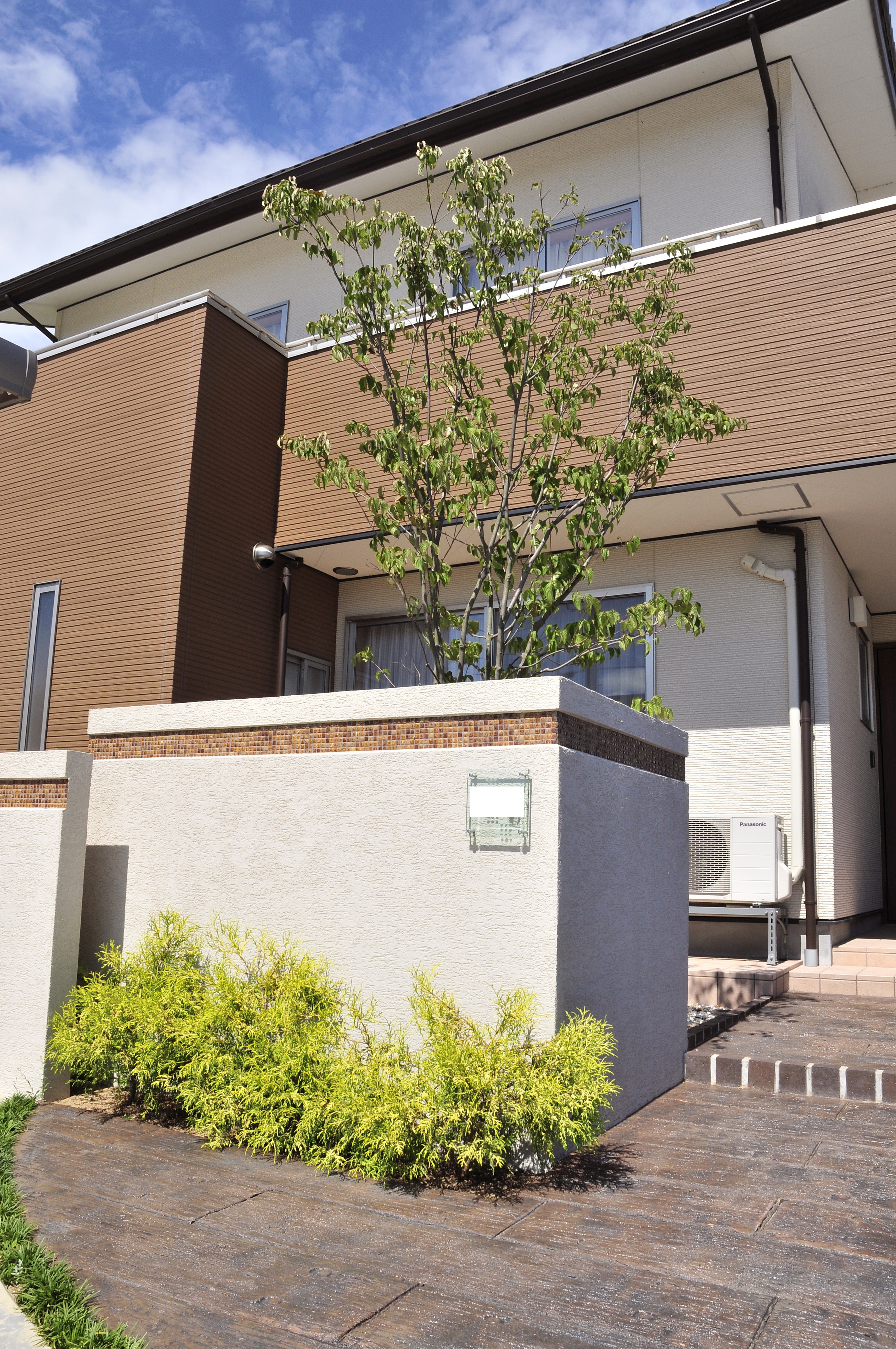 建物の茶色とホワイトの外壁に合せて、デザインコンクリート(枕木)でアプローチを引締め、カーポートに合せて柔らかいラインをタマリュウで入れる事でナチュラルな外構にしました。モニュメントにもモザイクタイルをラインで入れてスッキリとした奥行きのある配置にしました。緑の綺麗な明るいエクステリアに仕上がりました。
