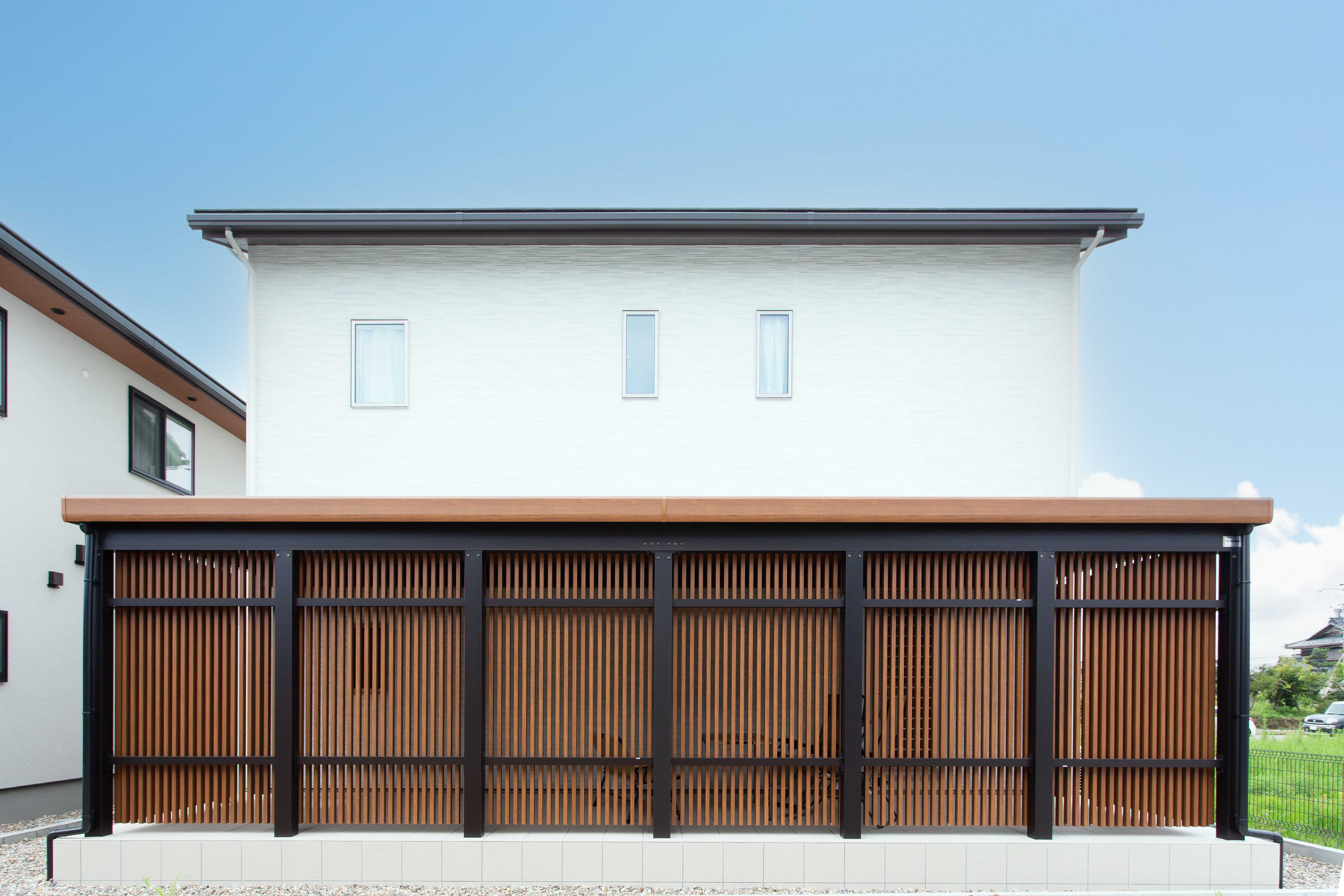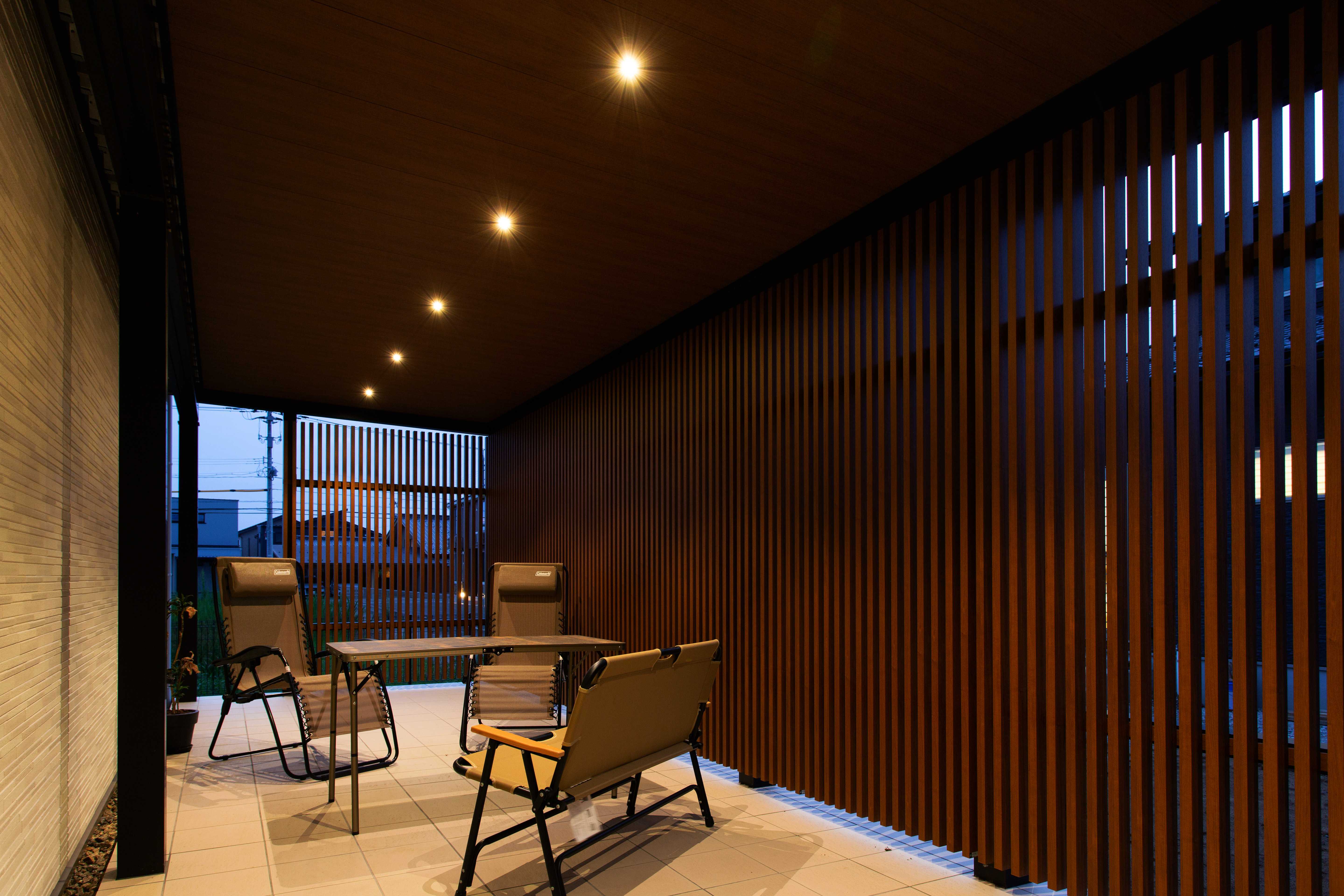 住宅が隣接する北向きのお庭に、完全なプライベート空間を。 外の風を取り入れながら周りの視線は遮りたい。解放感とプライベート感をどちらも重視し、積雪対応のカーポートに木目調のアルミ格子を使ったプライベートテラス空間をつくりました。 勝手口と繋げているため料理の支度や片付けをしやすい動線で気軽にアウトドアリビングを楽しめます。