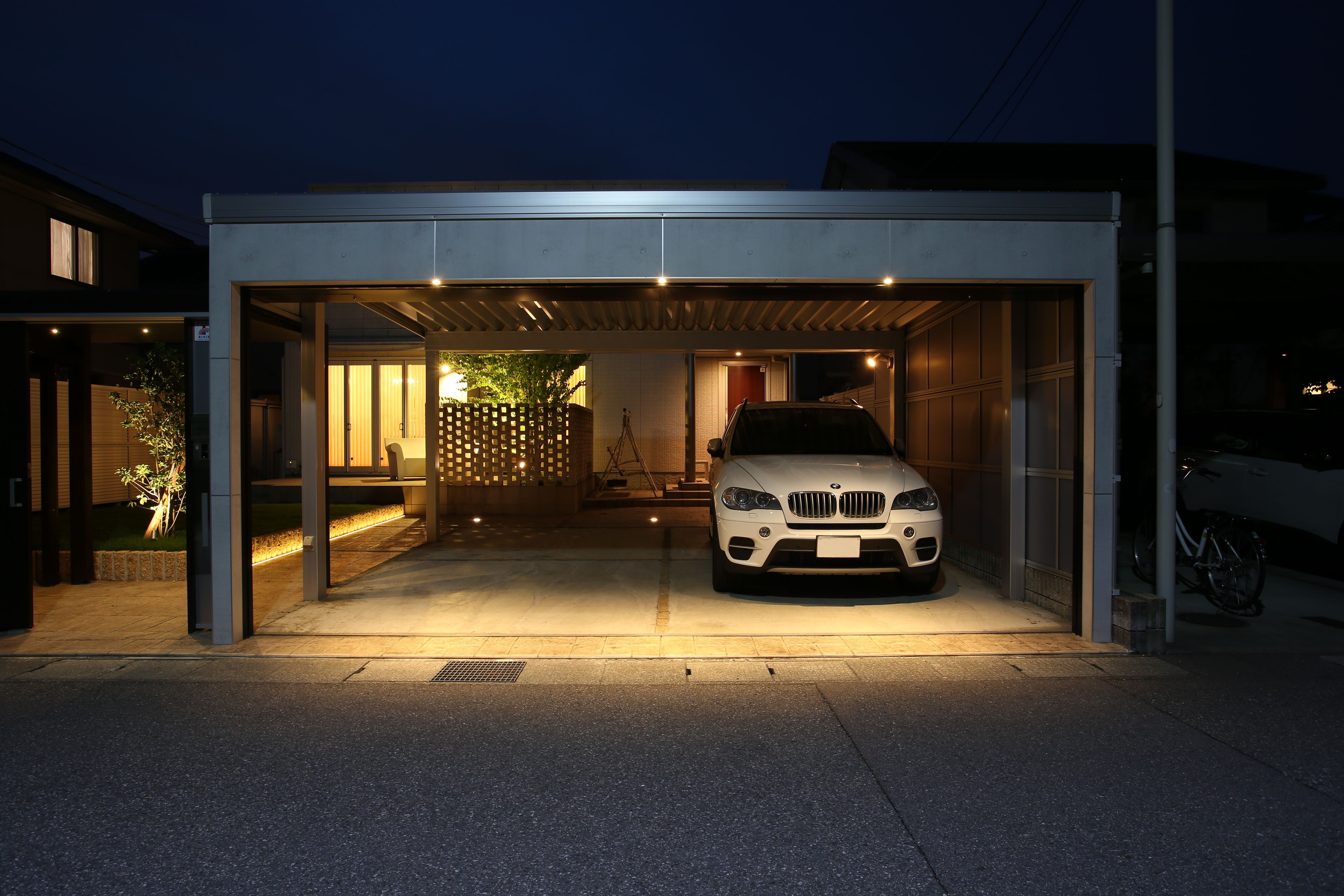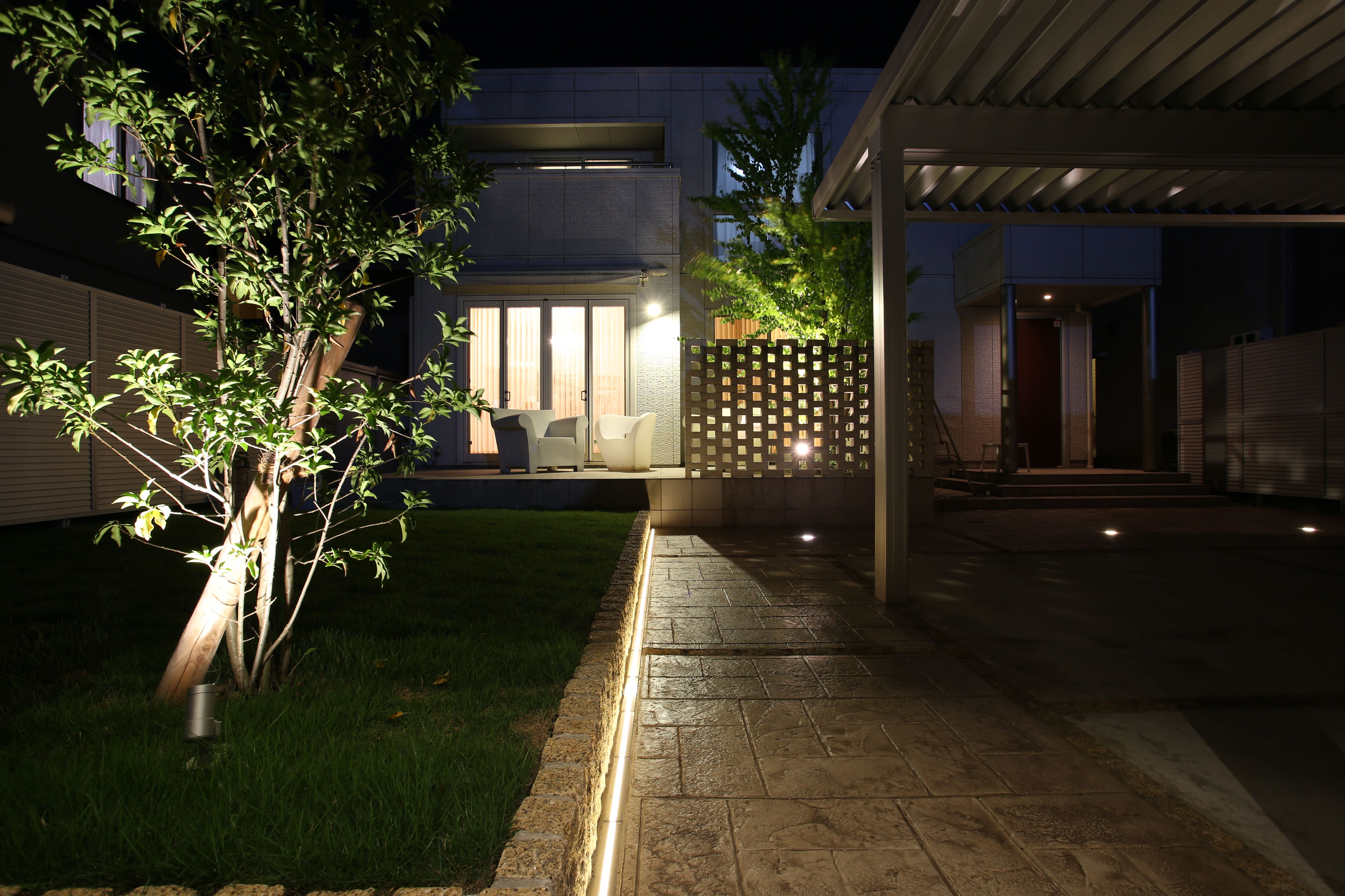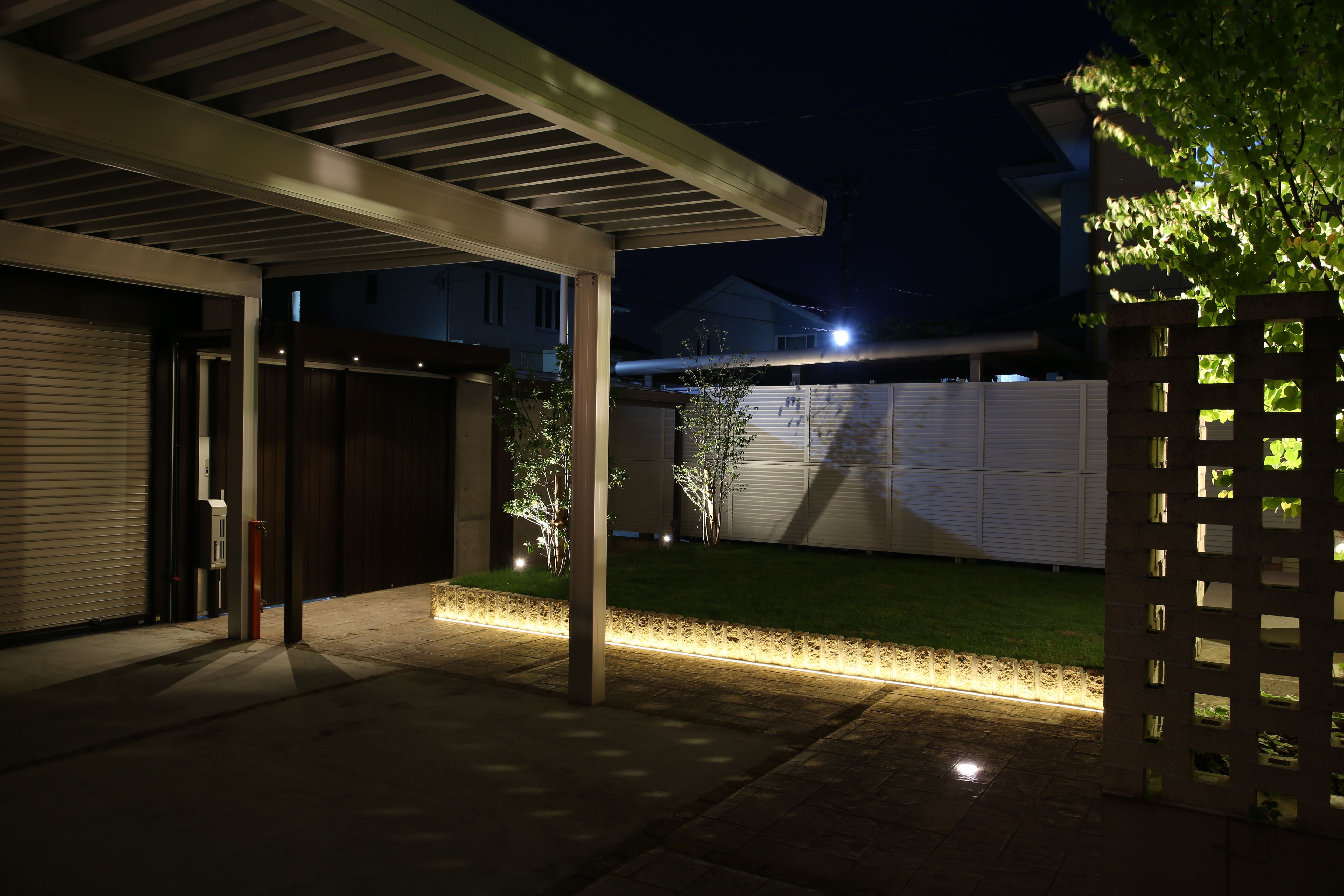 夜には優しい光でライトアップされます。 ダウンライトやフラットライト、スポットライトなど いろいろな照らし方を入れこみました。