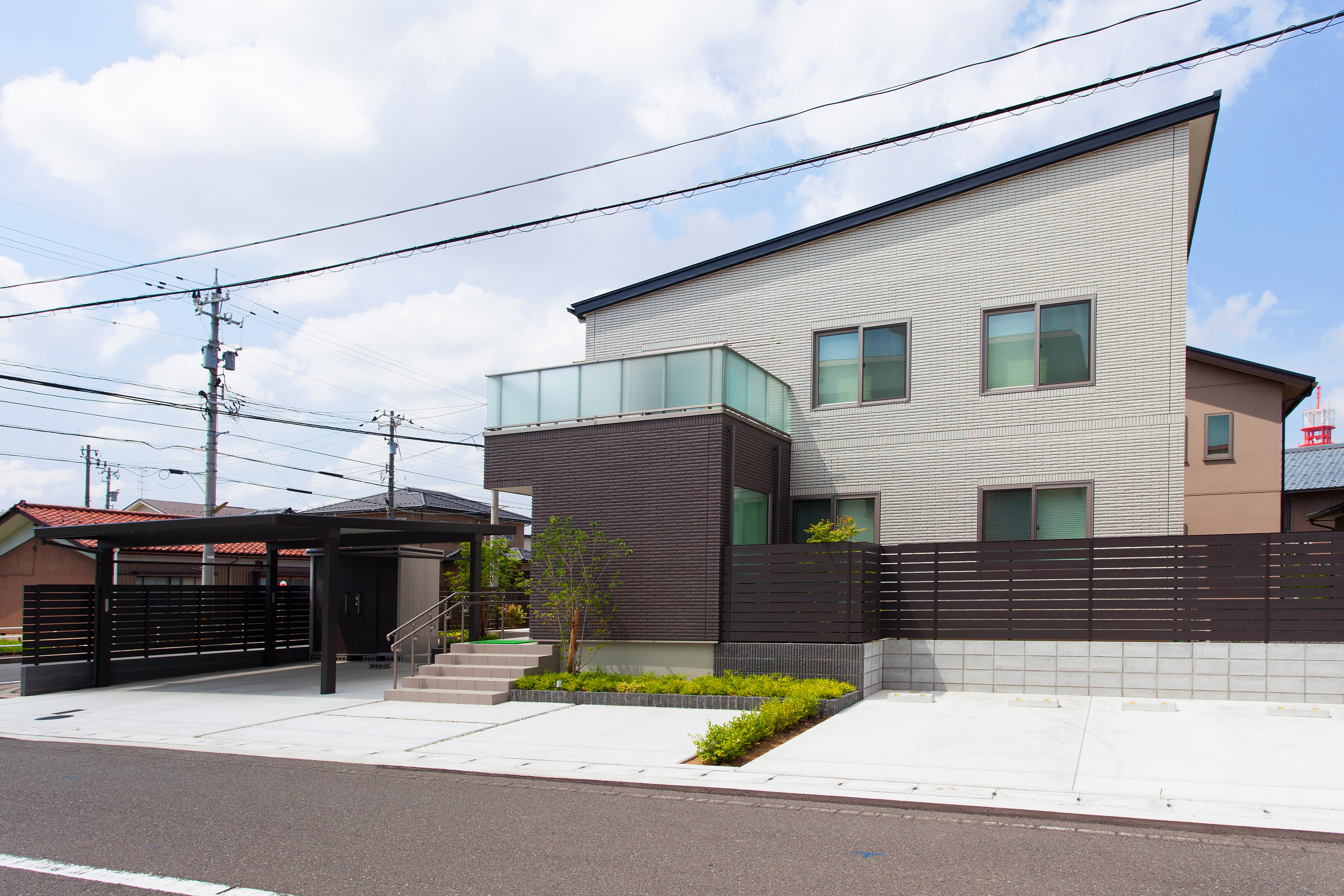 高めのフェンスで周囲を囲ったセミオープン外構。住宅の前には車を宅に停めることができるスペースが広がりカーポートも完備。