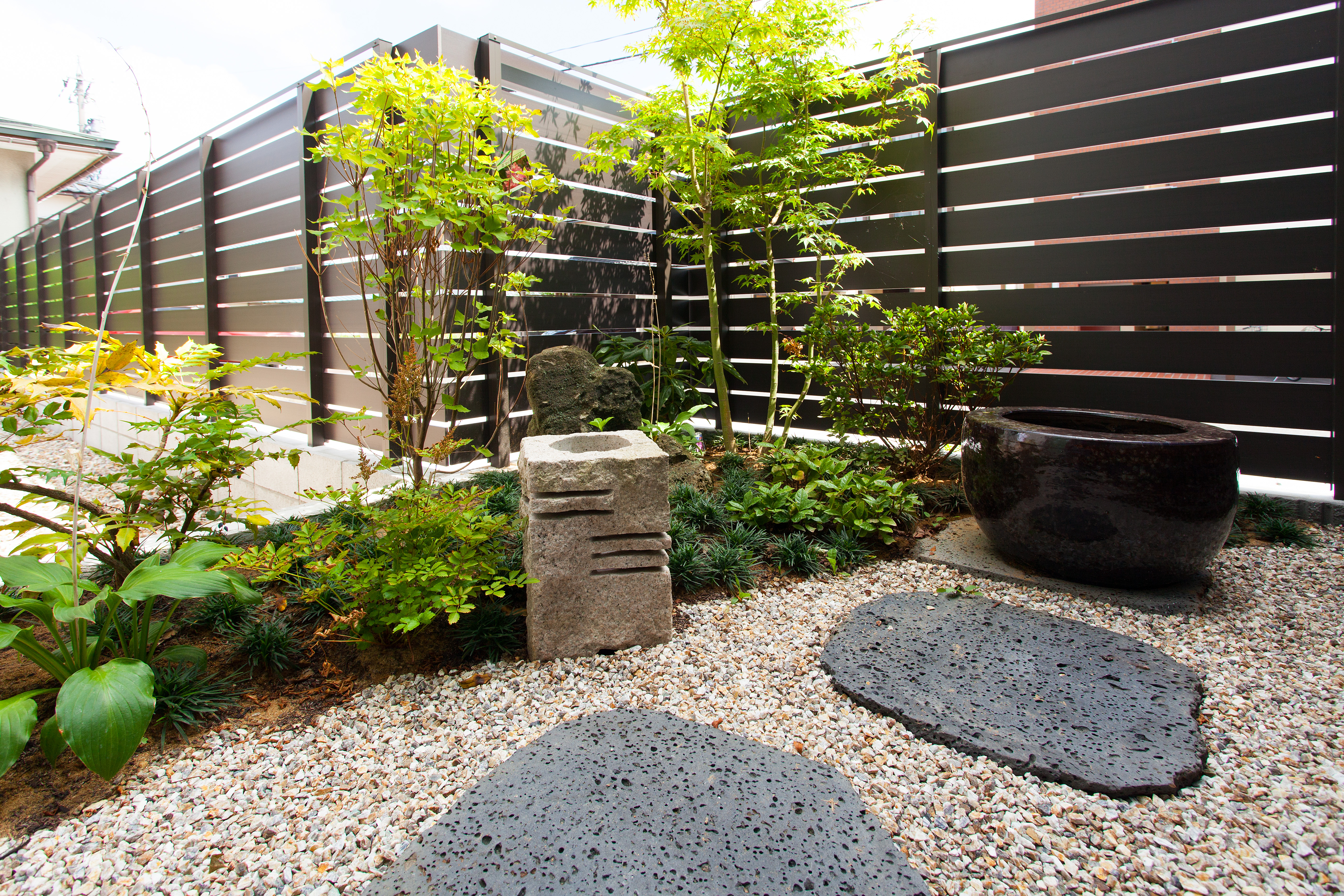 敷地を囲むように配置されたBウッドフェンスと化粧ブロックは濃い目の色を選び、直線的に存在する洗練された印象を引き立たせるのは、シンボルツリーと低木のフィリフェラオーレア等々。道路側からフェンスの合間に覗く緑は、適度な柔らかさを感じさせます。