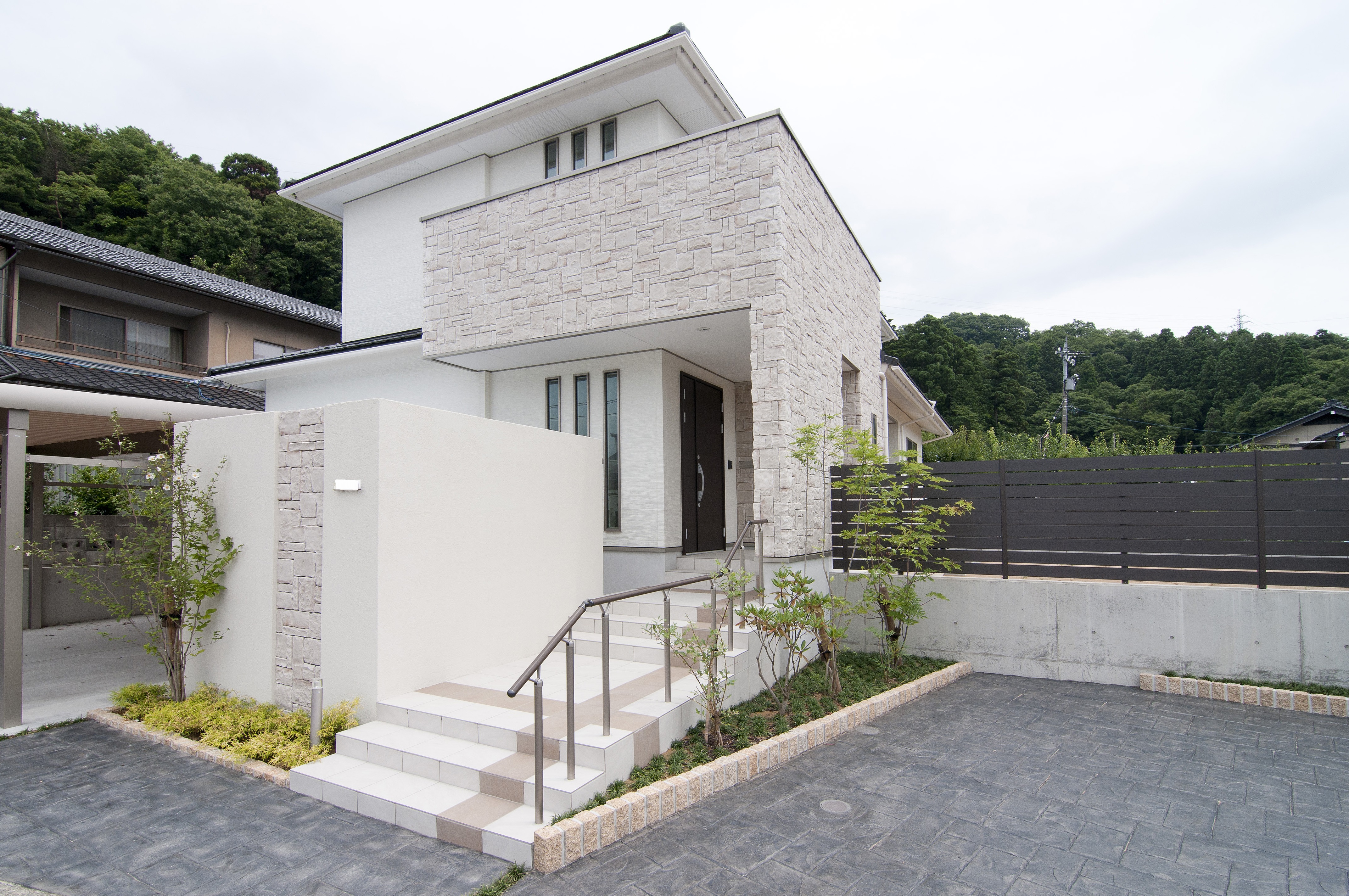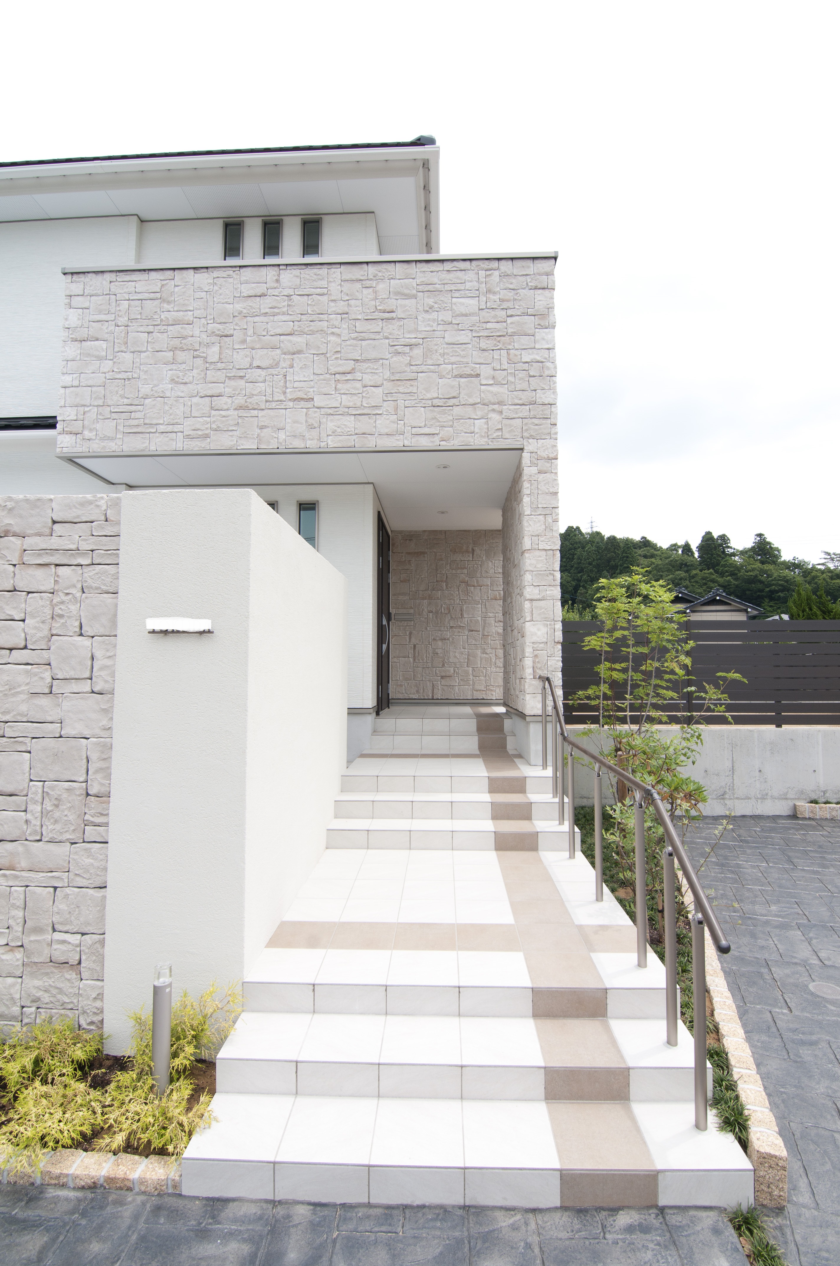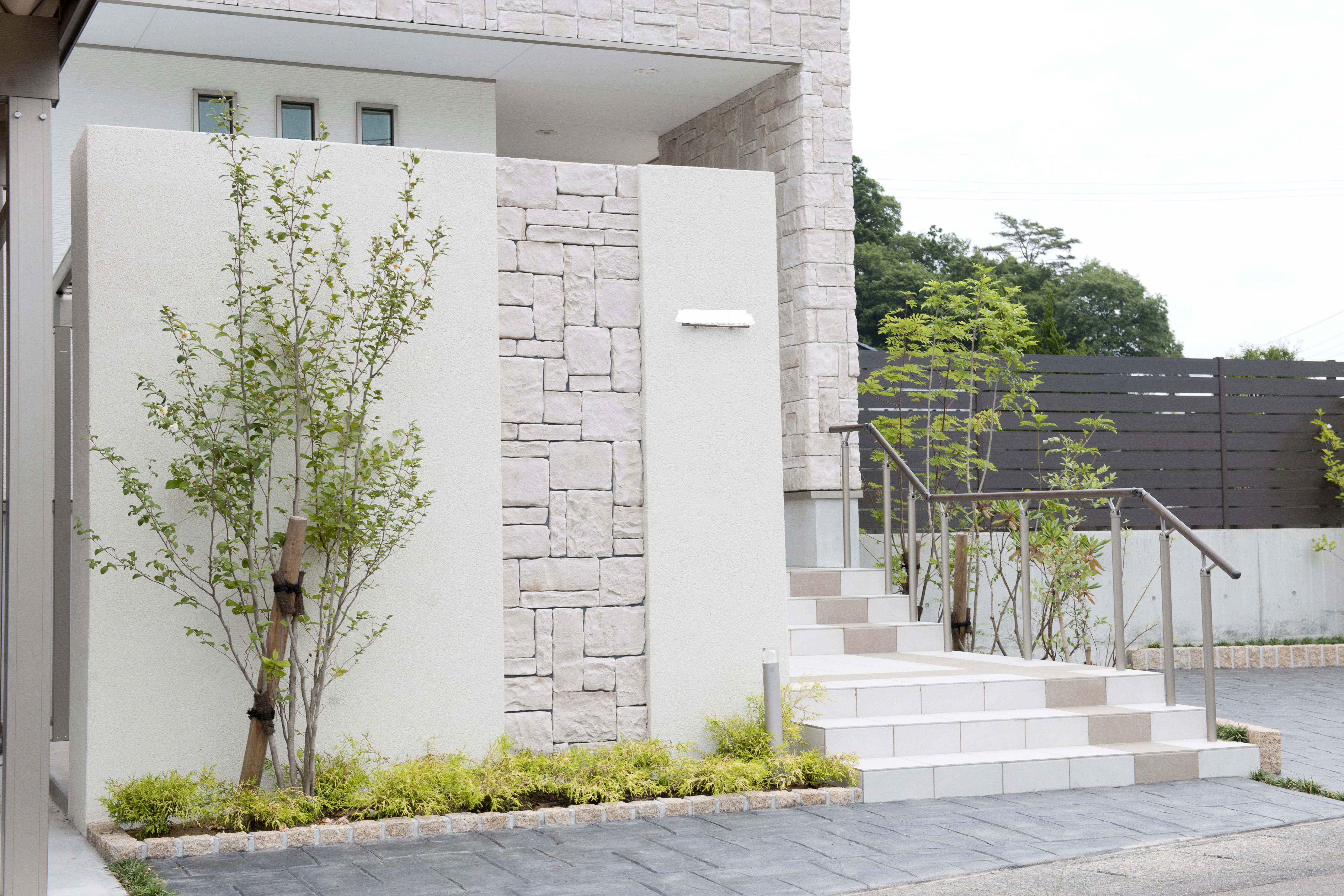 壁が白で統一された新築の外構工事でした。コンクリートは滑りにくい様にマットスタンプでシックなカラーで建物を引き立たせる様施工。ピンコロ石で花壇を囲う様に配置したアクセントにしました。建物と駐車スペースが極端に高さが違っていたので、安全な動線を確保する為に手すりを配置しました。表札やデザインされたブロックが配置された白いモニュメントは圧迫感のない様、植栽を近くに入れ柔らかい雰囲気に。後ろには、見えない様に物置、自転車置き場をつけました。