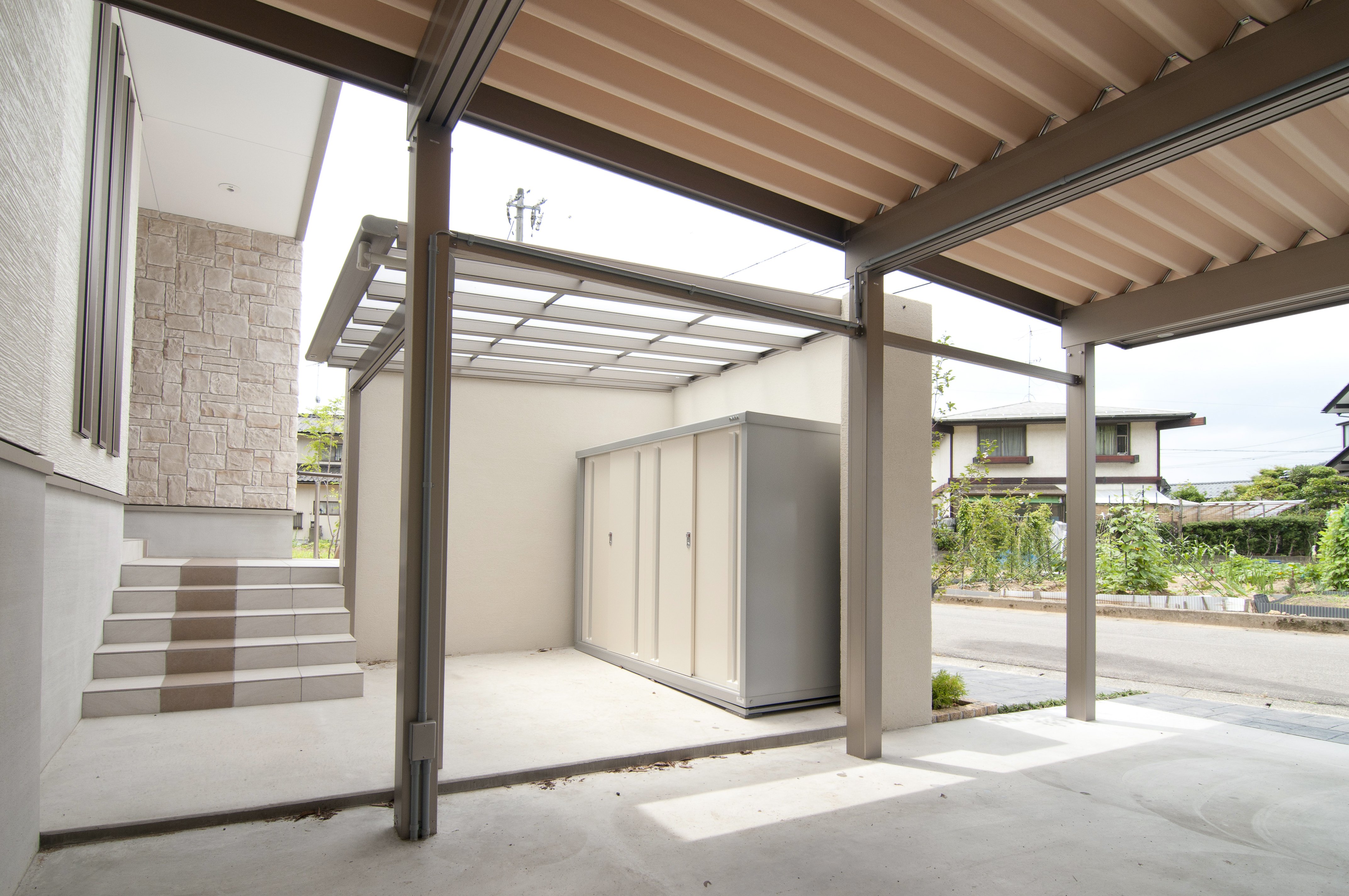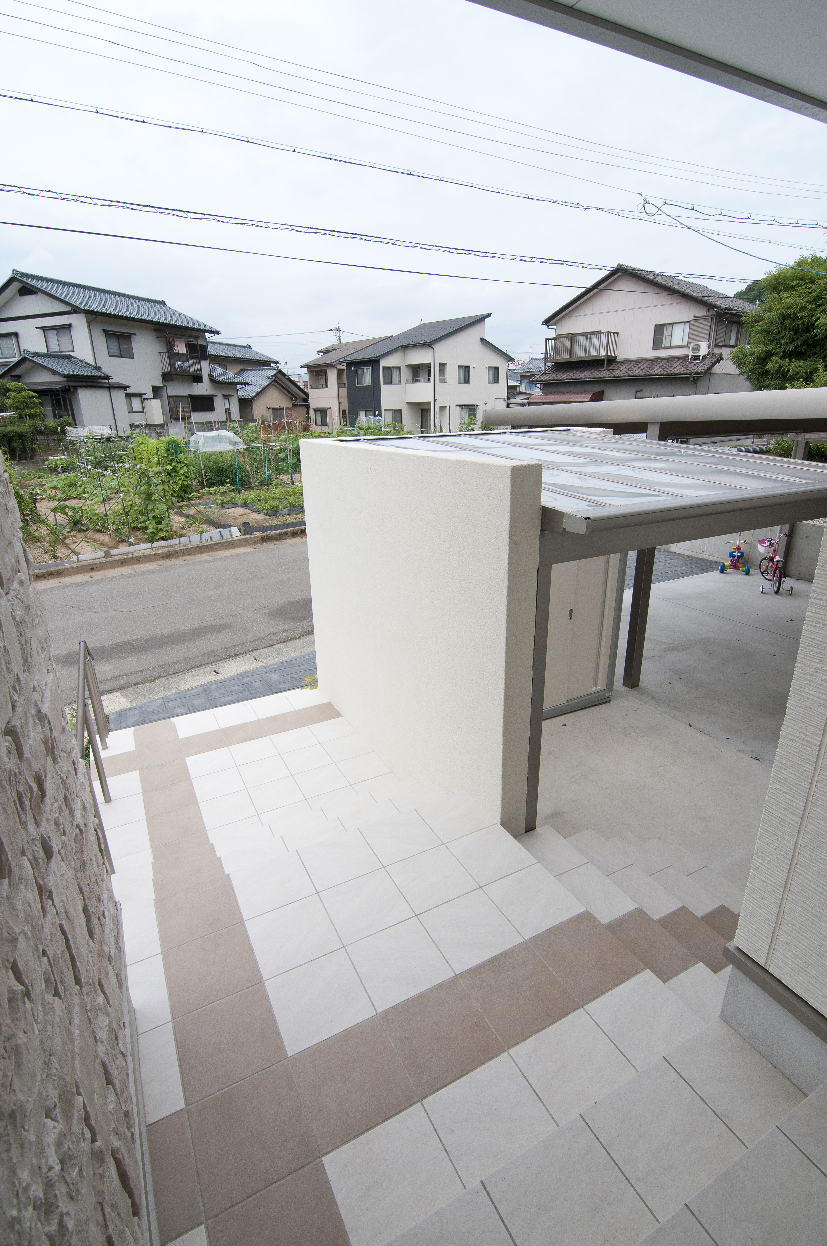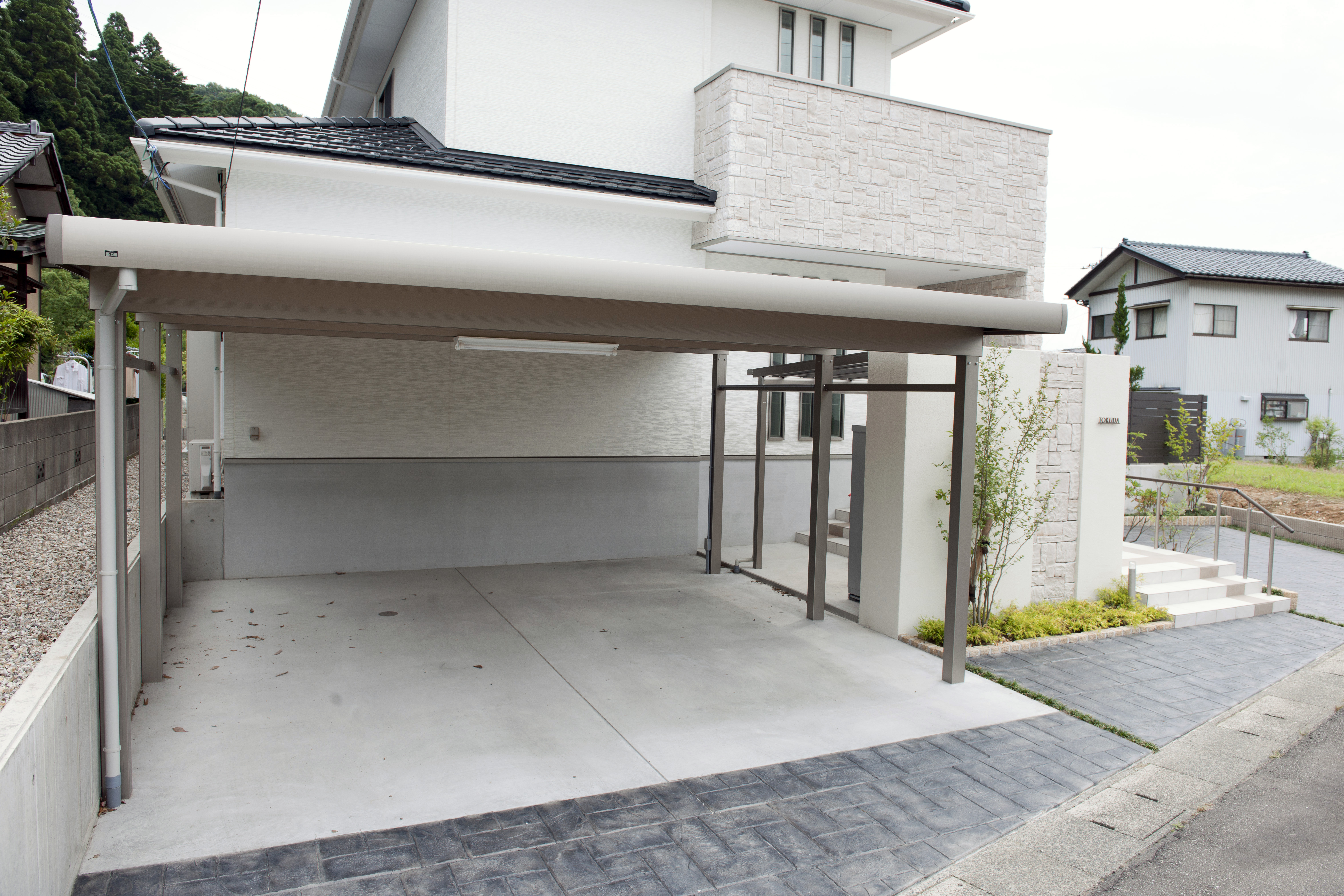 壁が白で統一された新築の外構工事でした。コンクリートは滑りにくい様にマットスタンプでシックなカラーで建物を引き立たせる様施工。ピンコロ石で花壇を囲う様に配置したアクセントにしました。建物と駐車スペースが極端に高さが違っていたので、安全な動線を確保する為に手すりを配置しました。表札やデザインされたブロックが配置された白いモニュメントは圧迫感のない様、植栽を近くに入れ柔らかい雰囲気に。後ろには、見えない様に物置、自転車置き場をつけました。