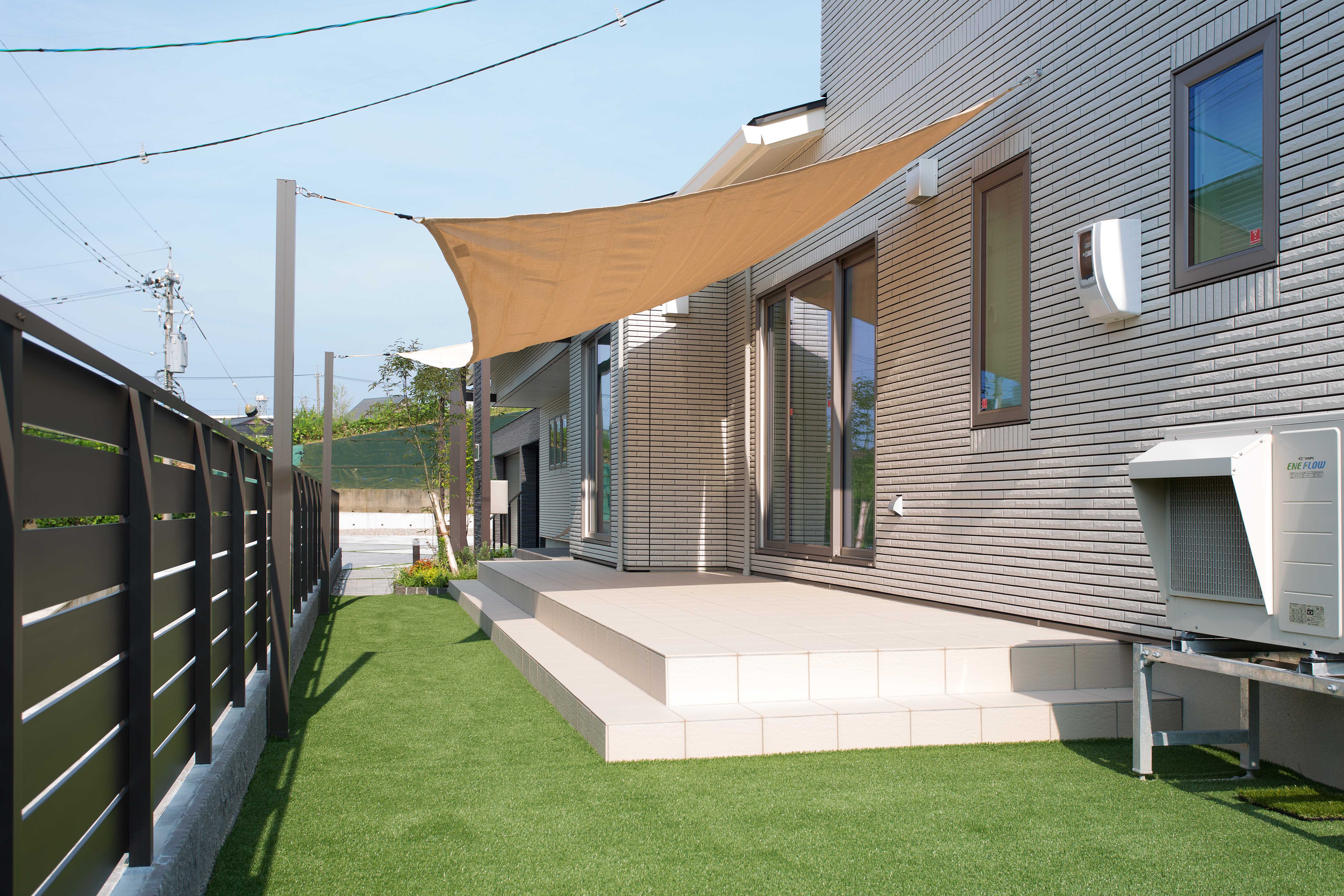 ガーデンスペースは、タイルデッキ・シェード・人工芝を使った快適空間に。