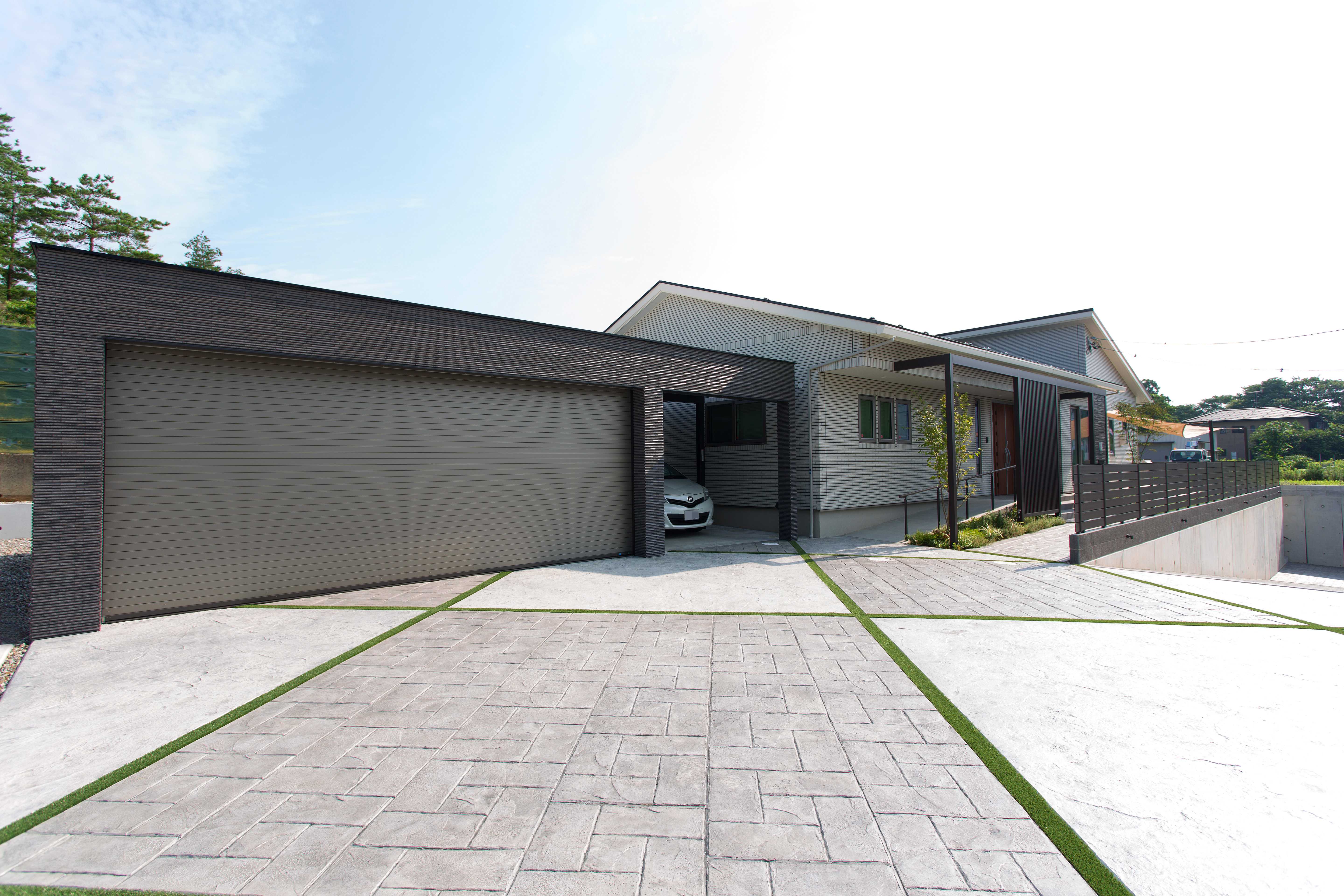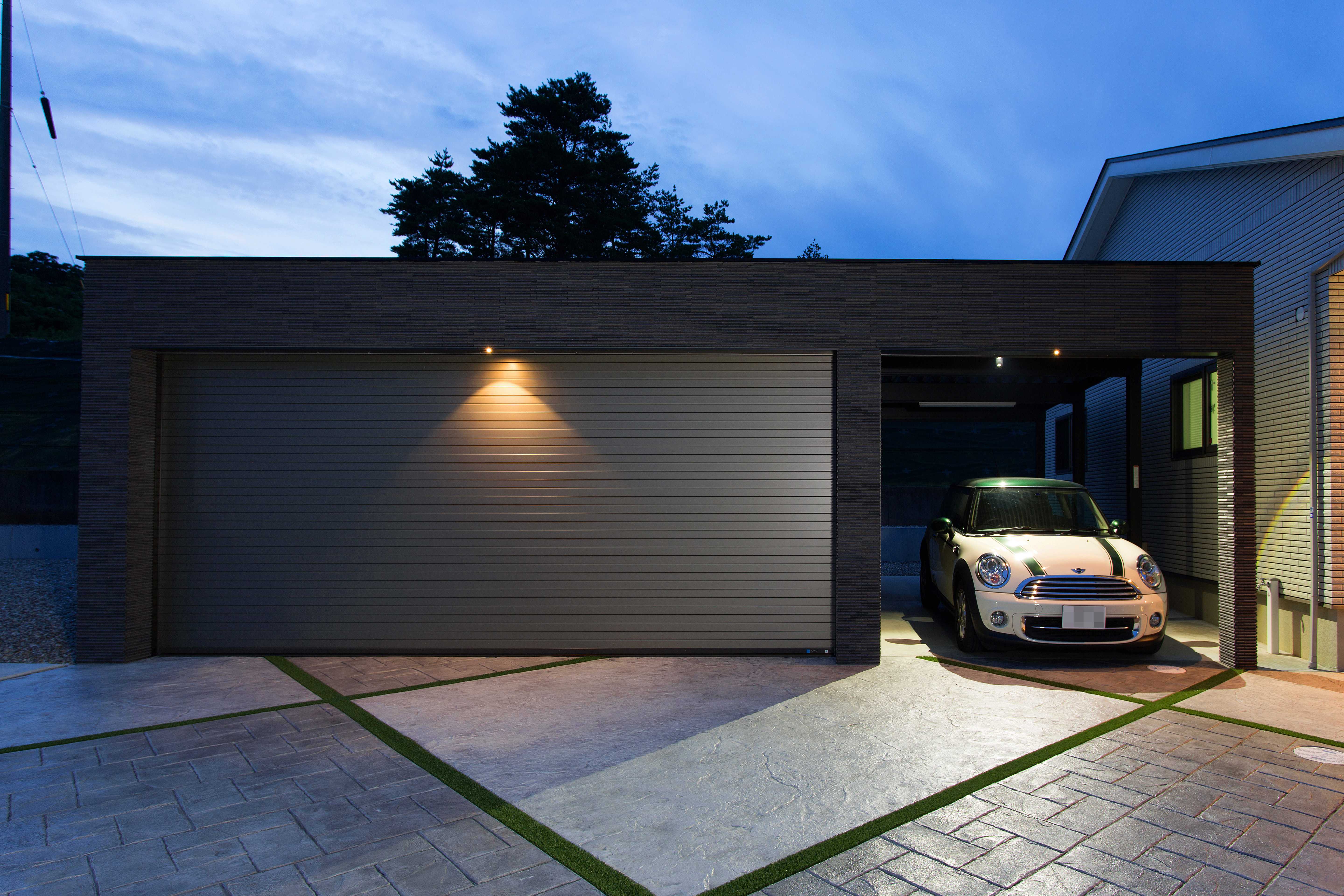 ガレージは建物とマッチングさせたタイルを貼って、重厚で高級感のある車庫ガレージを演出。