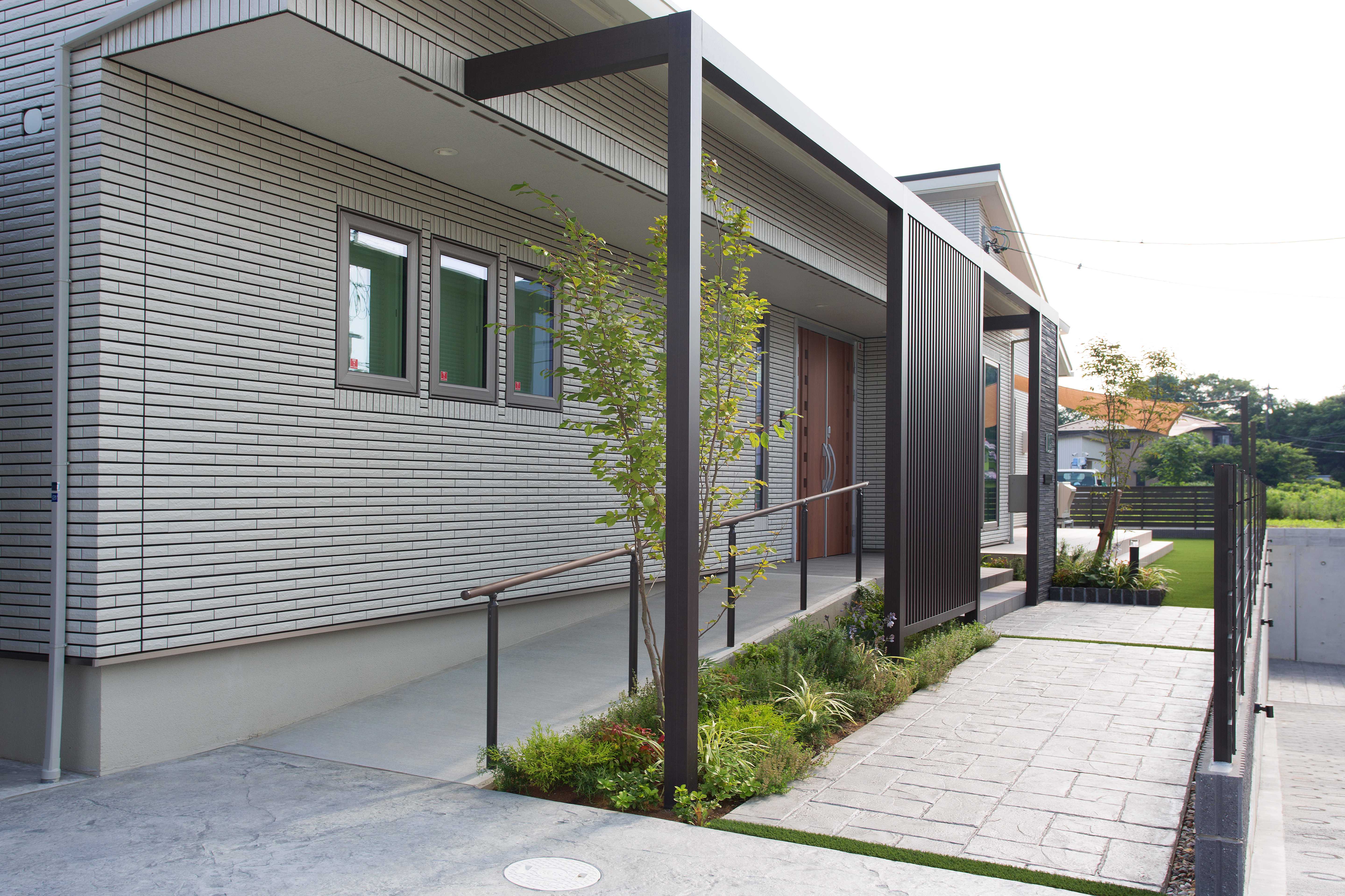 スロープのある門周りや玄関周りに、プラスGのアルミ材を組み合わせることでメリハリのある外構に仕上がりました。