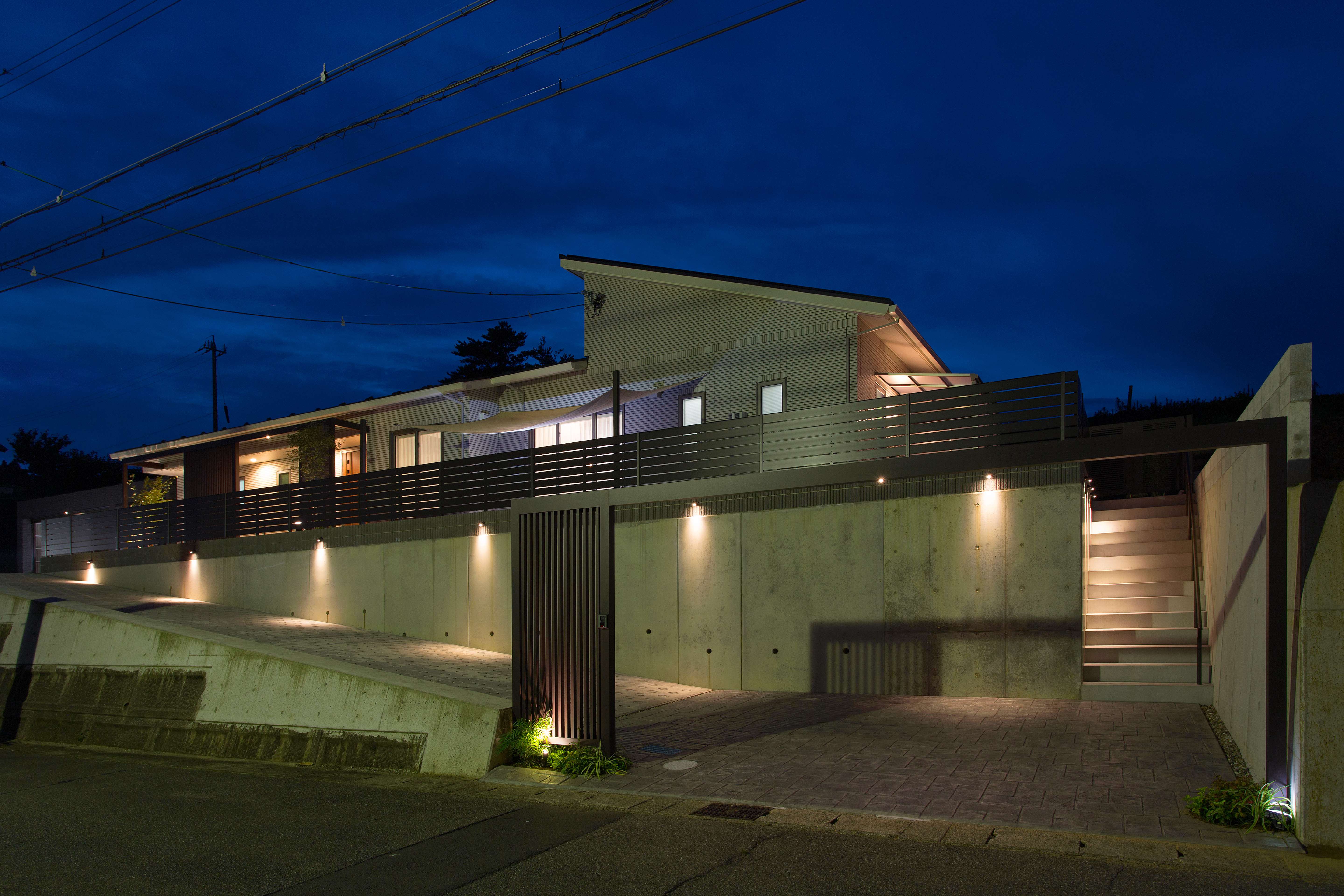 高台の平屋、スロープの線が映えるスタイリッシュな外構