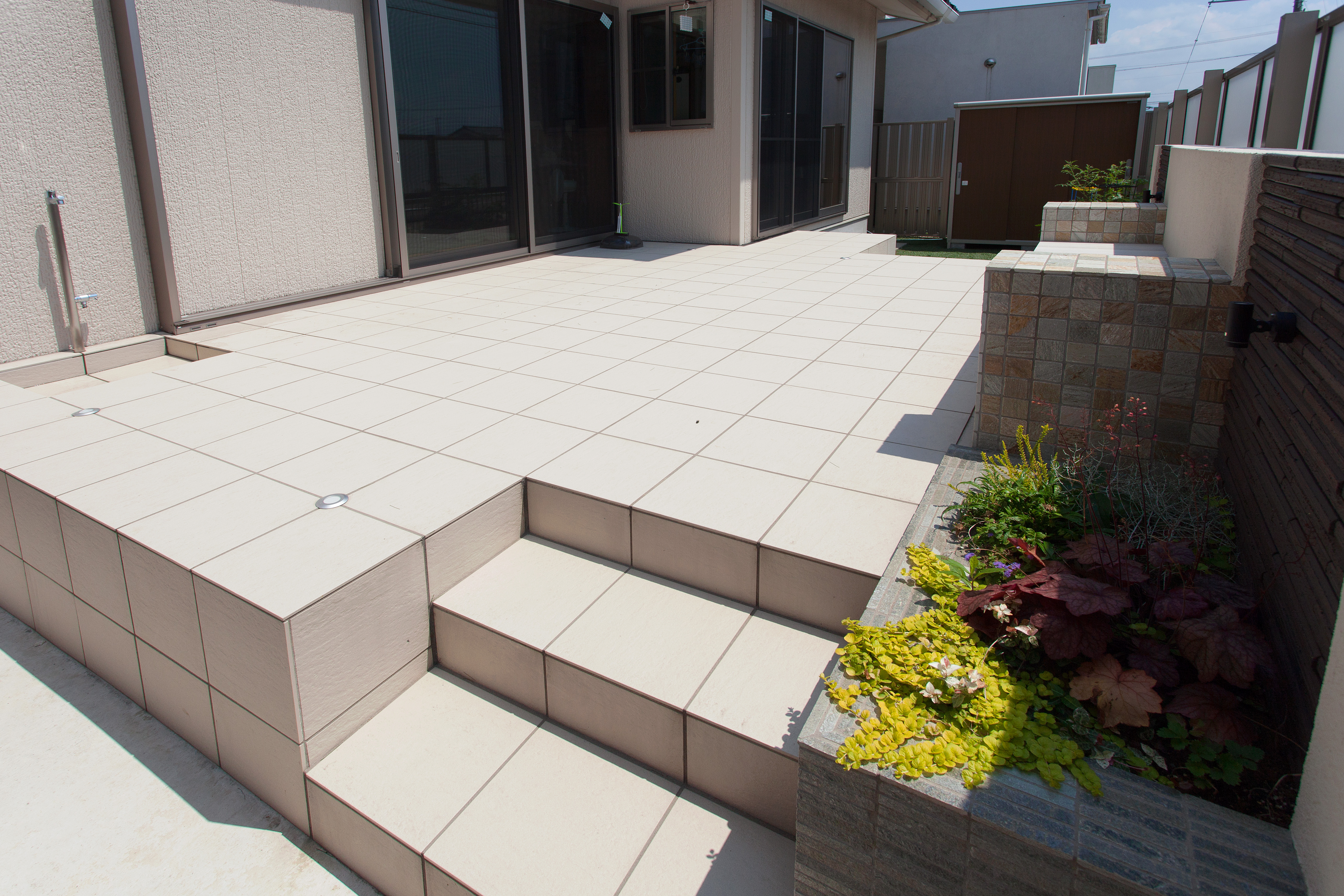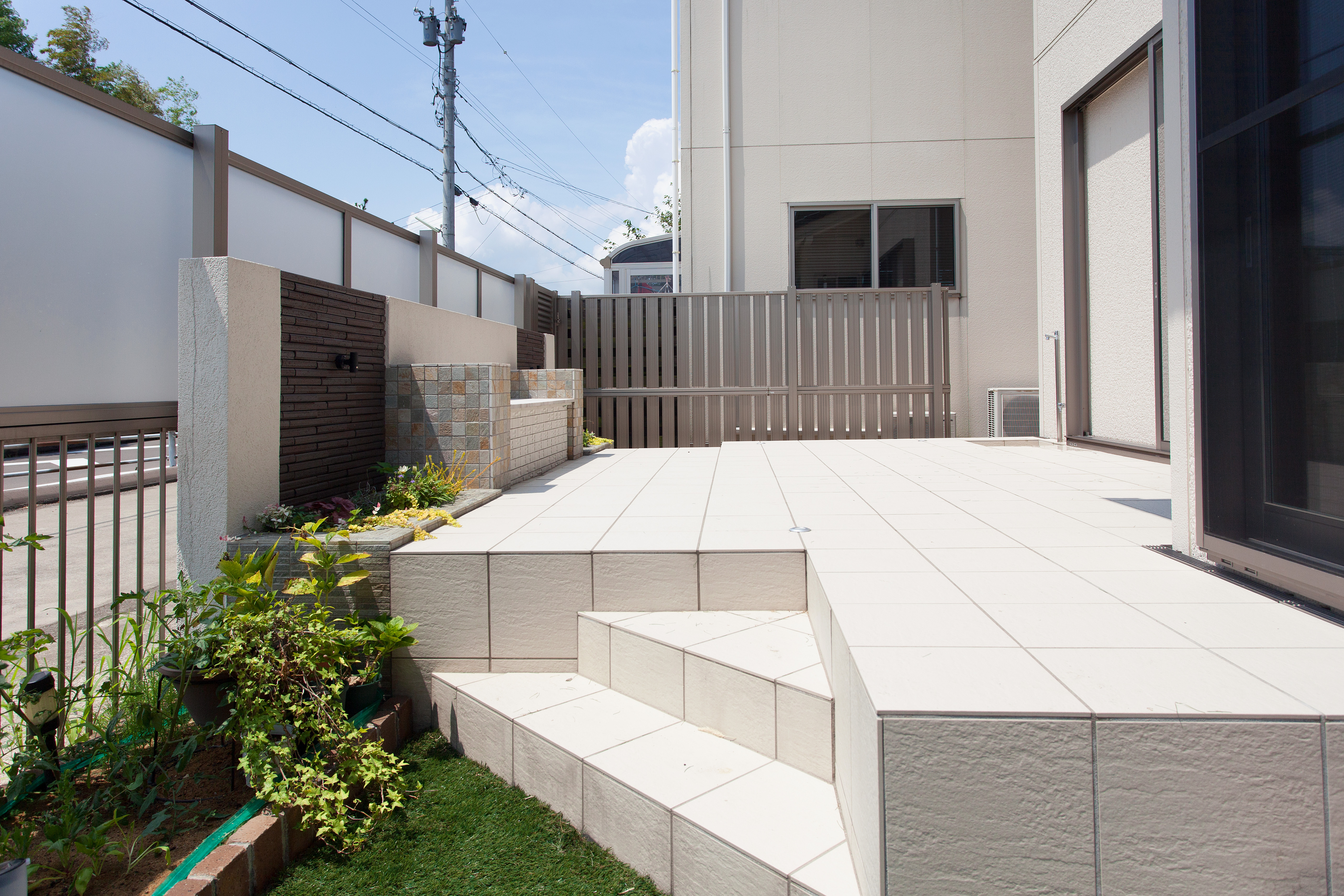 タイルテラス レンガ花壇 塗り壁 ベンチ