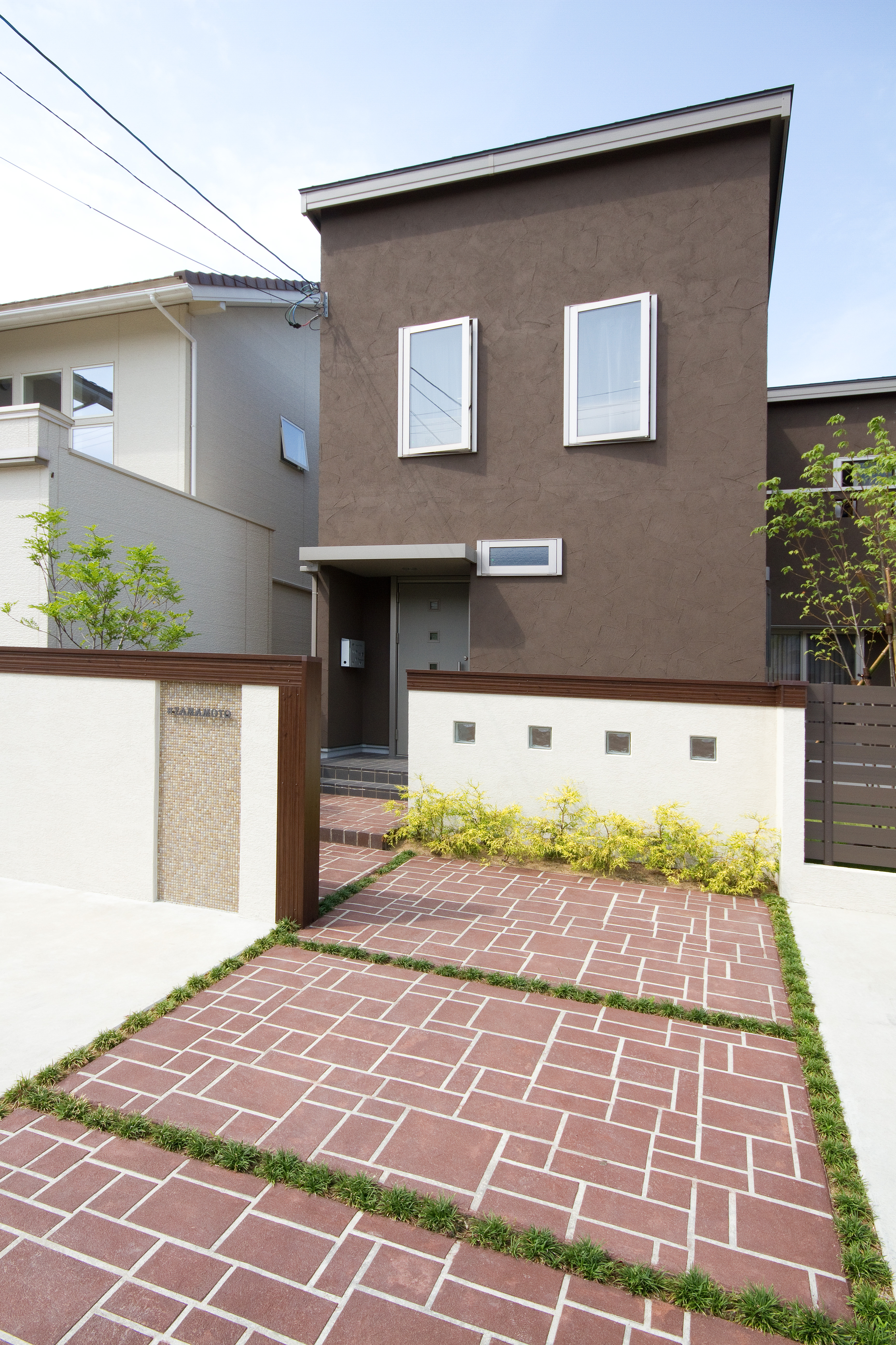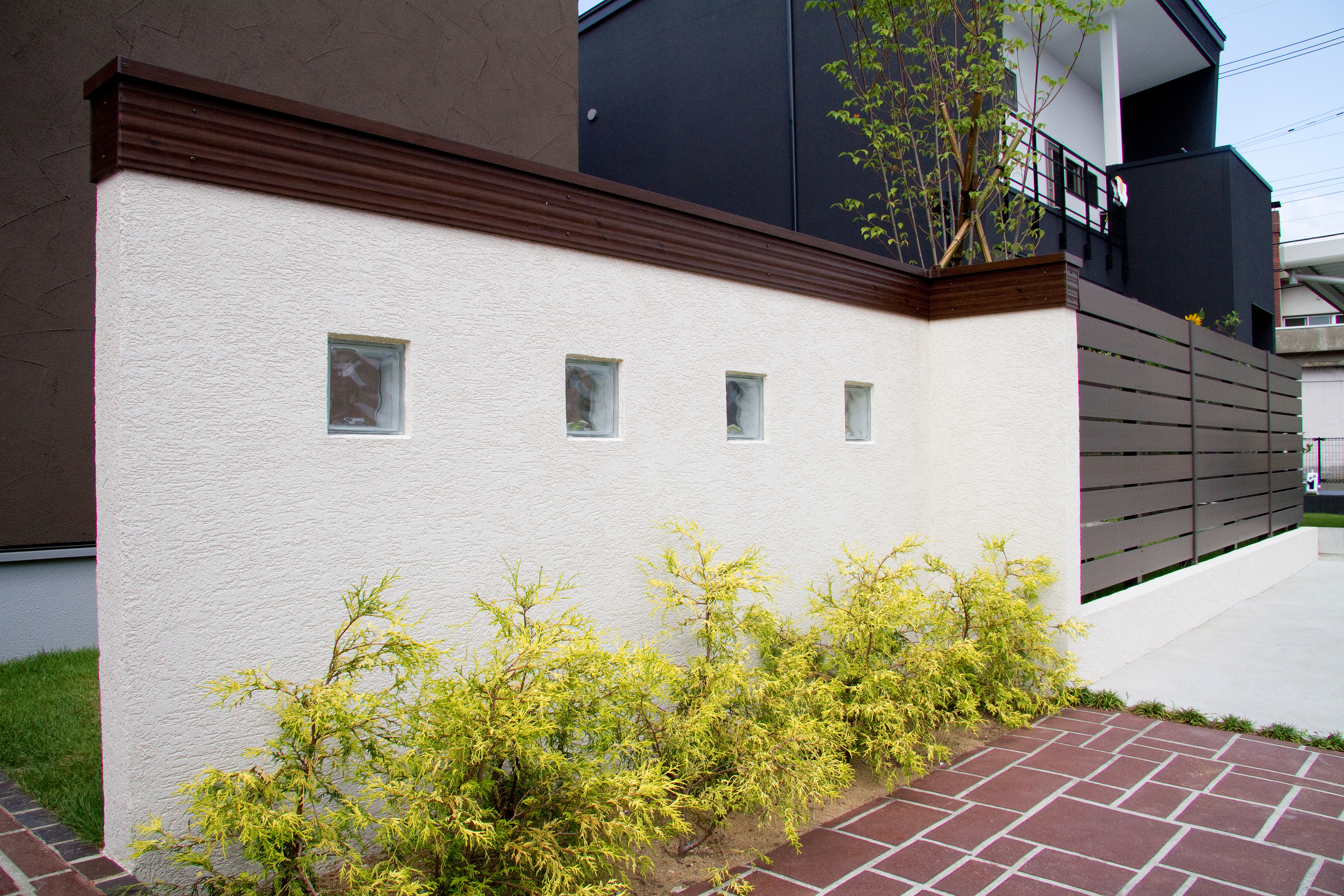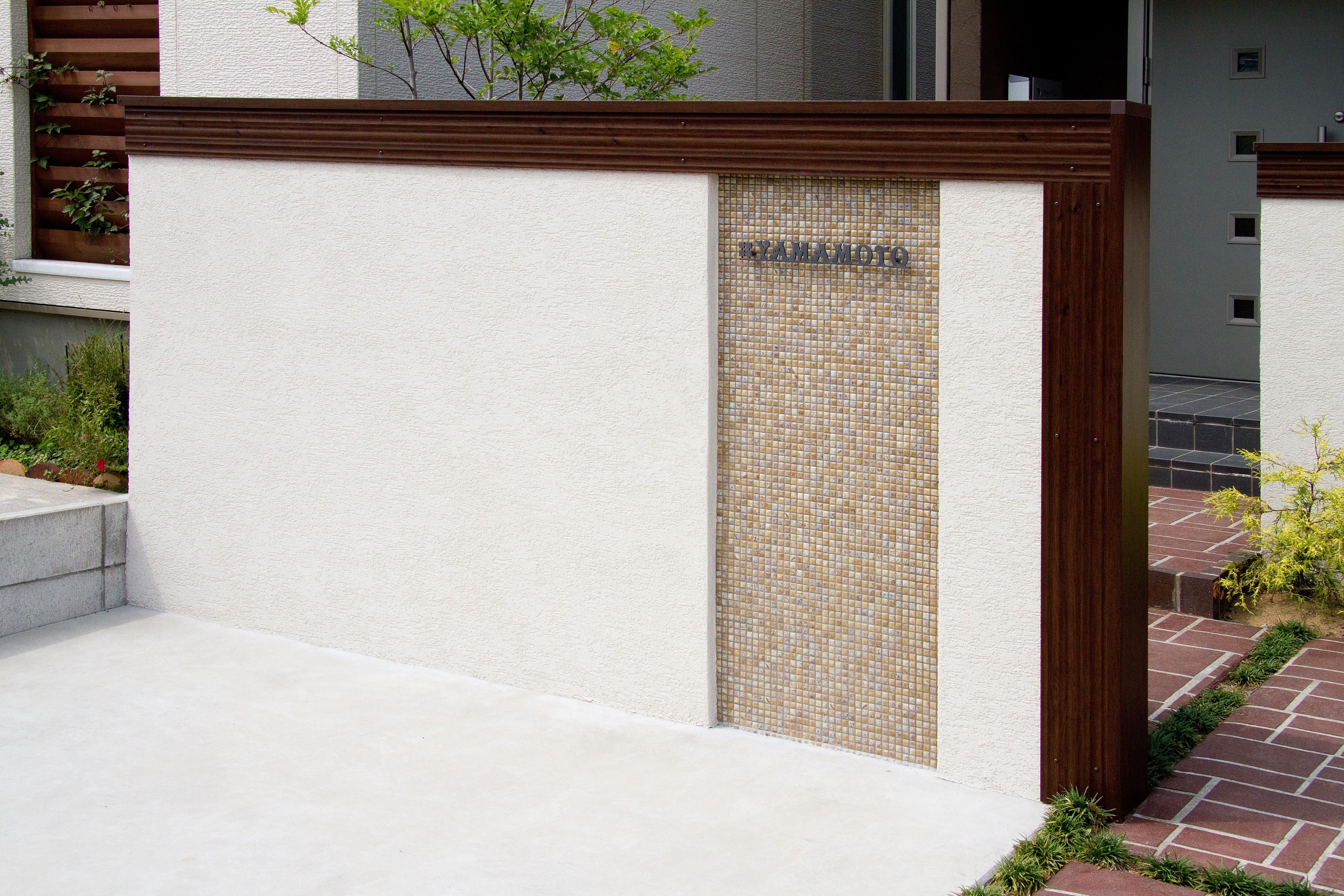 アシュラスレート 塗り壁 立水栓 アルミ笠木 ガラスブロック Bウッド モザイクタイル