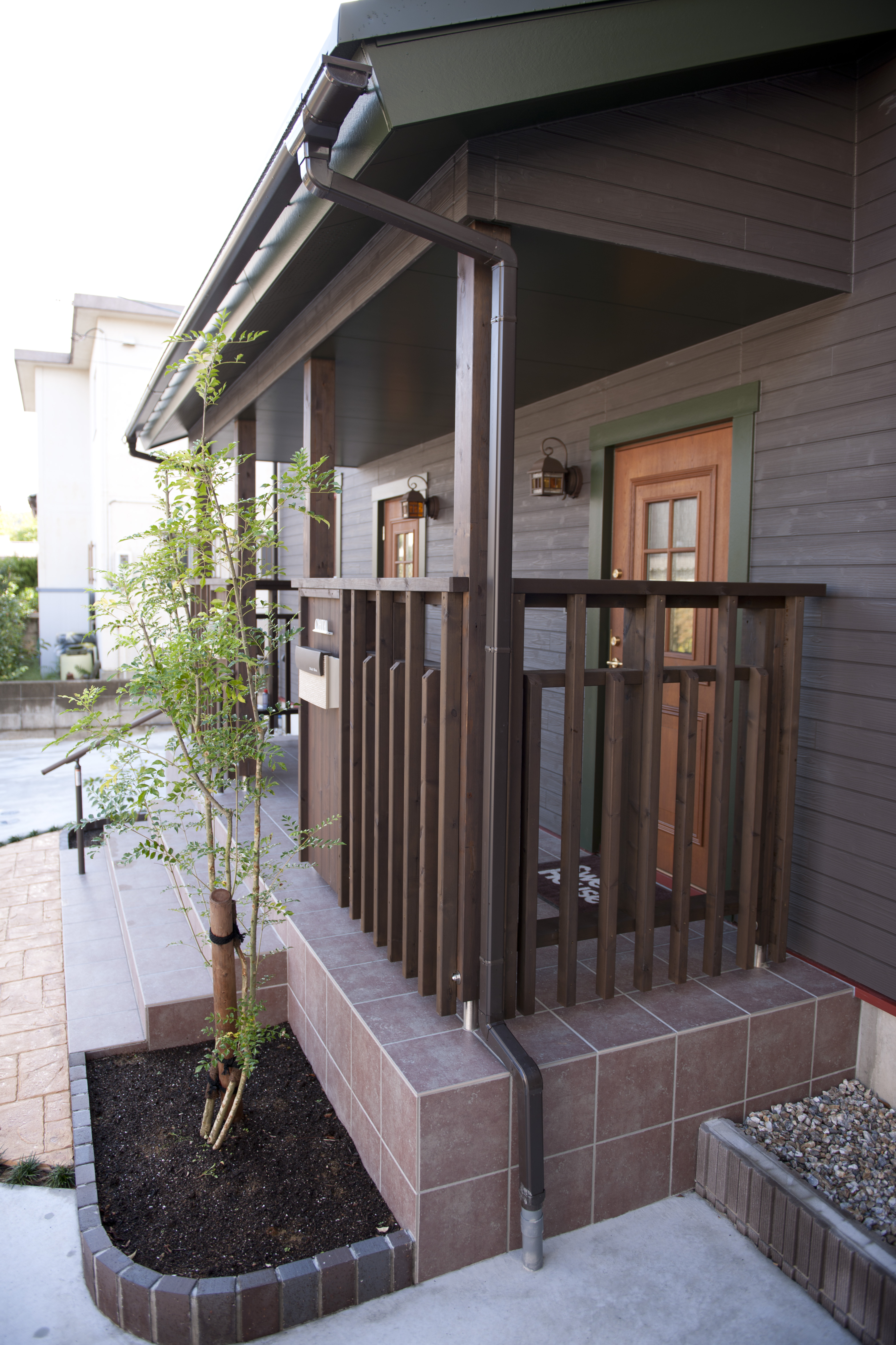 住宅メーカーさんと協同で施工した今回の外構は、茶色のモダンなデザイン外構でした。 2世帯の一軒家で玄関は2つ。 植栽のバランスやアプローチも対称的になる様バランス良く合わせた施工を施し、統一感があり落ち着きのあるエクステリアです。